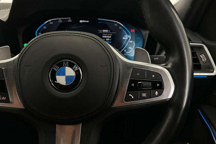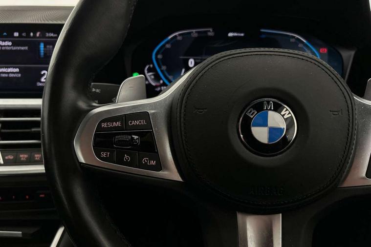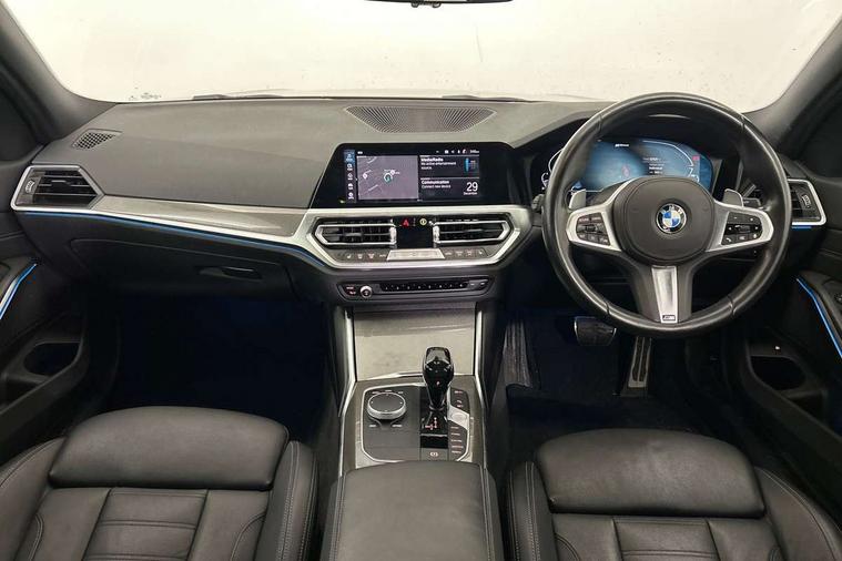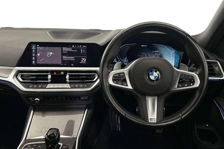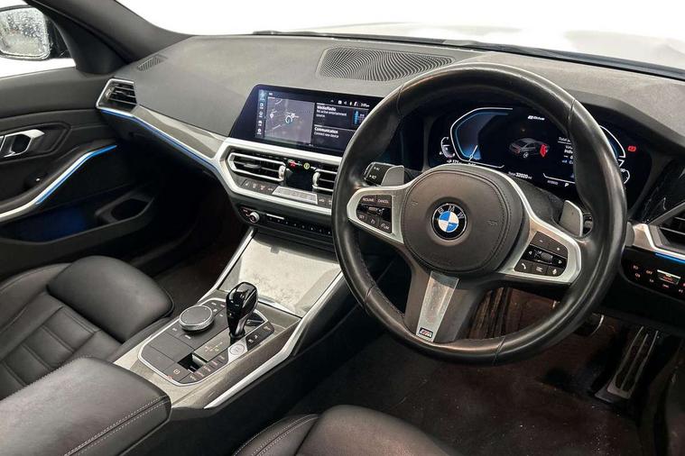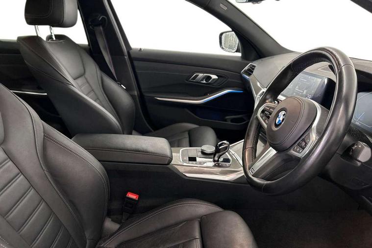 Active guard plus, Attentiveness assist, Auto start-stop, BMW iDrive controller on centre console, BMW Live Cockpit Professional Nav with 12.3" instrument display + 10.25" display, Intelligent Voice Assist, BMW OS 7, HDD, 2USB, 4G LTE connect, BMW service history, BMW Teleservices, Brake pad wear indicator in front and rear, Check Control warning system for monitoring of lights and door/luggage compartment open warning, Condition based service, Electric power steering with Servotronic steering optimised at all speed ranges, Instrument cluster with speedometer with mph readout, tachometer, fuel gauge and oil temperature gauge, Integrated owners handbook, Oil sensor for level and grade, warning by check control system, On board computer - average speed+fuel consumption, service interval, clock/date, odometer/trip meter, outside temperature display and ice warning, Optimum shift indicator, Personal Profile - automatic lock when driving away selectable, Variable sport steering, Adaptive M suspension, Balanced 50/50 weight distribution, Battery cut-out switch, Drive performance control - ECO PRO, comfort and sport modes, Petrol Particulate Filter, Sport automatic transmission with steering-wheel mounted gearshift paddles and launch control, Stroke dependent dampers, DAB tuner, Electronic service booklet, Acoustic glazing, Automatic headlight beam throw control with load dependent regulating reaction, dynamic compensation of braking dive and acceleration squat, Black mirror caps, Black roof mouldings, BMW Individual high gloss shadow line with extended contents, BMW individual lights shadow line, BMW Unique paint, Body colour door handles, Body colour fuel filler flap, Dynamic brake lights, Electric windows - front and rear, with open/close fingertip control, anti-trap facility and comfort closing, Exhaust tailpipe - split left and right, Exterior mirrors - electrically folding with anti-dazzle, Fading support, Front and rear bumper system with replaceable deformation elements, Front black door sill finishers with BMW designation, Green tinted heat protection glazing, High gloss shadow line exterior trim, Interior rear view electrochromatic mirror with automatic anti dazzle function, LED daytime running lights, LED front fog lights, Lightweight engineering, M designation on front side panels, left and right, M rear spoiler, Matt black exterior B pillar, Rain sensor with automatic headlight activation, Shark fin antenna, Sun protection glass, Two part LED tailights in L-shape with components in smoked glass, brake light, LED turn indicator and rear fog light, Visible VIN plate, Welcome lights in interior and door handle area, Windscreen wipers with integrated washing jets, xDrive designation on left tailgate, 12V power socket in front storage compartment, 2 front cupholder in centre console with clamping elements and matt black inlay, 3 rear seats with non folding headrests with 3 point seat belts, 3 zone automatic air conditioning, 4 pieces lashing eyelets in luggage compartment, 40:20:40 split folding rear seat with loading system, Ambient lighting with welcome carpet light, Anthracite headlining, Armrest integrated in front and rear door trim + front centre console armrest, Centred top Luggage compartment lights, Four grab handles integrated in roof lining, Front and rear door exit lighting (left / right), Front and rear door pockets, Front and rear reading lights, Front and rear velour floor mats, Front head restraints, Front sport seats, Heated driver and front passenger seats, Height adjustable mechanically and infinitely variable steering column, Illuminated armrest storage compartment, Illuminated glove compartment with separate small compartment, Interior lighting - front centre over interior mirror with soft light, rear centre and front and rear footwell lighting, M Sport multifunction leather steering wheel, Make-up mirror lights, Rear centre armrest with 2 cupholders, Rear centre console with storage compartment and ventilation grille, Sunvisors with vanity mirrors and ticket pocket, Toolkit located in luggage compartment, Connected pack professional - 3 Series Saloon/Touring, M Aerodynamics pack - 3 Series Saloon/Touring, 2 tone horn, BMW emergency call, Brake energy regeneration, Braking pre-tensioning, Child proof locking system in rear door, Child seat ISOFIX attachment rear outer seats, Coasting in idle in ECO PRO mode, Crash sensor activating of airbags, Unlocking doors, hazard warning lights, interior light, safety battery terminal, Driver and front passenger side airbags, integrated in the door side seat backrest bolsters for all seat variants, Driver/Front Passenger airbags, Dry braking, Dynamic brake control, Dynamic stability control + (DSC+) - Anti-lock Braking System (ABS) with brake assist and cornering brake control + Automatic Stability Control (ASC), Dynamic Traction Control - DTC, Electric parking brake including automatic hold function and automatic release of the parking brake when driving off, Electronic differential lock control (EDLC), Front passenger manual airbag deactivation, Head airbags for all 4 outer seats, Hill start assist, M sport seatbelt, Seat belt security check for driver and front passenger, Side impact protection, Three 3 point seat belts on all seats including front belt stopper, pyrotechnic belt tensioners and belt force limiters, Tyre pressure monitoring with three level warning strategy, Ventilated front and rear disc brakes, Warning triangle and first aid kit, Alarm system (Thatcham 1) with remote control and electronic engine immobiliser, Central locking switch for all doors, fuel filler cap and luggage compartment, Remote control with integrated key one button open/close vehicle and windows, sole opening of the luggage compartment lid and panic mode, Start/stop button with Comfort Go keyless engine start and auto Start/stop deactivation button, Vehicle key with M specific designation, Reduced rolling resistance tyres,