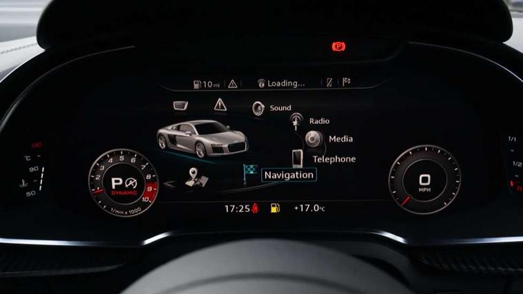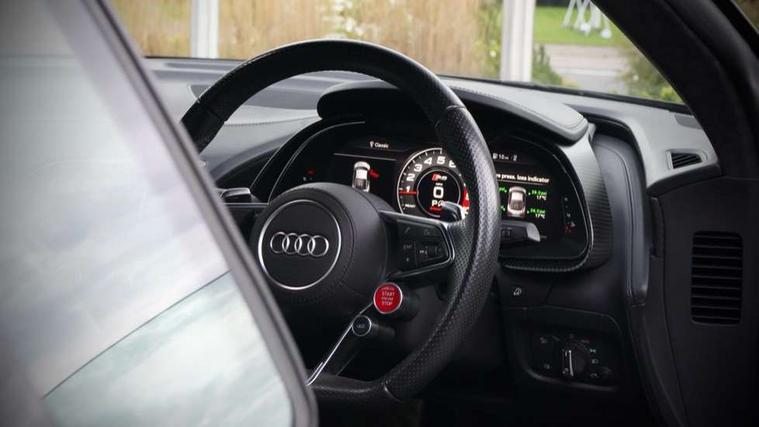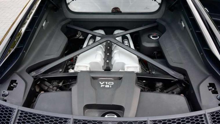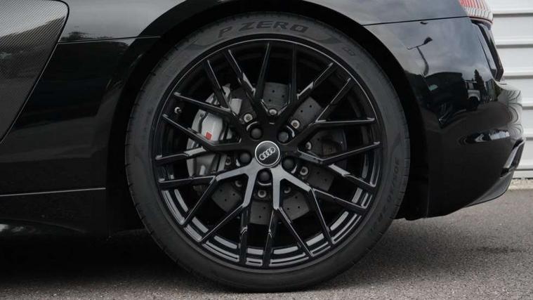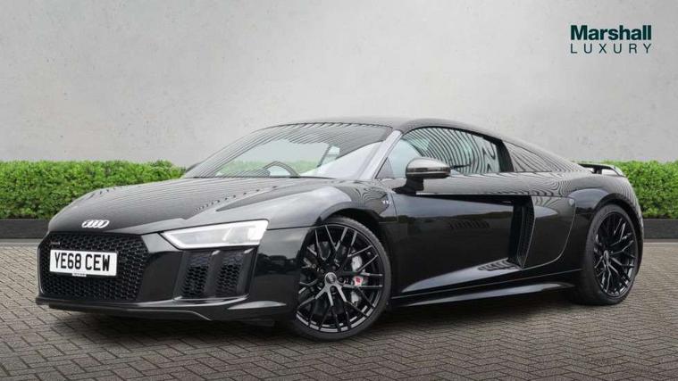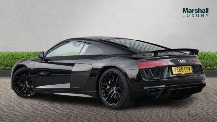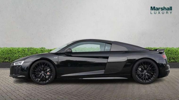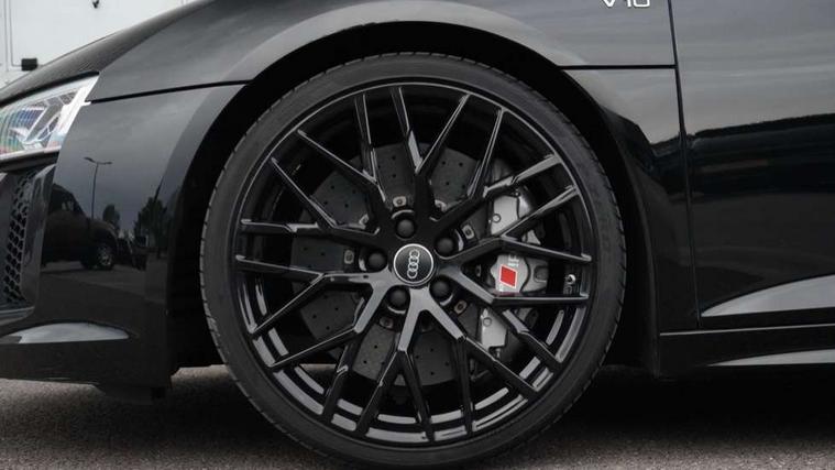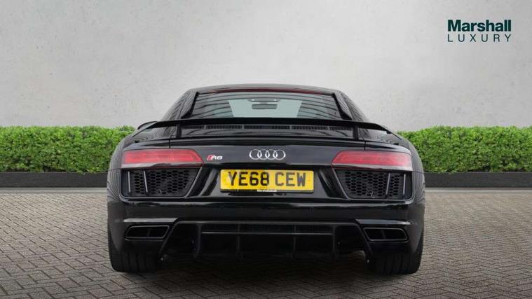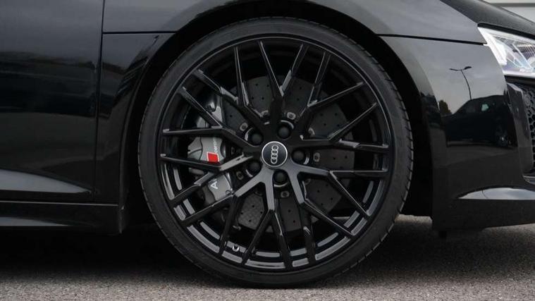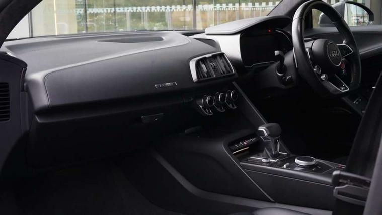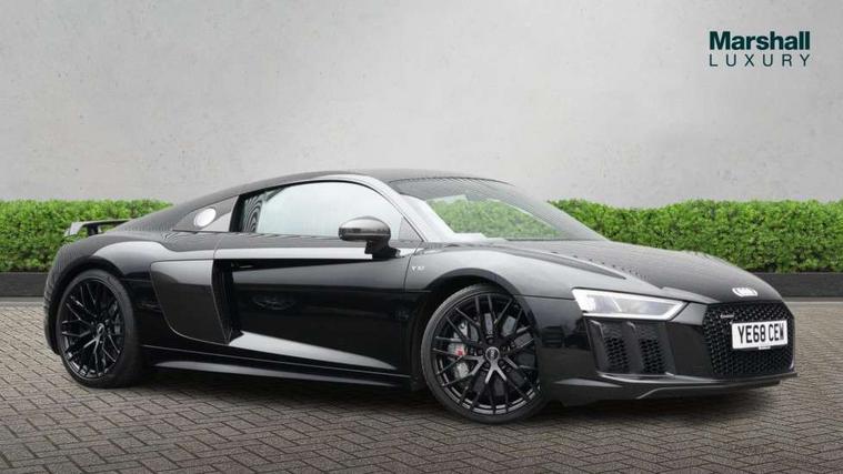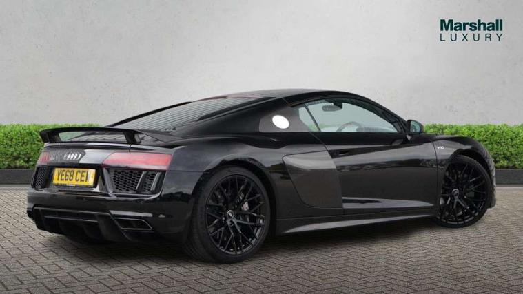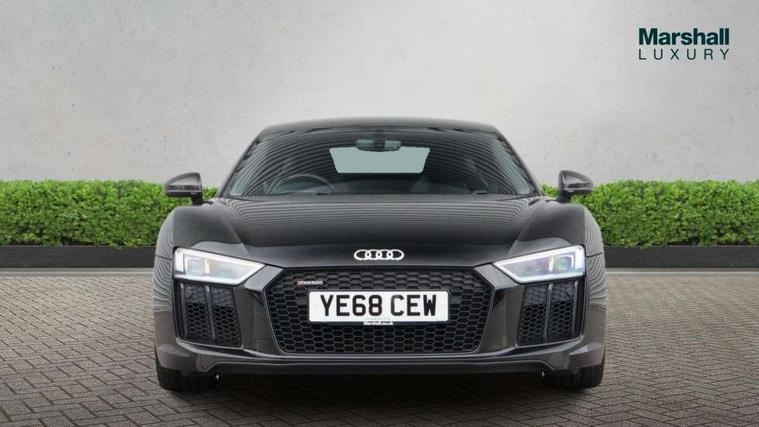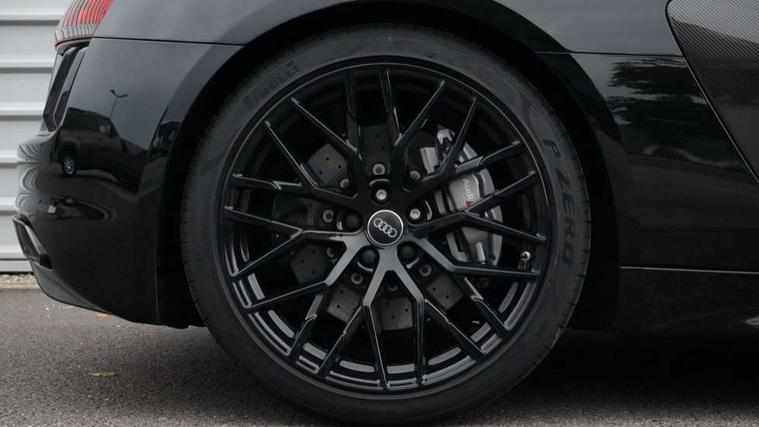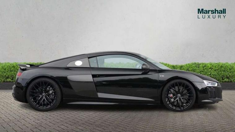 Audi connect, Audi drive select with performance mode, Audi parking system plus with front and rear sensors, Audi virtual cockpit - 12.3" high-resolution LCD display with fully customisable instrument cluster, Bluetooth connectivity with voice control, Cruise control + speed limiter, Driver's information system, MMI navigation plus with DVD, SD card reader, 10GB music storage, MMI touch panel, Service interval indicator, V10 Plus sports suspension, 2 USB ports, Audi music interface, Auxiliary input socket, DAB Digital radio, Air inlet in Anthracite gloss black, Aluminium fuel cap, Audi Beam uses LEDs to project the Audi Sport logo, Auto dimming rear view mirror with light and rain sensors, Body colour bumpers, Electric front windows, Electrically adjustable and heated door mirrors, Folding door mirrors, Gloss anthracite black air outlets, Gloss Carbon rear spoiler, Green tinted glass, Heat insulating glass, Heated rear window, Laminated windscreen, LED daytime running lights, 3 spoke flat bottomed multifunction performance leather steering wheel with 4 operating satellites, Adjustable steering column, Aluminium gear selector, Aluminium gear shift paddles, Ambient lighting, Deluxe climate control, Driver and passenger footwell lighting, Electric front seat height adjustment, Engine Compartment Light, Illuminated door pockets, Illuminated glovebox, Integrated front head restraints, Interior light with delay, Luggage compartment lighting, Reading lights, Stainless steel pedals and foot rest, ABS/EBD, ASR, Ceramic brakes, Curtain Airbag, Driver/front passenger airbag, EDL traction control, ESP, Front passenger airbag deactivation, Front side airbags, Gloss anthracite brake calipers, Hill hold control, Tyre pressure monitoring system, Warning triangle and first aid kit, Advanced key, Anti theft system, Electronic immobiliser, Locking wheel bolts, Preparation for tracking system, Remote central locking, Valet parking key, Extended inlays in matt Carbon surrounded for Audi virtual cockpit and air vents, Matt carbon inlay, Tyre repair kit,