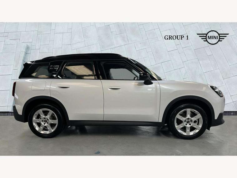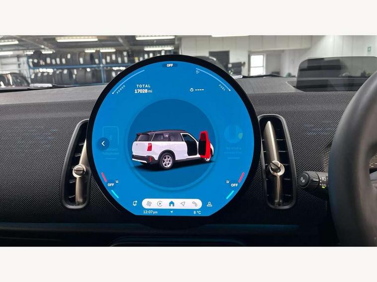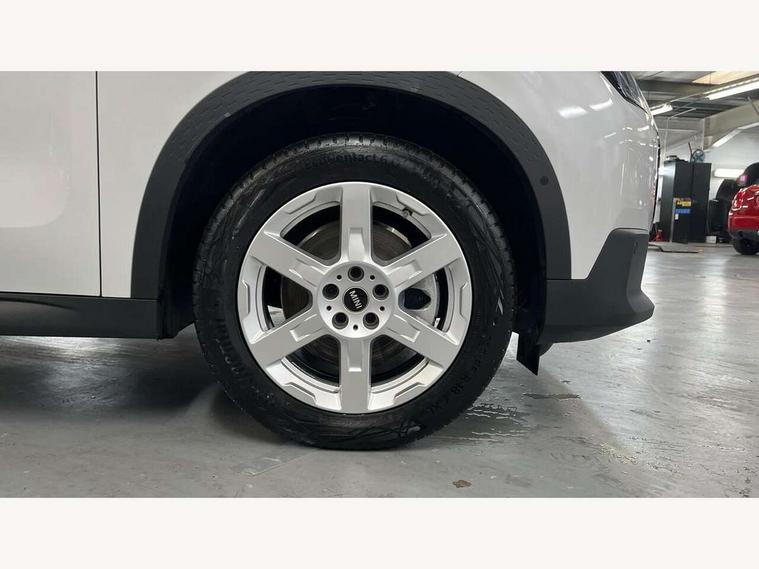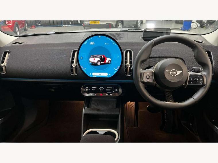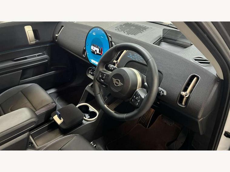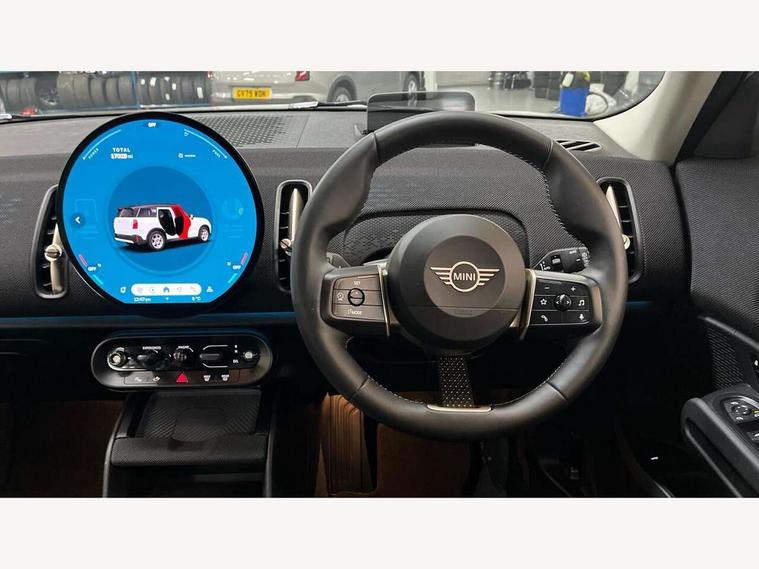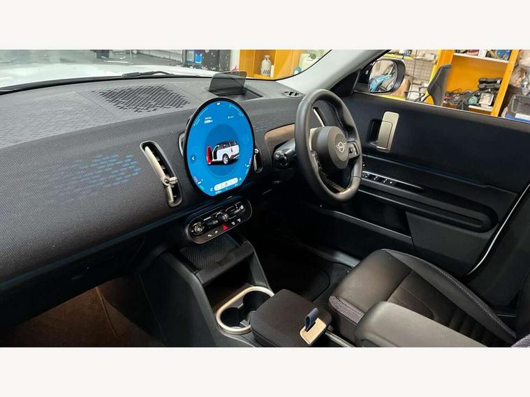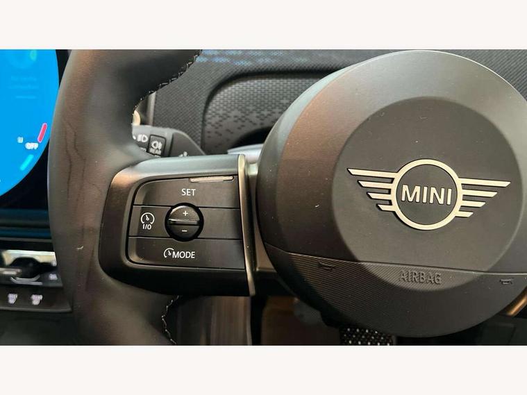Bluetooth connection, Circular OLED Screen, Compatible mobile phone bluetooth with audio streaming, Cruise Control (DCC), Digital dashboard display, Driving assistant, E-call, Electro-mechanical speed dependant steering assistance, MINI Experience Modes, Mini navigation system, MINI TeleServices, Parking assistant in camera and ultrasound based assistance system, rear view camera, parking aid and distance control, Auto transmission with Paddles, Larger capacity fuel tank, 6 speakers, DAB Digital radio, Personal eSim, Auto tailgate, Electric adjustable heated door mirrors, Front and rear electric windows, Heated rear window, LED daytime running lights, LED Headlights, LED rear lights, LED third brake light, Rain sensor with auto headlights, Rear side wing doors, Rear window wiper, Roof rails, 3 seat bench in 2nd row, 60/40 split rear bench seat, Auto air conditioning, Floor mats, Front armrest, Front headrests, Heated steering wheel, Height and length steering column adjustment, Light headliner, Rear headrests, Single front passenger seat, Sport Vescin Steering Wheel, Sunvisors with vanity mirrors, Vescin/Cloth upholstery, 3x3 point rear seat belts, 6 Airbags - front, side, head and seat belt tensioners, ABS, DSC - Dynamic Stability Control, Electronic handbrake, Electronic Stability Programme (ESP), Front ISOFIX (iSize), Hill hold assist, Hill start assist, Manual rear child locks, Traction control, Tyre pressure monitoring system, Warning triangle, Alarm system with tilt sensor, monitoring doors, bonnet interior and tailgate, Auto drive away locking, Deadlocking function, Electronic vehicle immobiliser, Locking wheel bolts, Remote control locking, Start/stop toggle with keyless go, Black/Blue dashboard knit, MINI Mobility Kit,