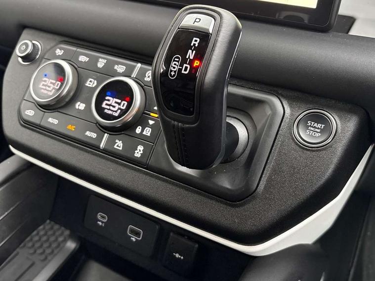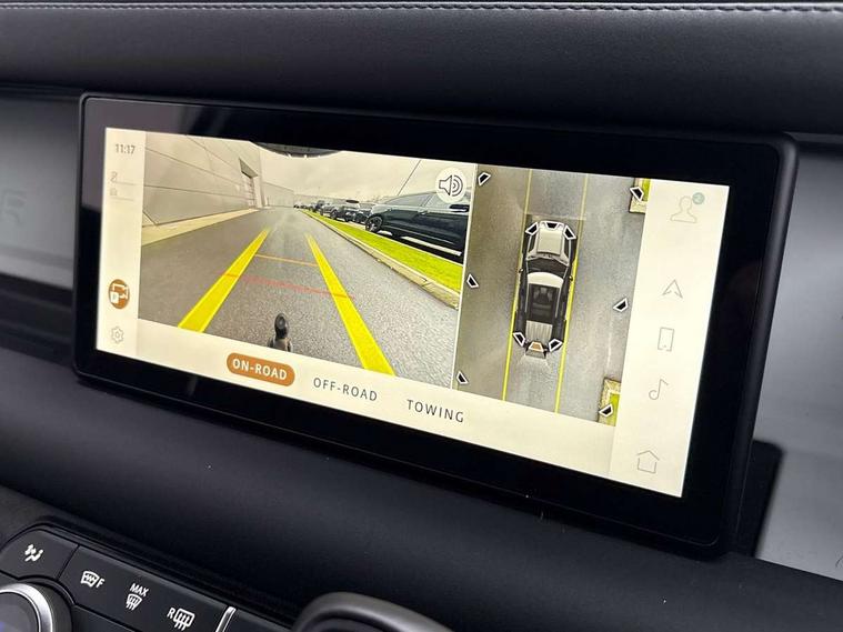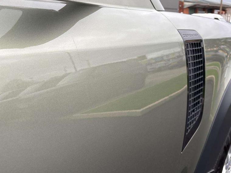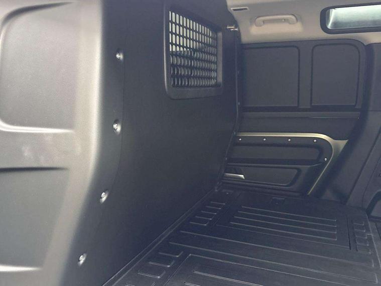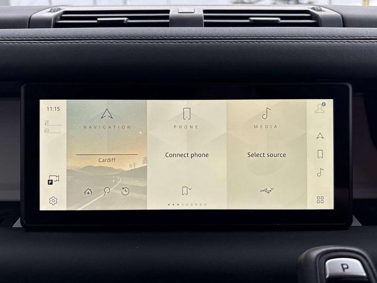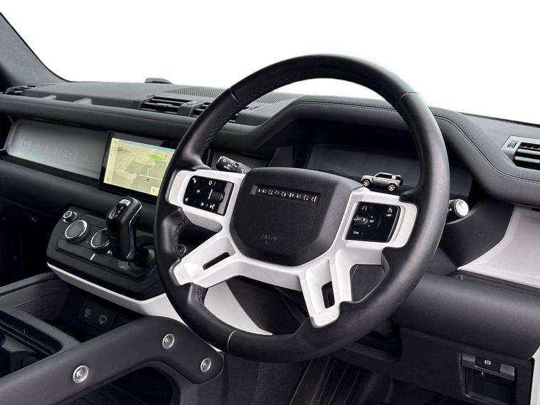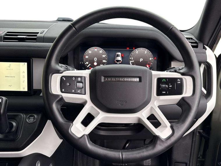 Customer Configurable Autolock, 360 parking aid, 3D Surround Camera with 360 View, 180 Rear View, Front Traffic Detection, Forward Vehicle Guidance, Tow Hitch Assist and clear sight Ground View, Blind spot assist, Brake Hold, Driver condition monitor, Electric power assisted steering (EPAS), Lane keep assist, Low traction launch, Pivi pro connected, Rear traffic monitor, Traffic sign recognition adaptive speed limiter, Trip computer, Tyre pressure monitor, Wade Sensing, Android Auto, Apple CarPlay, DAB Radio (Digital Audio Broadcasting), Alpine lights, Assisted tailgate, Auto High Beam Assist, Automatic headlight levelling, Automatic headlights and rain sensitive front wipers, Centre high mounted stop light, ClearSight interior rear view mirror, Electric heated/power fold door mirrors with approach lights and auto dimming driver side, Electric windows with one touch open/close and anti-trap, Exterior signage panel, Follow me home lighting, Front fog lights, Heated rear window with timer, Heated windscreen, LED tail light, Privacy glass, Puddle lights, Rear fog lights, Rear wash wiper, Side-hinged tailgate, Standard roof, Standard tread plates, Additional lashing points, Dual zone climate control, Durable rubber cabin flooring, Footwell lights, Front passenger seat ISOFIX points, Full height bulkhead behind row 1 seats, Glovebox storage, High sided rubber mats, Loadspace cover, Loadspace hooks, Loadspace rubber mat, Lockable and illuminated underfloor storage compartment (x1 under boot floor and x1 accessible via rear doors), Manual adjustable steering column, Overhead stowage for sunglasses, Rear centre headrest, Rear reading light, Signature graphic, Standard interior, Standard seating configuration, Sunvisors with illuminated vanity mirrors, Upgraded loadspace LED lighting, Online pack - Defender with data plan, Brake pad wear indicator, Electronic traction control, Emergency braking, Front airbags, with passenger seat occupant detector, Power operated child locks, Remote for (e-Call, Optimised assistance call, InControl app, Climate, beep and flash and door), Seat belt reminder, Intrusion sensor, Keyless entry system, Locking wheel nuts, 8 speed automatic transmission, ABS and EBA, All wheel drive, CBC - (Cornering brake control), Dynamic stability control, Electronic brake force distribution, Electronic park brake, Gradient acceleration control, Hill Descent Control, Hill start assist, Particulate filter (DPF), Push button start, Roll stability control, Trailer stability assist, Twin speed transfer box (high/low range),