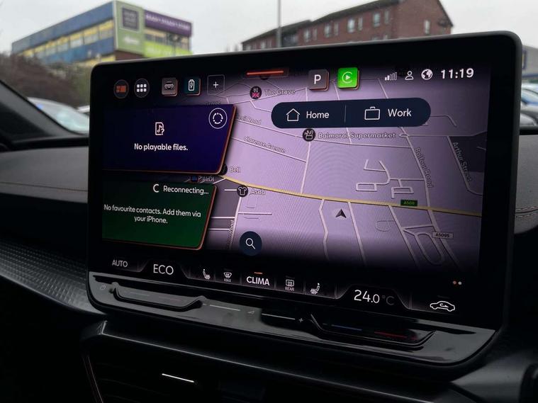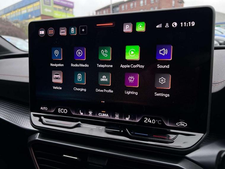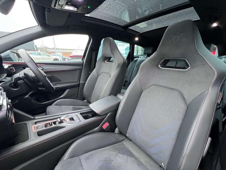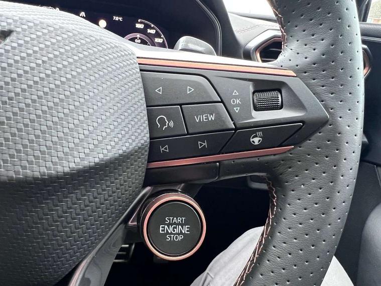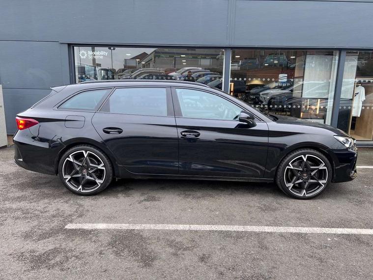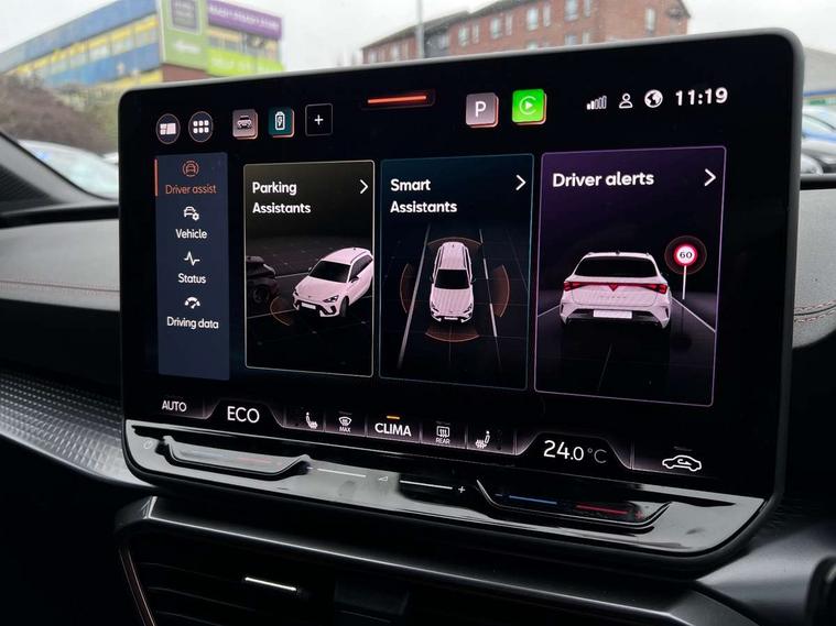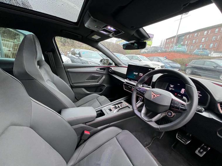 Adaptive cruise control with follow-to-stop and speed limiter, CUPRA drive profile selection with (Comfort/Sport/Individual), throttle response and gearshift mode, Digital cockpit, Dynamic road sign display, E-call, Four x USB Type C ports (2 in front and 2 in rear), Front and rear parking sensors, Front assist with forward collision warning braking reaction to vehicles, pedestrians and cyclists, Full link smartphone integration with Mirror Link, wireless Apple CarPlay and wired Google Android Auto, Lane assist, Lockable tailgate, Rear view camera, RPM, trip computer, outside temp gauge, instrument light brightness, low fuel warning light, lights on reminder, gearshift indicator, Service interval indicator, Start/stop system with regenerative braking, Virtual pedal with electric tailgate, Wireless phone charger, 10 amp mode 2 charging cable, 16 amp mode 3 charging cable, Auxiliary input socket, Auto dimming rear view mirror, Body colour door handles, Body coloured bumpers, Cupra sports bumpers, Dark tinted rear windows, Electric front/rear windows, Electrically adjustable, heated and folding door mirrors, Gloss black roof rails, High beam assist, LED front fog lamps with cornering function, LED rear fog lamp, Matrix LED Headlights with variable light distribution, Matrix Beam and Dynamic headlight range control, Rain sensing wipers, Rear side wing doors, Rear wash/wipe, Separate daytime running light with automatic headlight control and coming home feature, Third brake light, Welcome light with logo projector in door mirrors, 12v power supply in centre console, 3 seat bench in 2nd row, 5 headrests, 60/40 split rear bench seat with armrest, Ambient lighting (glovebox, footwell, ambient lighting multicoloured), Black headlining, Cupra sports pedals, CUPRA Supersports, heated steering wheel with satellite buttons, Dinamica cloth upholstery, Electrically adjustable driver seat and lumbar support with memory function + manually adjustable passenger seat, Front and rear reading lights X 4, Front centre armrest, Heated front seats, Height/reach adjust steering wheel, Illuminated interior front door sills, Interior wraparound lighting, ISOFIX points in outer rear seats with top tether anchorage points, Single front passenger seat, Sliding boot cover, Storage pockets on rear of front seats, Sunvisors with illuminated mirror, Three zone climate control, Tool kit, Dynamic and comfort pack - Leon Cupra, Media system plus with 12.9" display + navigation pack - Leon Cupra, 3 point seatbelts on all rear seats, ABS, Brake control system - ESC and brake booster, Child proof door locks, Cupra black brake calipers, Driver and front passenger airbags with front passenger airbag de-activation, front side and curtain airbags, Electronic parking brake, Hill hold control, Rear disc brakes, Seat belt reminder for front and rear seats, Tiredness recognition system, Tyre pressure monitoring system, Anti theft alarm system with interior monitoring in cab, backup horn and towing protection, KESSY Advanced - Keyless start, keyless entry, Locking wheel bolts, Chrome and copper interior detailing, 19" Polar machined sport black and silver alloy wheel with 91Y tyres,