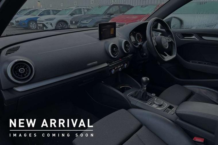 Audi drive select, Audi smartphone interface, Automatic start/stop system, Colour driver's information system display, Electro - mechanical power assisted steering, Mobile telephone preparation - bluetooth interface, SD card based MMI navigation, Service interval indicator, Speed limit display, Voice control system, Voice recognition for navigation system, Sports suspension, 2 USB interfaces and Aux-In jack, Audi music interface, CD player, DAB Digital radio, MMI radio plus with 7" colour MMI screen and MMI controller, Online entertainment, Auto dimming interior rear view mirror, Body colour roof spoiler with aerodynamic inserts in high gloss black, Chrome exhaust tailpipes, Electric front windows, Electric rear windows, Electrically adjustable and heated door mirrors with integrated LED side indicators, Heated windscreen washer jets, LED daytime running lights, Light and rain sensors, Privacy glass - dark tinted rear and rear side windows from B-pillar backwards, Rear wiper, Sport specific side air inlet grille and diffuser insert, 3 adjustable rear headrests, 3 spoke flat bottomed multi-function leather sport steering wheel, 60/40 split folding rear seat, Adjustable front centre armrest, Black cloth headlining, Dual zone electronic climate control, Front and rear interior lights with delay, Front/rear floor mats, Height and reach adjustable steering wheel, Illuminated door sill trims with S logo, Isofix child seat preparation for front passenger/outer rear seats inc passenger airbag deactivation including top tether, Lashing point in luggage compartment, Manual height adjustable front seats, Stainless steel pedals, Storage compartments in doors side trims, centre console and under front drivers seat, Tool kit, Black styling pack - A3/S3, LED interior light pack - A3/RS3, Non smoking pack - A3, Storage and luggage pack - A3/RS3, 3 point seatbelts on all seats, ABS/EBD, Active bonnet, Active front headrests, Airbags - front driver/passenger, front & rear side, curtain, drivers knee, ASR, EDL, Electromechanical parking brake, ESC - Electronic Stability Control + traction control, Front passenger airbag deactivation, Hill hold assist, Manual rear child locks, Multi-Collision braking, Seatbelt warning, Tyre pressure warning, Warning triangle and first aid kit, Anti theft alarm, Anti-theft wheel bolts, Remote control central locking, Thatcham category 1 alarm + immobiliser, Aluminium air vent surrounds, Aluminium trim elements, Matt brushed aluminium inlays, 18" 10 spoke design alloy wheels in matt titanium look with diamond cut finish, Tyre repair kit,