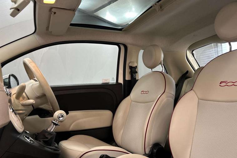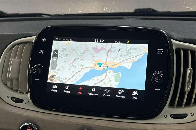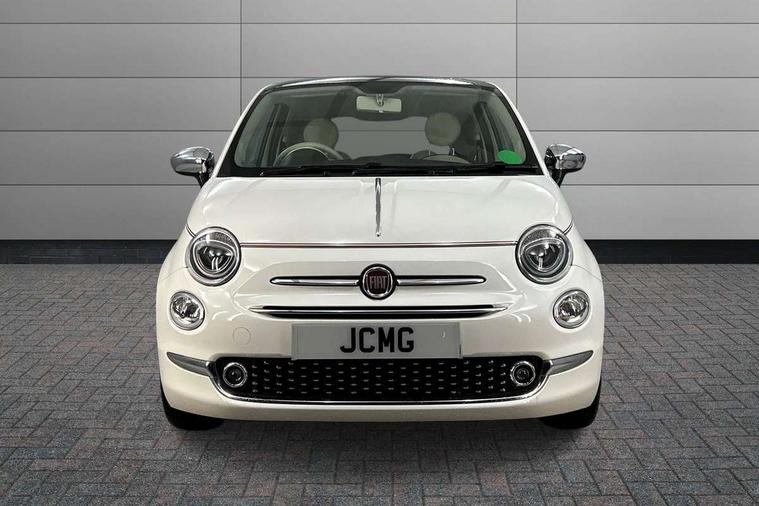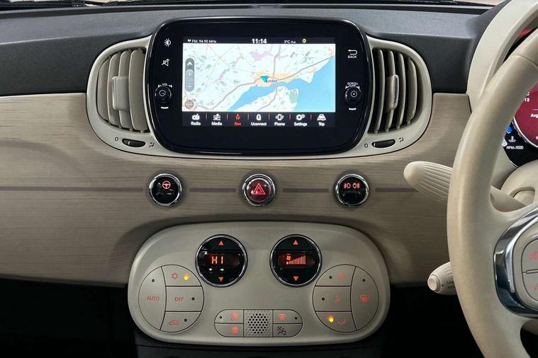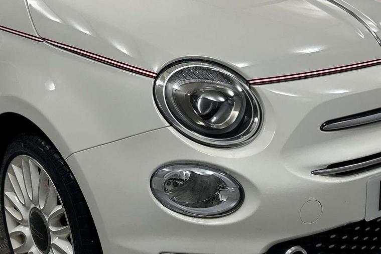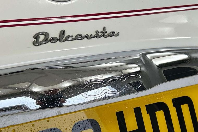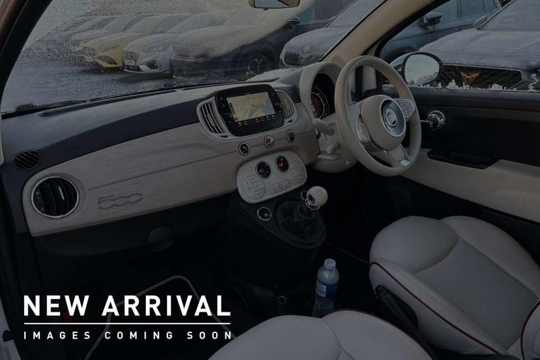 7" HD Touchscreen Radio with 3D Navigation, Bluetooth, USB, and DAB, 7" TFT instrument cluster, Apple car play/Android Auto, Cruise control, Dualdrive PAS, External temperature gauge, Rear parking sensor, Speed limiter, Stop/start system, Trip computer, Rear speakers, Body colour bumpers, Body colour side rubbing strips with 500 logo, Chrome finished door mirror covers, Chrome plated exterior door handles, Chrome trim on bonnet, Dolcevita badge on tailgate, Electric front windows, Electrically adjustable painted door mirrors with defrosting / external temperature sensor, Fixed glass sunroof with sunblind, Front fog lights, Heat insulated glass, Heated rear windows with wash wipe, LED daytime running lights, Pastel paint, 1 passenger grab handle, 50/50 split folding rear seats with height adjustable rear headrests, Auto climate control, Auxilliary 12V power socket, Driver's seat memory, Front headrests, Front passenger seat memory, Height adjustable drivers seat, Height adjustable steering wheel, Isofix child seat preparation, Leather gear knob, Techno leather steering wheel with audio controls, Techno leather upholstery, Unique all around liner in Red/White/Red, Unique floor mats with white borders, Chrome pack - 500, 7 airbags - Driver, passenger, side, window and drivers knee airbags, ABS/EBD, Curtain airbags, ESC + ASR/MSR + HBA + Hill holder, Traction control, Tyre pressure monitoring system, Automatic door locking, Immobiliser, Locking fuel filler cap, Remote central locking, Unique wooden dashboard, 16" alloy wheels with white finish, Fix and go puncture repair kit,