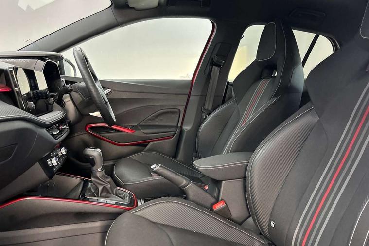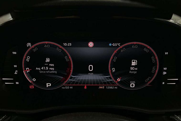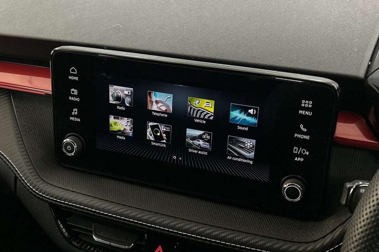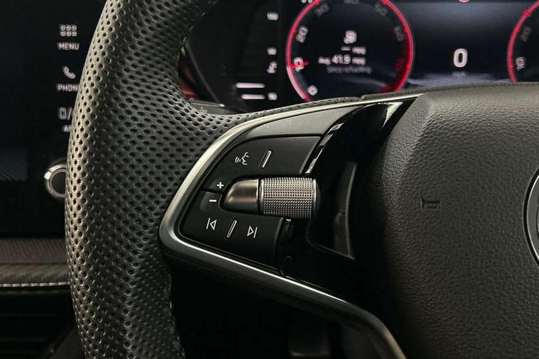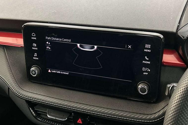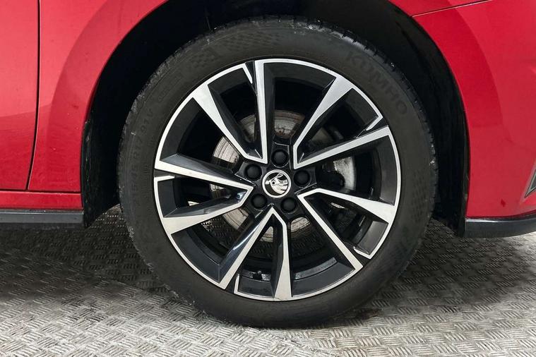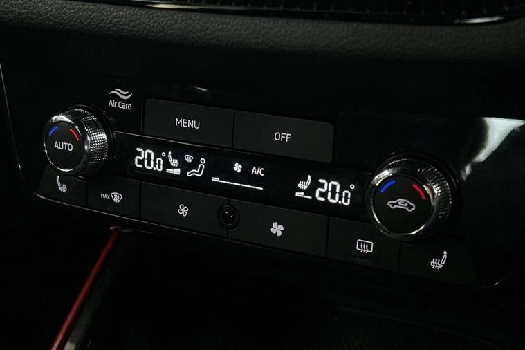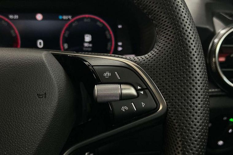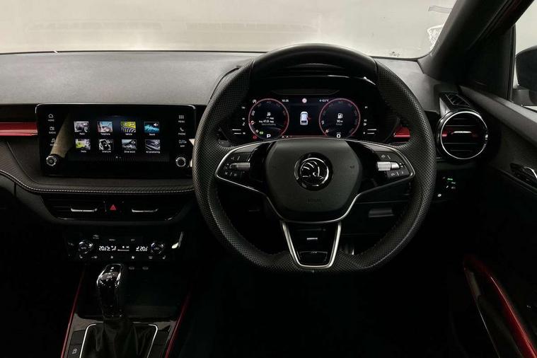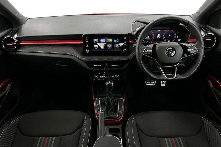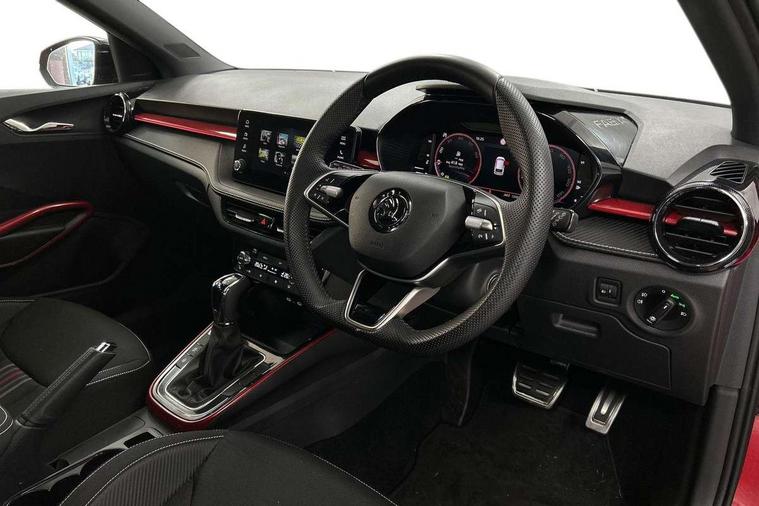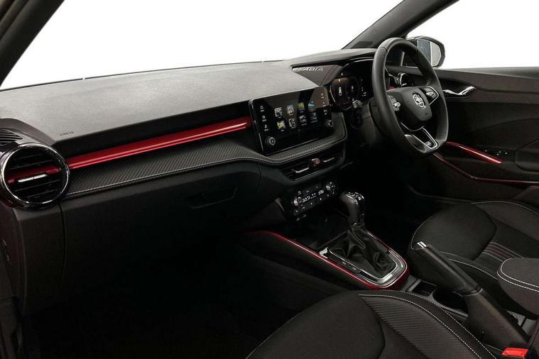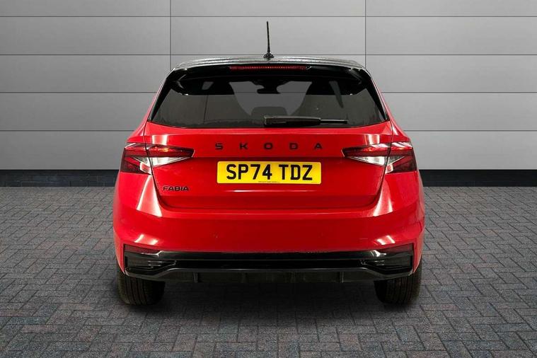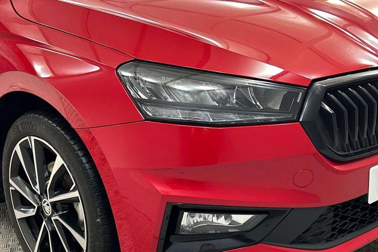 Advanced driver attention and drowsiness monitor, Bluetooth connection, Electromechanical power steering, Exterior temperature gauge, Service interval indicator, Traffic sign recognition, Virtual cockpit with 10.25" colour display, Wireless SmartLink for Apple CarPlay and Android Auto, 6 Speakers (4 in front and 2 in rear), Auxiliary socket for external MP3 player, DAB digital radio reception, Auto dimming rear view mirror, Black radiator grille, Body coloured bumpers, Door mirror integrated indicators, Front and rear electric windows, Front window wiper intermittent control, Headlight range control - Automatic, Ice scraper in fuel cap, LED daytime running lights with coming and leaving home feature, LED rear lights, Monte Carlo badging, Privacy glass, Rear LED fog light, Rear side wing doors, Rear window wiper with washing nozzles, Roof mounted spoiler, SKODA tailgate lettering in black, Sports bumpers, Third brake light, 2 reading lights in front and 2 reading lights in rear, 3 rear headrests, Aluminium pedals, Backrest split and folding, Black headlining, Central console with removable cup holder and storage box, Chrome handbrake release button, Door sills with fabia badging, Dual zone air conditioning with climatronic electronic control, Fabric/artificial leather upholstery, Front centre armrest, Front sports seats, Gearshift knob/handle in leather, Hand brake lever handle in leather, Height adjustable front headrests, Height adjustable front seats, Height adjustable steering wheel, ISOFIX and TopTether anchorage points to the outer rear seats, ISOFIX and TopTether on the front passenger seat, Luggage compartment lighting, Manually adjustable lumbar support in front seats, Metallic painted red central console cover, Metallic red interior door handles, Pollen filter, Rear seat bench unsplit, Single front passenger seat, Sun visors with mirror and airbag label on passenger side, Textile floor mats, Ticket holder, Umbrella in drivers door, 3-point height adjustable front seats belts with pretensioner and force limiter, Automatic warning lights in case of crash, Driver and passengers airbag with switch off function, e-Call+, ESC including ABS, MSR, ASR, EDS, HBA and XDS, Front and rear seat belt warning, FRONT ASSIST (AEB City and AEB Inter Urban), Front side airbags, Head airbags, Hill hold control, One tone horn, Pedestrian protection, Three rear 3-points safety seat belts with pretensioner and force limiter including stop function for outer rear seat belts, Tyre pressure monitoring system, Anti-theft alarm system including immobiliser, interior monitoring, backup horn, and towing protection, Central locking with radio remote control, interior controls, SAFE function and 2 foldable keys, Carbon effect door and side trim panels, Carbon effect lower decorative trim with white stitching, Monte carlo air vents, Red metallic upper decorative trim, Anti-theft wheel bolts protection, Super-low rolling resistance tyres,