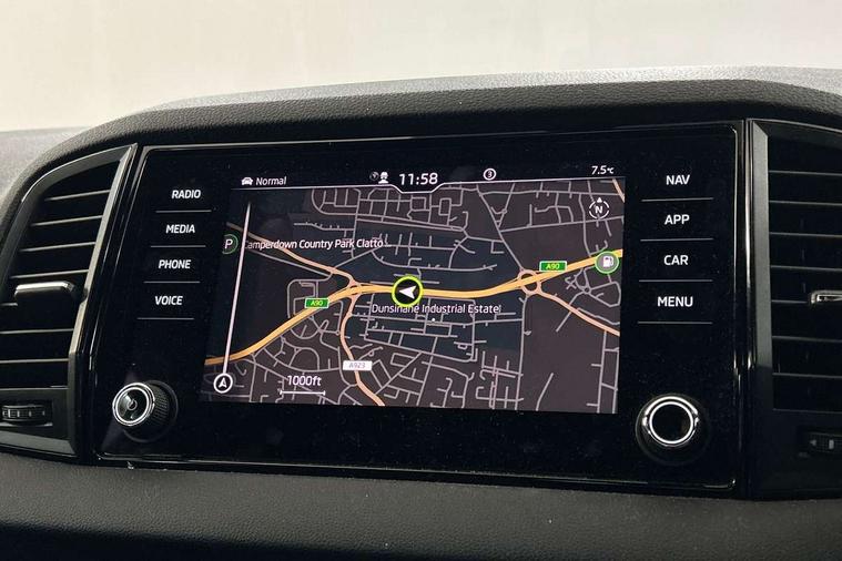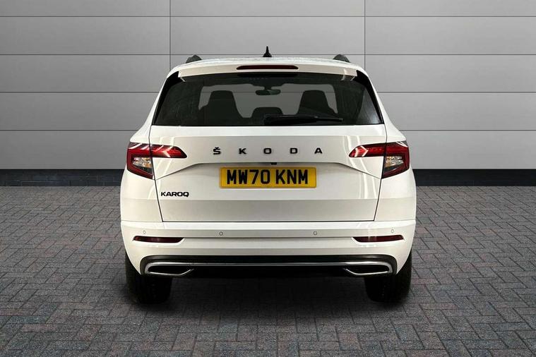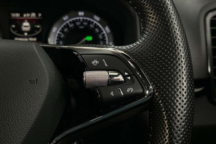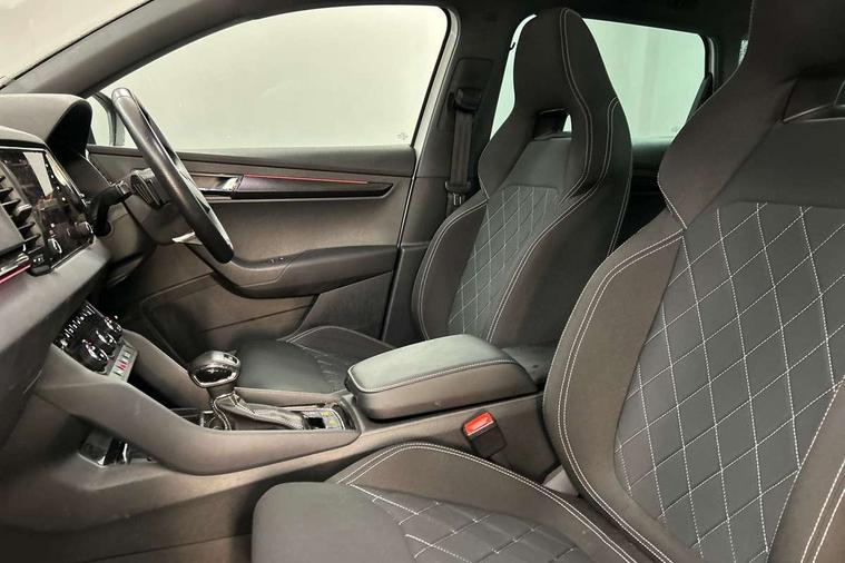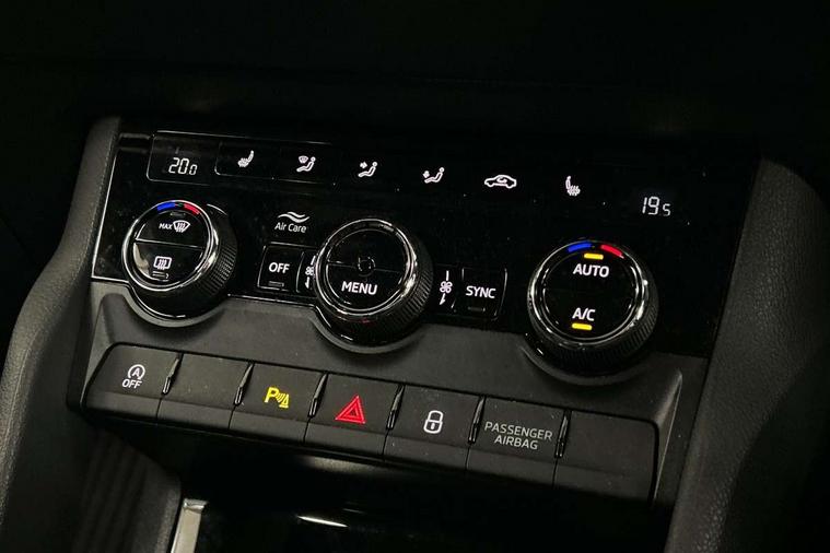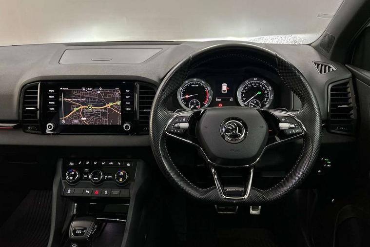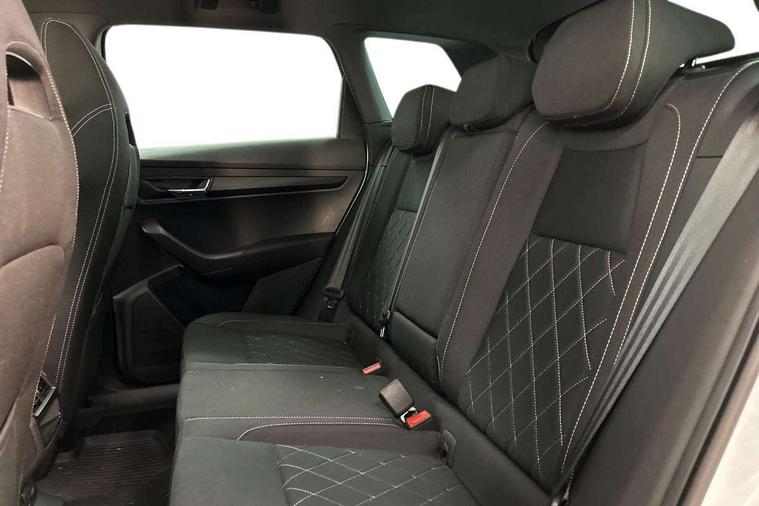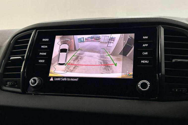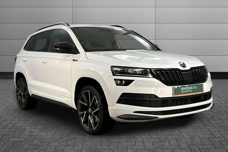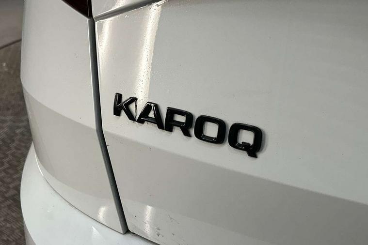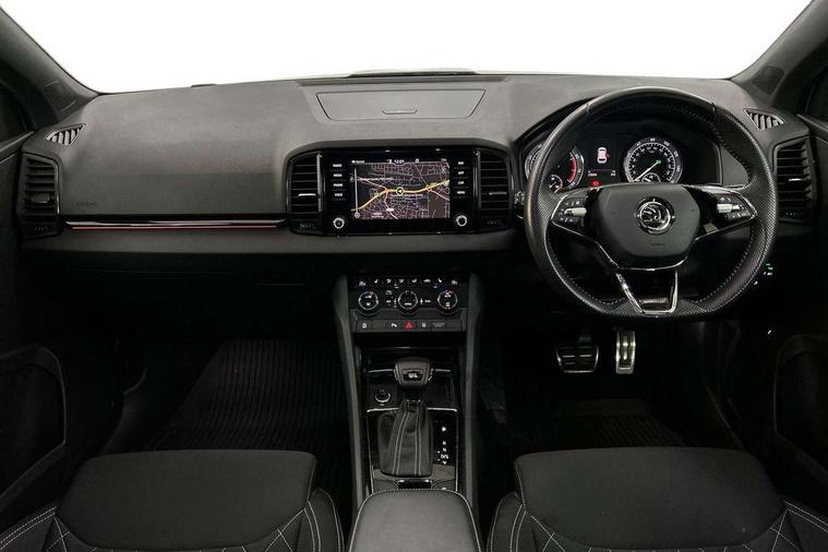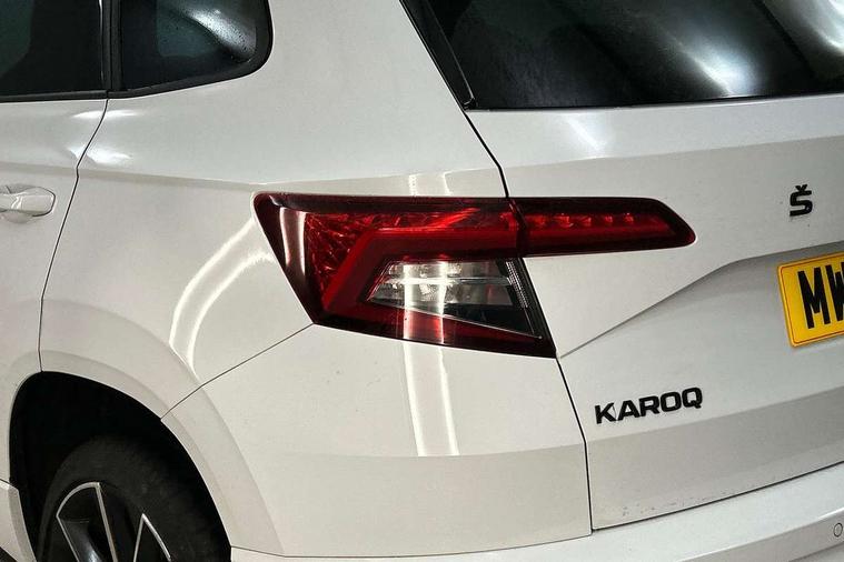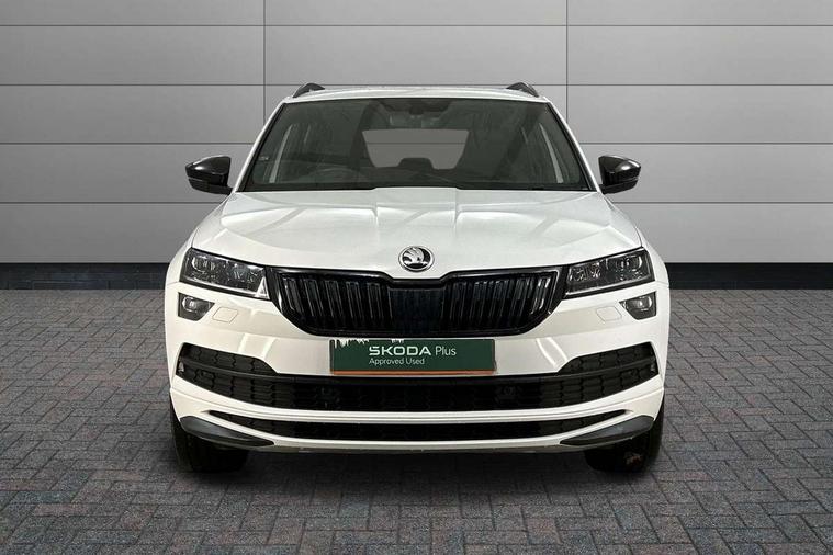 Care connect, Drive mode selector, Driver alert system, Driver fatigue sensor, Driver profile selection, Multifunction colour trip computer, Outside temperature gauge, Rear view camera, Service interval indicator, SmartLink wireless for Apple and wired for Android, Start/stop system with regenerative braking, USB C Port x 2 in front centre console, DAB radio with Bluetooth, SD card slot, USB connection, Wireless charging without wireless aerial connection, Acoustic glass, Aero front windscreen wipers with intermittent function, Automatic headlight control system, Black electric window control buttons, Black roof rails and door mirrors with radiator grille, Body colour door handles, Electric front and rear windows with child proof lock, Front door steps with SportLine logo, Full LED headlights + adaptive front light system + LED daytime running lights and front cornering fog lights, Headlight washers, Heated rear windscreen, LED rear lights with high functionality, Light assistant (coming/leaving home/tunnel light), Panoramic sliding sunroof, Privacy glass, Protective door side sills in body colour, Rear diffuser, Safety reflectors on front doors, Skoda lettering on tailgate in black, Sportline badge on front fender, Sportline decorative inserts with badging, Sports front and rear bumpers, Third brake light, 1.5 litre bottle holders in driver and front passenger door panels, 12V socket in boot, 12v socket in front centre armrest with storage compartment and rear air vents, 2 Folding hooks and nets in boot, 2 Front readings lights for driver and passenger, 3 rear height adjustable headrests, 4 foldable roof handles with rear coat hooks, 4 lashing points on luggage floor, Aluminium pedals, Backrest release, Black roof headlining, Cargo elements in boot, Chrome inner door handles, Door sill scuff plates, Driver and passenger seats height adjust, Front head restraints, Front seat and rear pockets, Height adjustable front three point seats belts with tensioners, Height/reach adjust steering wheel, Ice scraper, Illuminated and cooled glovebox, Illuminated luggage compartment, Isofix child seat preparation outer rear, Manual lumbar support for front seats, Net programme in boot, Pen holder, Pollen filter, Rear boot cover, Rear reading lights, Rear seats fixed folding and divided 60:40, Retractable parcel shelf attachable to tailgate, Safety vest holder, Storage box in upper central dashboard closed, Storage compartment below the passenger seat, Sunvisors with illuminated vanity mirrors, Textile floor mats, Umbrella under passenger seat, LED Interior lighting pack with Skoda welcome logo - Karoq, Airbags - Front side, head, knee and curtain, Automatic door unlocking in case of crash, Automatic fuel cut off in case of crash, Driver airbag, Electronic parking brake with auto hold function, Emergency rear braking signal, ESC including ABS, MSR, ASR, EDS, HBA, DSR, RBS, MKB and traction control, Front assist radar scanning of the space in front of the car with automatic braking, Hill hold control, Passenger airbag with switch-off function, Pedestrian monitor, Seatbelt reminder signalisation and pretensioner for all seats, Three point seatbelts rear, Two tone horn, Tyre pressure display, Tyre pressure monitor, Alarm with interior monitoring, back up horn and tilt sensor with safe function, Electronic engine immobiliser, Keyless entry and keyless start with safe system, Remote central locking with 2 remote folding keys, Black air vent surround, 19" Vega anthracite alloy wheels, Anti-theft wheel bolts protection, Storage on wheel cover,