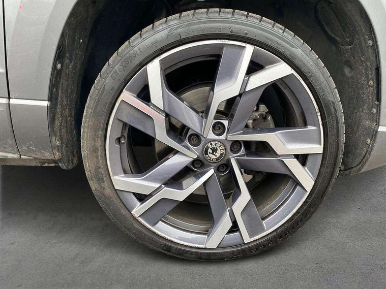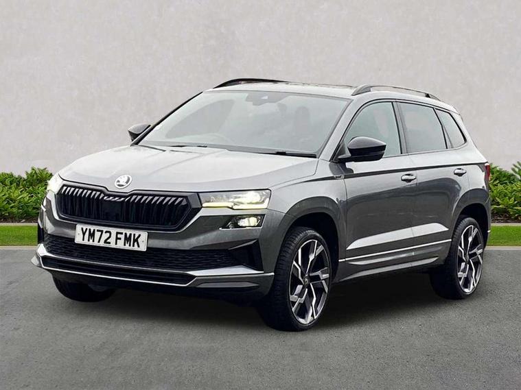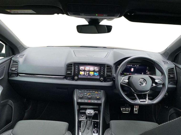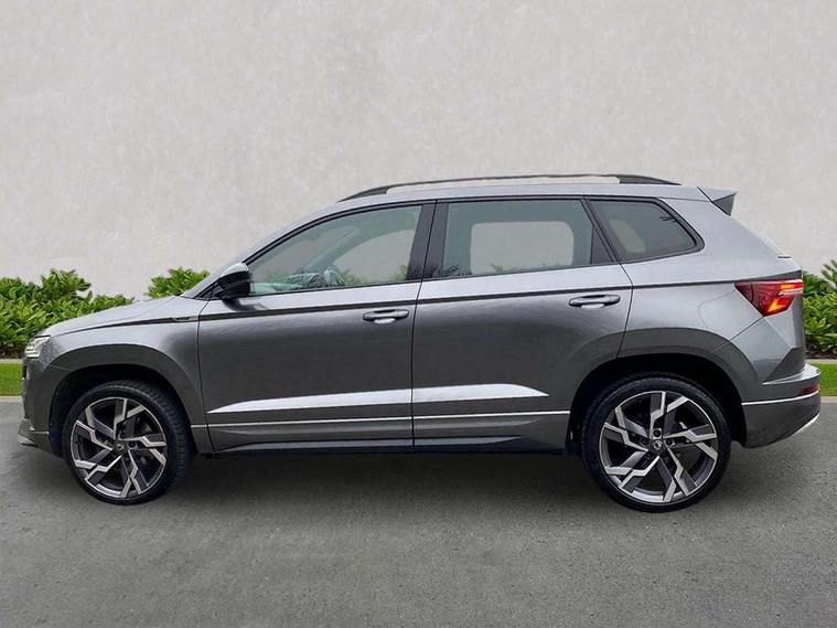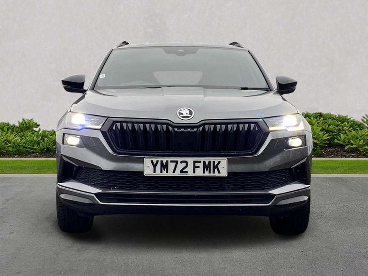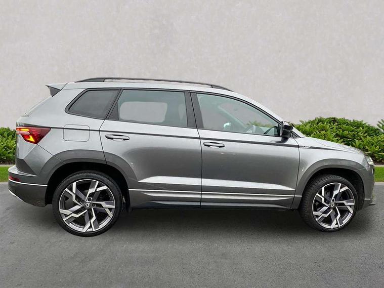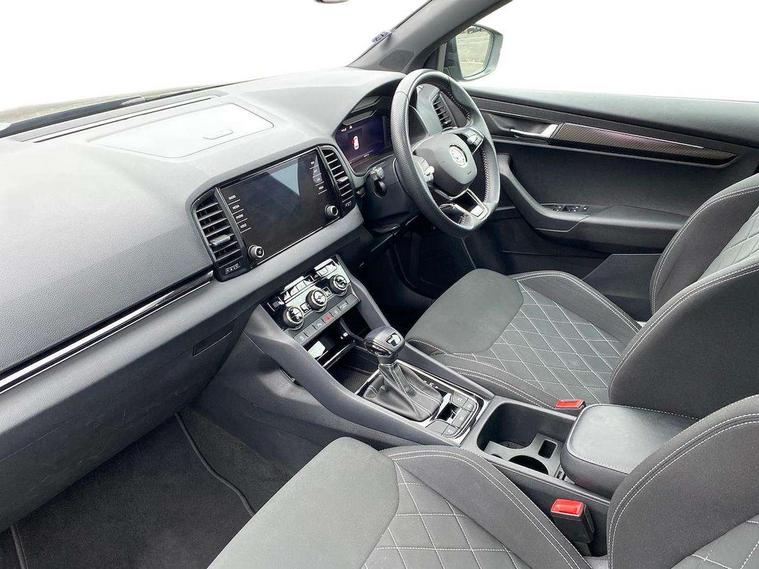 8" Digital display, Care connect, Driver fatigue sensor, Emergency services call system, Outside temperature gauge, Service interval indicator, SmartLink wireless for Apple and wired for Android, Start/stop system with regenerative braking, USB C Port x 2 in front centre console, Virtual pedal with electrically operated boot door, 8 speakers, DAB radio with Bluetooth, USB connection, Acoustic glass, Aero front windscreen wipers with intermittent function, Auto dimming rear view mirror with light and rain sensors, Black door mirrors, Black electric window control buttons, Black radiator grille, Black roof rails, Body colour door handles, Dynamic headlight range control with cornering light function, Electric front and rear windows with child proof lock, Front door steps with SportLine logo, Heated rear windscreen, LED daytime running lights, LED rear lights with high functionality welcome effect and dynamic indicators, Light assistant (coming/leaving home/tunnel light), Panoramic sliding sunroof, Plastic scuff plates, Privacy glass, Protective door side sills in body colour, Rear diffuser, Rear side wing doors, Rear spoiler, Rear window wiper with washer system and intermittent control, Safety reflectors on front doors, Skoda lettering on tailgate in black, Sportline badge on front fender, Sportline decorative inserts with badging, Sports front and rear bumpers, 1.5 litre bottle holders in driver and front passenger door panels, 12V socket in boot, 12v socket in front centre armrest with storage compartment and rear air vents, 2 Folding hooks and nets in boot, 3 rear height adjustable headrests, 3 seat bench in 2nd row, 3 spoke leather sports multifunction steering wheel and silver stitching with gear shift paddles, 4 foldable roof handles with rear coat hooks, Black floor carpet, Black roof headlining, Chrome inner door handles, Double sided boot floor, Foldable hooks in the boot, Front head restraints, Height adjustable front three point seats belts with tensioners, Height/reach adjust steering wheel, Ice scraper, Illuminated glovebox, Illuminated luggage compartment, Isofix child seat preparation outer rear, Manual lumbar support for front seats, Pen holder, Pollen filter, Rear boot cover, Rear reading lights, Rear seats fixed folding and divided 60:40, Rubbish bin door, Safety vest holder, Single front passenger seat, Storage box in upper central dashboard closed, Sunvisors with illuminated vanity mirrors, Textile floor mats, Ticket holder, Titan black interior ceiling, Tool kit, Welcome animation with sportline logo, Light Pack - Karoq, Parking pack - Karoq, Automatic door unlocking in case of crash, Automatic fuel cut off in case of crash, Child locks on rear doors, Driver airbag, Electronic parking brake with auto hold function, Emergency rear braking signal, ESC including ABS, MSR, ASR, EDS, HBA, DSR, RBS, MKB and traction control, Front side airbags, Hill hold control, Knee airbags, Passenger airbag with switch-off function, Pedestrian monitor, Seatbelt reminder signalisation and pretensioner for all seats, Three point seatbelts rear, Two tone horn, Tyre pressure display, Tyre pressure monitor, Alarm with interior monitoring, back up horn and tilt sensor with safe function, Electronic engine immobiliser, Keyless entry and start/stop, Remote central locking with 2 remote folding keys, Black air vent surround, Black centre console, Satin black dashboard, Satin black door trim, 19" Vega black polished alloy wheels, Anti-theft wheel bolts protection, Matt black aero hub caps, Storage on wheel cover,
