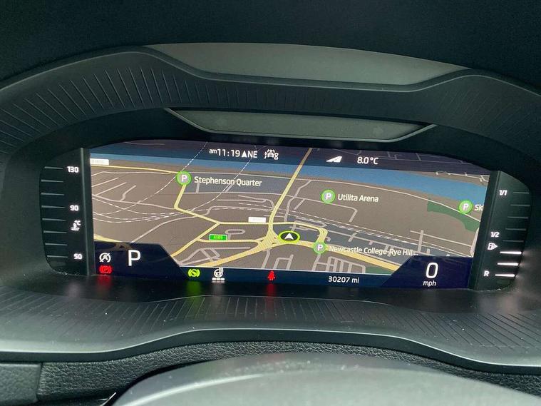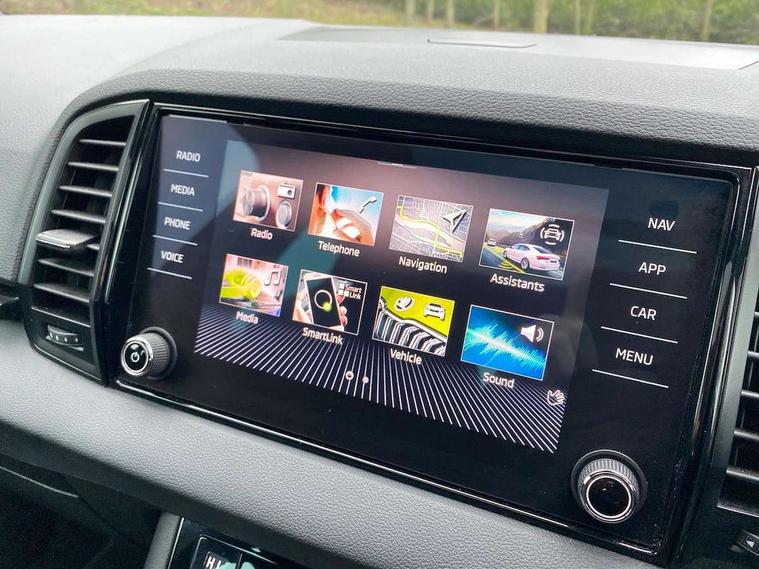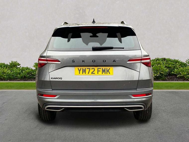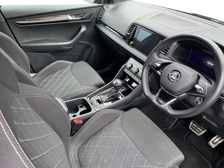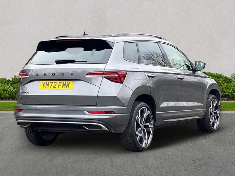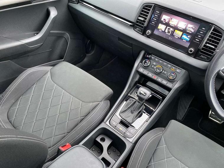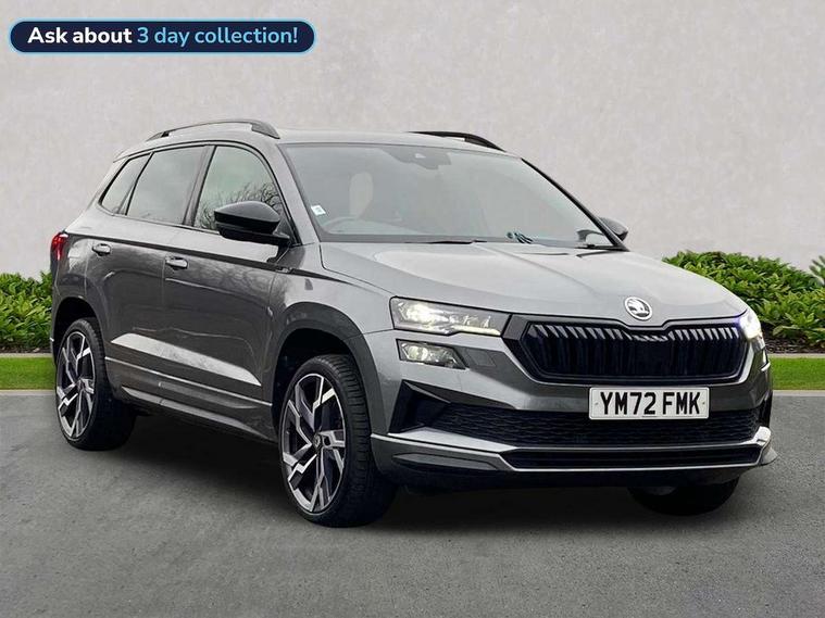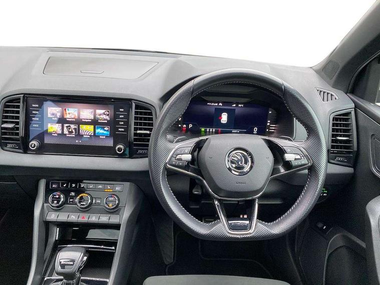 8" Digital display, Care connect, Driver fatigue sensor, Emergency services call system, Outside temperature gauge, Service interval indicator, SmartLink wireless for Apple and wired for Android, Start/stop system with regenerative braking, USB C Port x 2 in front centre console, Virtual pedal with electrically operated boot door, 8 speakers, DAB radio with Bluetooth, USB connection, Acoustic glass, Aero front windscreen wipers with intermittent function, Auto dimming rear view mirror with light and rain sensors, Black door mirrors, Black electric window control buttons, Black radiator grille, Black roof rails, Body colour door handles, Dynamic headlight range control with cornering light function, Electric front and rear windows with child proof lock, Front door steps with SportLine logo, Heated rear windscreen, LED daytime running lights, LED rear lights with high functionality welcome effect and dynamic indicators, Light assistant (coming/leaving home/tunnel light), Panoramic sliding sunroof, Plastic scuff plates, Privacy glass, Protective door side sills in body colour, Rear diffuser, Rear side wing doors, Rear spoiler, Rear window wiper with washer system and intermittent control, Safety reflectors on front doors, Skoda lettering on tailgate in black, Sportline badge on front fender, Sportline decorative inserts with badging, Sports front and rear bumpers, 1.5 litre bottle holders in driver and front passenger door panels, 12V socket in boot, 12v socket in front centre armrest with storage compartment and rear air vents, 2 Folding hooks and nets in boot, 3 rear height adjustable headrests, 3 seat bench in 2nd row, 3 spoke leather sports multifunction steering wheel and silver stitching with gear shift paddles, 4 foldable roof handles with rear coat hooks, Black floor carpet, Black roof headlining, Chrome inner door handles, Double sided boot floor, Foldable hooks in the boot, Front head restraints, Height adjustable front three point seats belts with tensioners, Height/reach adjust steering wheel, Ice scraper, Illuminated glovebox, Illuminated luggage compartment, Isofix child seat preparation outer rear, Manual lumbar support for front seats, Pen holder, Pollen filter, Rear boot cover, Rear reading lights, Rear seats fixed folding and divided 60:40, Rubbish bin door, Safety vest holder, Single front passenger seat, Storage box in upper central dashboard closed, Sunvisors with illuminated vanity mirrors, Textile floor mats, Ticket holder, Titan black interior ceiling, Tool kit, Welcome animation with sportline logo, Light Pack - Karoq, Parking pack - Karoq, Automatic door unlocking in case of crash, Automatic fuel cut off in case of crash, Child locks on rear doors, Driver airbag, Electronic parking brake with auto hold function, Emergency rear braking signal, ESC including ABS, MSR, ASR, EDS, HBA, DSR, RBS, MKB and traction control, Front side airbags, Hill hold control, Knee airbags, Passenger airbag with switch-off function, Pedestrian monitor, Seatbelt reminder signalisation and pretensioner for all seats, Three point seatbelts rear, Two tone horn, Tyre pressure display, Tyre pressure monitor, Alarm with interior monitoring, back up horn and tilt sensor with safe function, Electronic engine immobiliser, Keyless entry and start/stop, Remote central locking with 2 remote folding keys, Black air vent surround, Black centre console, Satin black dashboard, Satin black door trim, 19" Vega black polished alloy wheels, Anti-theft wheel bolts protection, Matt black aero hub caps, Storage on wheel cover,