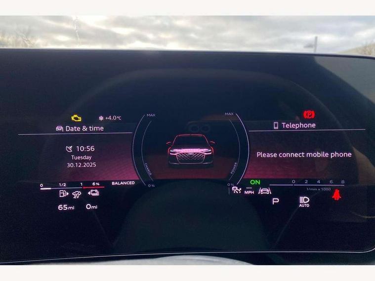 All wheel steering, Audi application store, Audi assistant, Audi connect emergency call and service, Audi connect with Amazon Alexa Integration, Audi digital key, Audi drive select, Audi phone box with wireless charging, Audi virtual cockpit, Automatic start/stop system with coasting functionality, Bluetooth interface, Luggage compartment lid with Electric opening / closing, MMI navigation plus with high resolution 14.5" OLED touchscreen colour display, Power assisted steering, Smartphone interface includes wireless Apple carplay/Android Auto, Voice control system, 3 pin 10 amp domestic charging cable, Compact e-tron charging system, Fuel tank 46L, Hybrid propulsion system, Industrial connector CEE 32A, 230V, long and straight for the e-tron charging system, Mode 3 charging cable for public charging (AC), Quattro with ultra technology, Sports suspension, Type 2 socket for AC charging, Audi sound system impressive sound with 10 loudspeakers including centre speaker and subwoofer, 6-channel amplifier with a total output of 180 watts, DAB Digital radio, USB ports with charging function, Audi Matrix LED technology, Auto dimming rear view mirror, Automatic-dynamic headlight range control, Body colour door mirrors, Body coloured door handles, Dipped beam, main beam, position light, dynamic indicator and cornering light, Door mirrors - electrically adjustable, heated, folding and auto dimming on both sides, Dynamic light scenarios of the coming home/leaving home function when stationary, Electric front/rear windows, Frameless auto dimming interior rear view mirror, Front illuminated aluminium inlay door sill trims with S logo, Headlight cleaning system, LED headlights Plus incl. digital daytime running lights, turning light, all-weather light, motorway light, manouevring light and intersection light, LED rear lights pro incl. brake lights, tail lights, rear number plate lights, reversing lights, continuous light strip, LED third brake light, Privacy glass, Rain and light sensors, Rear and side windows with heat insulating glass, Rear boot, Rear side wing doors, S line exterior styling, Sport exterior inc Radiator grille, air inlets and diffuser in scandium grey as well as inlay in diffuser in selenite silver, White rhombus logo projection light in exterior mirrors, Window trim strips in aluminium look, Windscreen with heat insulating and acoustic glazing, 3 seat bench in 2nd row, 3-spoke Sport leather steering wheel flat top and bottom with multifunction and shift paddles, 4 way electric lumbar support for driver and front passenger, 4 zone deluxe automatic climate control, 40:20:40 split folding rear seat bench with centre armrest and cup holders, Centre armrest, front- adjustable angle with four settings, Convenience auxiliary air conditioning, Electrically adjustable front seats, Front head restraints, Heated front seats, i-Size child seat mounting on the front passenger side and outer rear seats, i-Size and top tether on the outer rear seats, Manual steering wheel adjustment, Rear headrests, Single front passenger seat, Sport front seats, Stainless steel pedals and footrest, Steering wheel trim in chrome look, S emblem, steering wheel grips in perforated leather and contrasting stitching, Twin leather/artificial leather upholstery, Ambient lighting package plus - A6, Drive and Park assistance package - A6, Protective warning assistance package - A6, 3x3 point rear seat belts, Acoustic vehicle alerting system, Black seat belts, Convenience key with safelock, Driver and front passenger airbags, EBD - Electronic brakeforce distribution, Electric rear child safety lock, Electromechanical parking brake, Electronic Stability Control (ESC) including ABS, ASR and EDL, First aid kit with warning triangle and vests, Front passenger airbag deactivation, Seatbelt monitoring, Side airbags front with head airbag system and interaction airbag, Standard 18"steel disc brakes front and rear, Tyre pressure monitoring system, Anti theft alarm, Anti-theft wheel bolts, Immobiliser, Keyless Go, Remote central locking, Accents in the interior in aluminium look, Inlays in matt brushed aluminium with linear embossing, anthracite, Upper and lower interior elements in leatherette with contrasting stiching, Wraparound interior elements in artificial leather, Tyre repair kit,