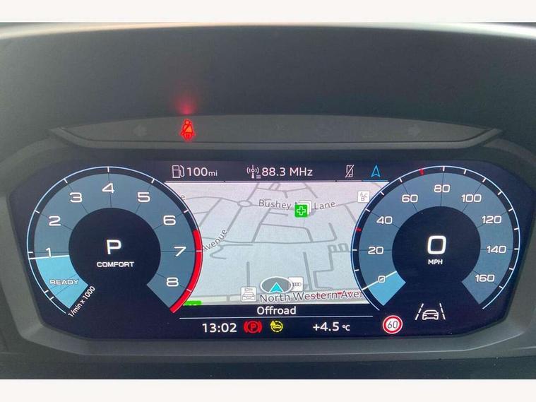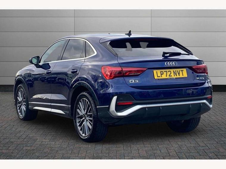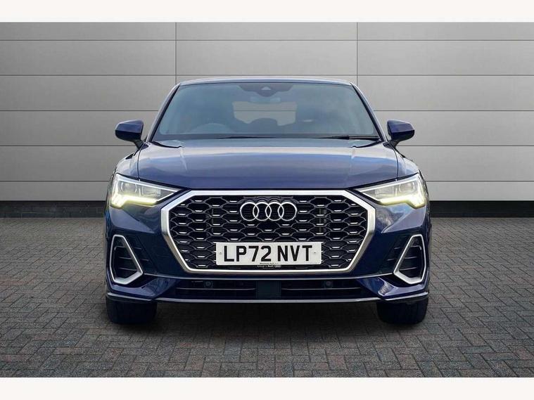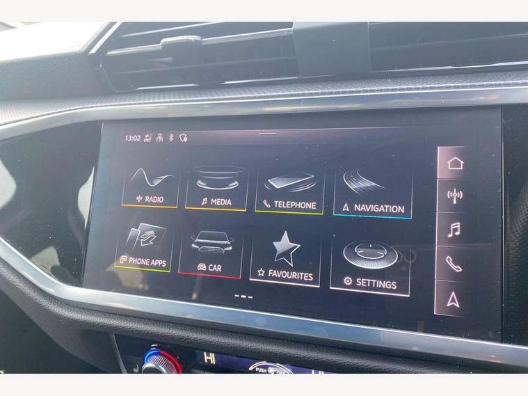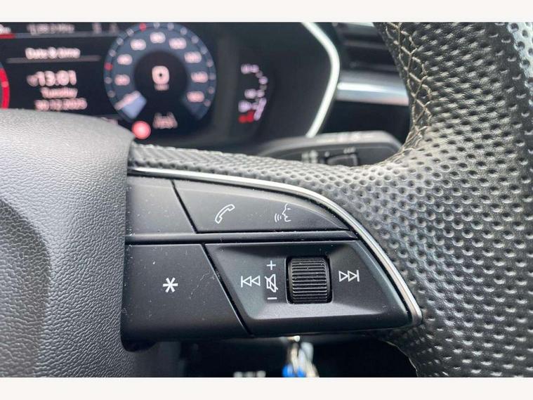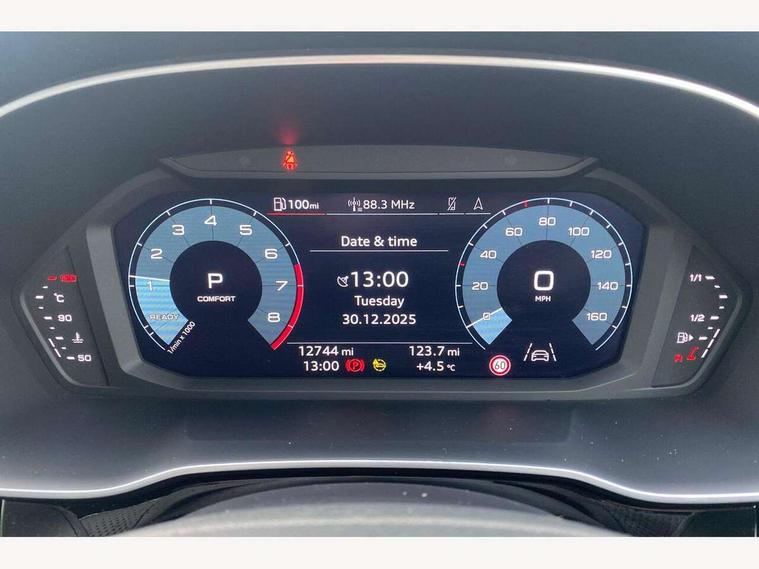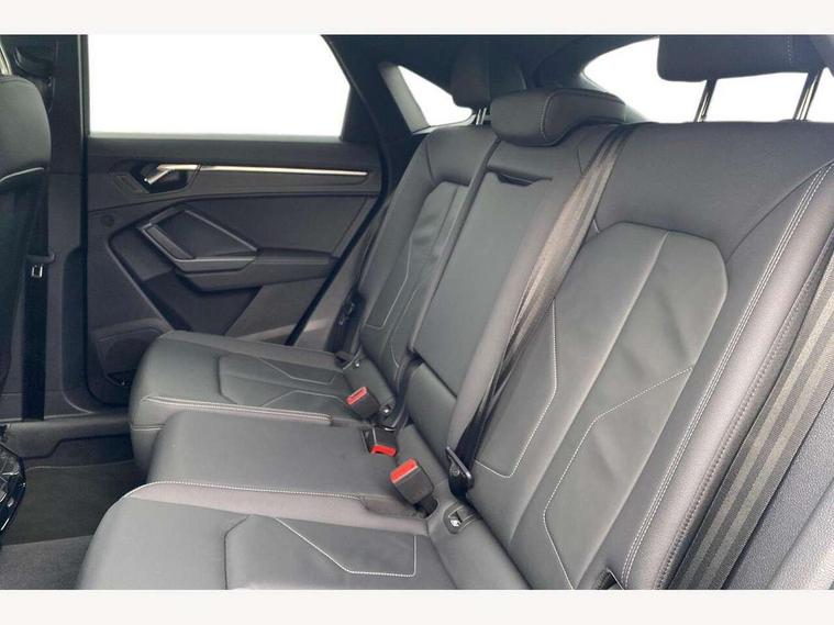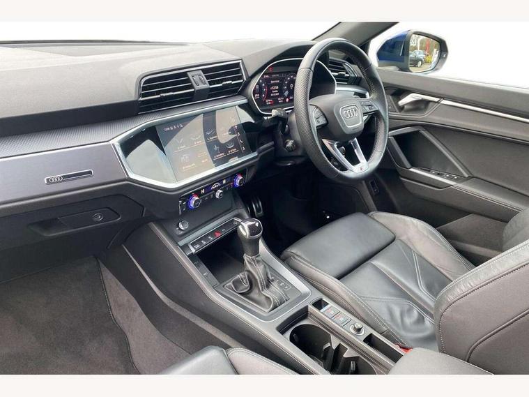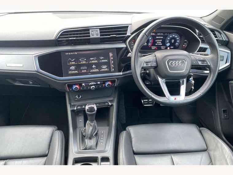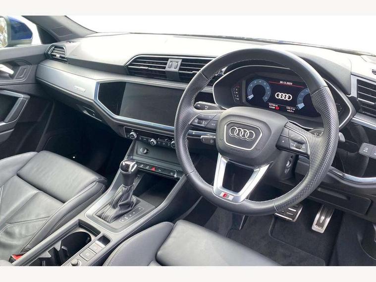 Audi drive select, Audi lane departure warning, Audi Virtual Cockpit - 10.25" display, Bluetooth interface, Camera based traffic sign recognition, Legal emergency call, MMI Navigation Plus with high resolution 10.1 inch touchscreen colour display, Power operated tailgate, Progressive steering, Service interval indicator, Smartphone interface includes wireless Apple carplay/Android Auto, Start stop system with recuperation, Voice control system with natural language interaction, Sports suspension, 2 USB-C ports with charge and data functions, 6 passive loudspeakers, DAB digital radio module, Acoustic windscreen, Aluminium window trim, Auto dimming frameless rear view mirror, Diffuser grille in grained matt black, Diffuser trim in selenite silver, Electrically folding, adjustable and heated door mirrors with integrated LED side indicators and kerb view function for passenger side, Front and rear electric windows, Front fog lights, Front side air inlets in selenite silver, Front underbody protection in manhattan grey paint finish, Grille surround in aluminium silver matt, High gloss black finish B and C pillars, LED Dynamic rear indicators, LED headlights with LED daytime running lights, LED rear lights, LED third brake light, Privacy glass dark tinted rear and rear-side windows (from B-pillar backwards), Radiator grille in anthracite black with inlay in matt aluminium silver, Rain and light sensors, Rear side wing doors, Rear underbody protection in matt black, Rear wiper, S line badges on front wings, S line front and rear bumpers and side skirts in contrasting Manhattan grey paint finish, Side skirt insert in matt Platinium grey, Variable front intermittent wipers, 12V socket in rear centre console, 3 seat bench in 2nd row, 3 spoke leather multifunction steering wheel features S badging and grips in perforated leather with contrast stitching, 40:20:40 folding with manual adjustment for 60:40 forwards/backwards position and backrest angle, Adjustable rear seat bench/backrest with centre armrest and cupholder, Black cloth headlining, Dual zone electronic climate control, Front and rear black floor mats with contrast stitching, Front and rear headrests, Front and rear roof module including reading lights, Front centre armrest, Glove compartment lighting, Height and reach adjustable steering wheel, Illuminated door sill trims with S logo, ISOFIX child seat mounting for front passenger with airbag deactivation and outer rear seat including top tether attachment point for outer rear seats, Luggage compartment light right in white, Luggage compartment sill protection in stainless steel, Manual front seats with height adjustment, Perforated leather gearknob, Single front passenger seat, Stainless steel pedals, Ambient lighting pack - Q3, Non smoking pack - Q3, 3x3 point rear seatbelts, 6 airbags - Driver, front passenger, curtain and side windows, Audi pre-sense front with pedestrain and cyclist recognition, Electrically operated child locks on rear doors, Electromechanical parking brake, Electronic stabilisation control including ABS, ASR and EDL, Front seatbelt reminder, Hill descent control, Hill hold assist, Pre sense basic, Seatbelt monitoring, Tyre pressure warning, Warning triangle and first aid kit, Anti theft alarm, Anti theft wheel bolts, Immobiliser, Remote central locking, Aluminium look interior elements, Black dashboard, Dark matt brushed aluminium inlay, Detail dashboard around MMI touch colour display in glass look, black with surround in aluminium look, Leatherette door armrest,
