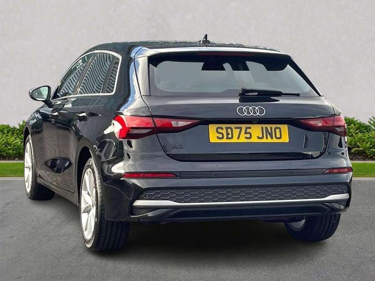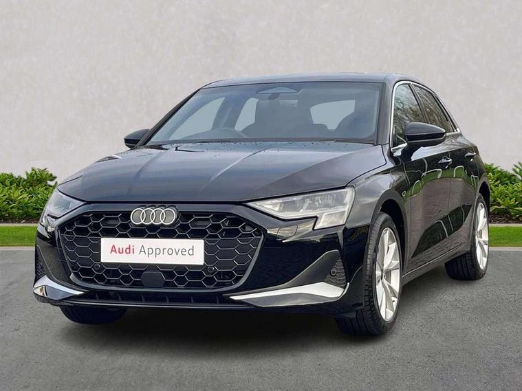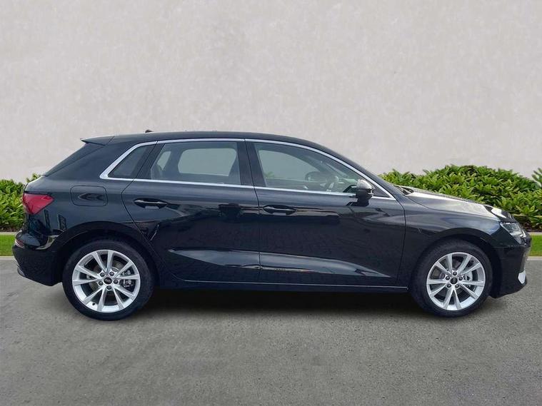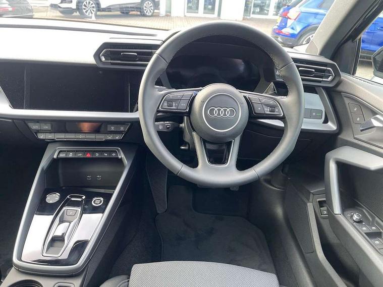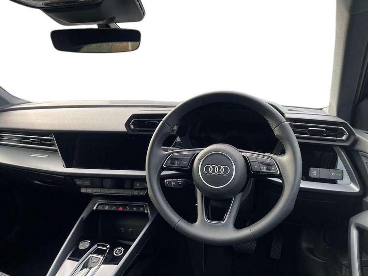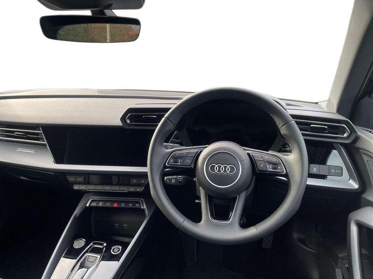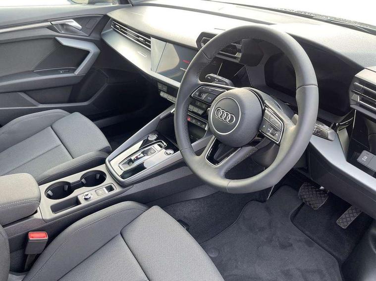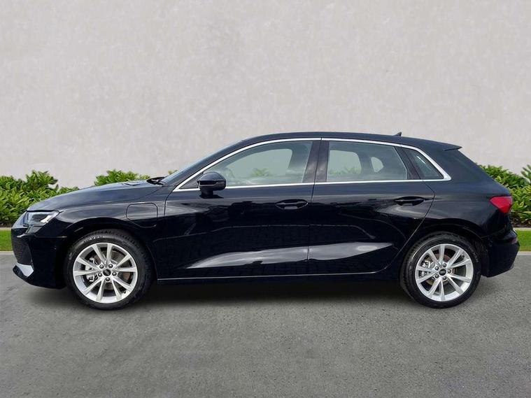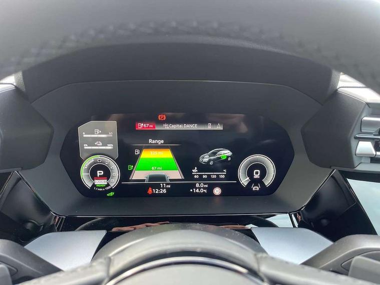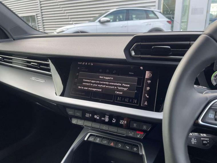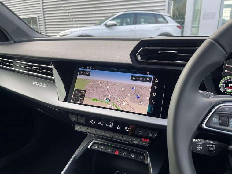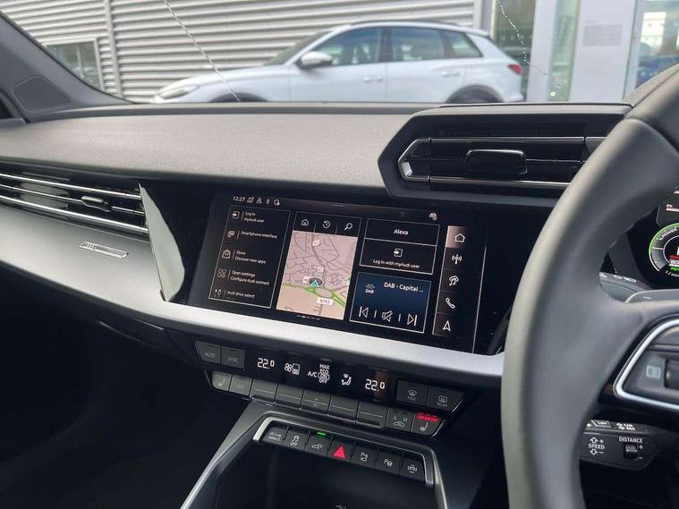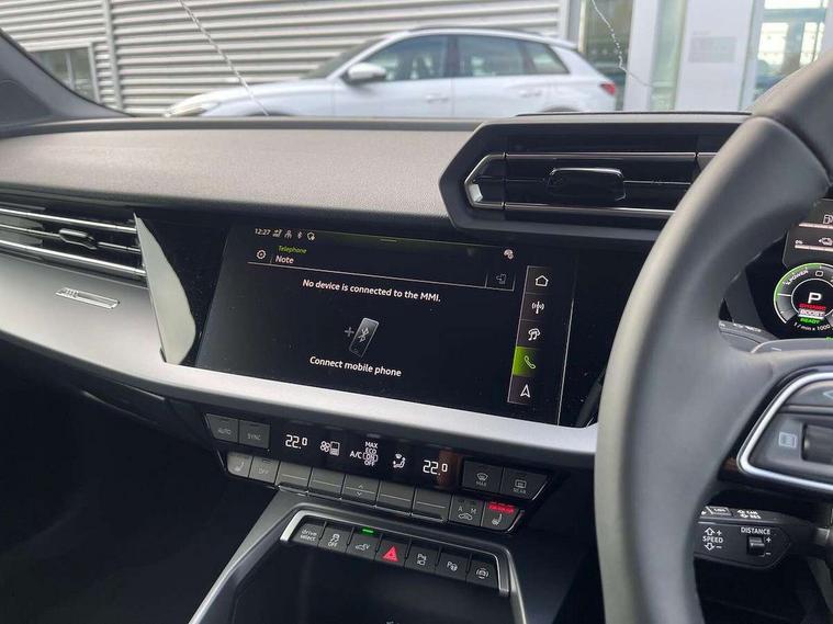 Adaptive cruise control (ACC), Adjustable speed limiter, Audi drive select (Auto, Comfort, Dynamic, Efficiency and Individual), Audi virtual cockpit plus - 12.3" full HD resolution dynamic digital instrument cluster, Automatic start/stop system with recuperation, Bluetooth interface, Camera based traffic sign recognition, Collision avoidance assistant, Driver attention and fatigue detection, e-Call (emergency call), Electromechanical power speed sensitive steering, Emergency assist, Intersection assist, Lane departure warning system, MMI Navigation Plus with high resolution 10.1" colour touch screen display, Park Assist with parking system Plus, Reversing camera, Service indicator, Smartphone interface with app store includes wireless Apple carplay, Android auto and Amazon alexa integration, Trip computer, Voice control system with natural language interaction, CCS socket for DC charging, Charging cable for public charging, mode 3 (type 2), 32 A, Standard suspension, Type 2 socket for AC charging, Audi Phonebox light with wireless charging, Audi sound system - 10 loudspeakers including centre loudspeaker and subwoofer, DAB Digital radio, USB ports with charging function in the rear, 3rd brake light, Acoustic glass windscreen, Aluminium window trim, Auto dimming frameless rear view mirror, Body colour exterior mirrors, Body colour roof spoiler, Electrically adjustable/heated/folding/auto dimming door mirrors with integrated LED indications + kerb view function for passenger side, Exterior model badging, Front electric windows, Front radiator grill in high gloss dark chrome, Front side air inlets in grained matt black with silver frame, Heat insulating glass windscreen, Invisible tailpipe, LED daytime running lights, LED headlights and halogen rear lights, Light and rain sensors, Rear diffuser and grill in grained matt black with silver frame, Rear electric windows, Rear side wing doors, Rear window, rear door windows and rear side windows in clear glass, Rear wiper, 12V socket and storage compartment in front centre console, 3 seat bench in 2nd row, 3 spoke leather multifunction steering wheel with gear shift paddles, 3-zone deluxe automatic air conditioning, 4 way electrically adjustable lumbar support for driver and front passenger, 60/40 split folding rear seat bench, Black front and rear floor mats, Convenience auxiliary air conditioning, Front and rear headrests, Front centre armrest, Front door sill trims with aluminium inlay, Heated front seats, Height and reach adjustable steering wheel, i-Size child seat mounting on the front passenger side and outer rear seats, i-Size and top tether on the outer rear seats, Manual boot compartment lid, Manually adjustable front seats, Routine cloth upholstery with front sports seats, Seat side bolsters, Single front passenger seat, Steel grey cloth headlining, Aluminium interior elements pack - A3, LED interior lighting pack -A3, 3x3 point rear seat belts, Acoustic vehicle alerting system, Driver and front passenger airbag with passenger airbag deactivation, Electronic Stabilisation Control (ESC) including ABS, ASR and EDL, First aid kit with warning triangle and 2 safety vests, Front side airbags with head airbags and interaction airbag, Hill hold assist, Pre-sense front with pedestrian and cyclist detection, Seatbelt monitoring, Tyre pressure loss indicator, Anti theft alarm, Anti-theft wheel bolts, Electronically operated child locks, Immobiliser, Black dashboard, Inlays in volcano grey fine paint finish, Tyre repair kit,