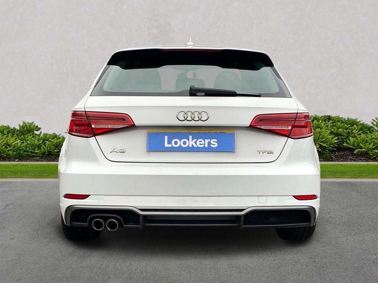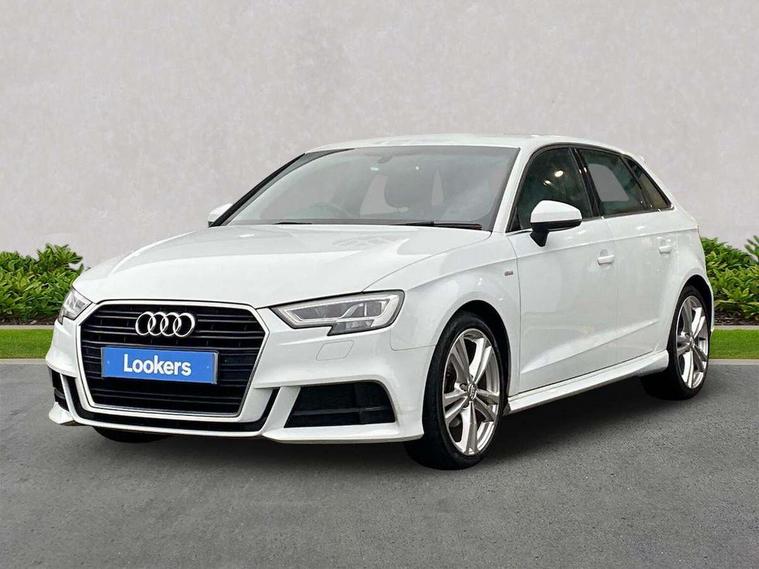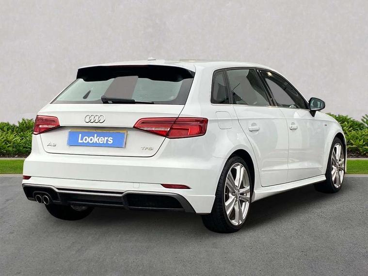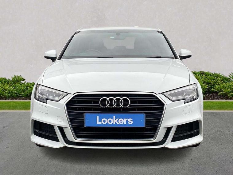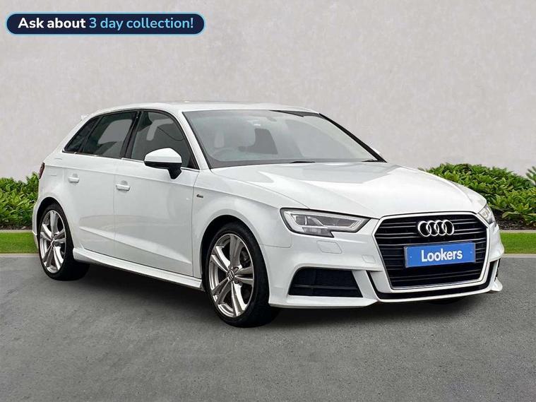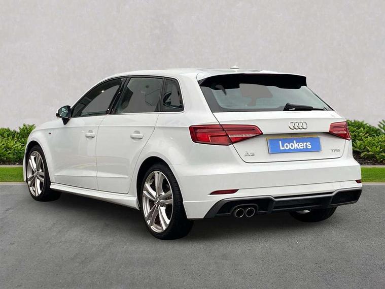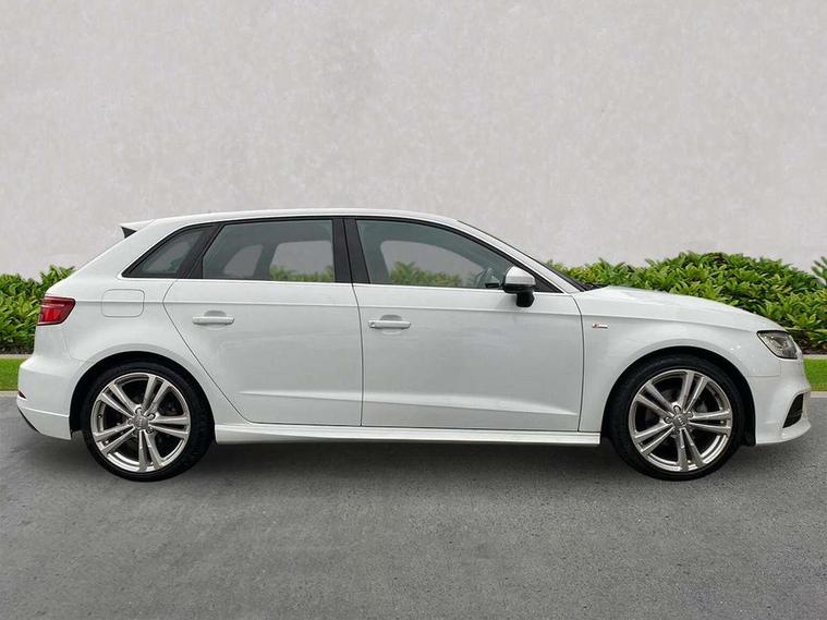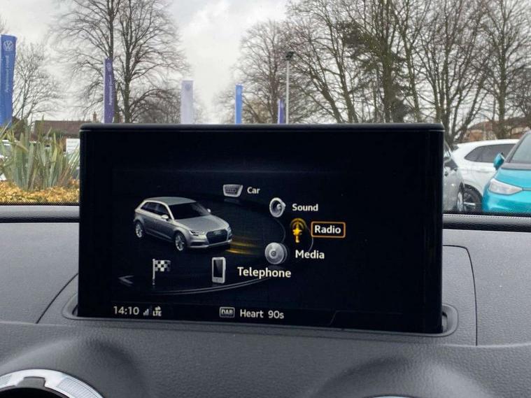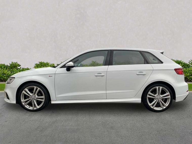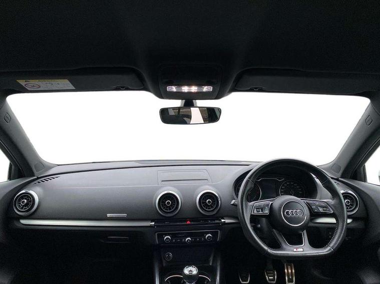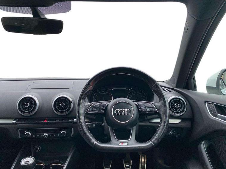 Audi connect, Audi drive select, Audi smartphone interface, Colour driver's information system display, Mobile telephone preparation - bluetooth interface, Service interval indicator, Speed limit display, Voice control system, 2 USB ports, Audi music interface, Auxiliary input socket, DAB Digital radio, Aluminium window trim, Body colour bumpers, Body colour door mirrors with integral indicators, Body colour roof spoiler, Chrome exhaust tailpipes, Electric front windows, Electric operated/heated door mirrors, Electric rear windows, Heated windscreen washer jets, LED daytime running lights, Matt black radiator grille, Rear wiper, S Line body styling, Sport specific side air inlet grille and diffuser insert, 3 adjustable rear headrests, 3 spoke flat bottomed multi-function leather steering wheel, 4 lashing points to secure luggage, Adjustable front armrest, Black cloth headlining, Dual zone electronic climate control, Front and rear interior lights with delay, Front passenger seat isofix location point, Front/rear floor mats, Height/depth adjustable steering column, Illuminated door sills, Illuminated glovebox, ISOFIX child seat preparation+airbag deactivation, Jack and tool kit, Stainless steel pedals, Storage compartment in centre console, Storage compartment under front seats, Storage compartments in doors, LED interior light pack - A3/RS3, Light and rain sensor pack - A3 Hatchback/Sportback, Storage and luggage pack - A3/RS3, 3 point seatbelts on all seats, ABS/EBD, Active bonnet, Active front headrests, ASR, Curtain airbags, Driver and passenger side airbags, Driver/Front Passenger airbags, Drivers knee airbag, EDL, Electromechanical parking brake, ESC - Electronic Stability Control + traction control, Front passenger airbag deactivation, Manual rear child locks, Multi-Collision braking, Seatbelt warning, Tyre pressure monitor, Warning triangle and first aid kit, Anti theft alarm, Anti-theft wheel bolts, Remote control central locking, Thatcham category 1 alarm + immobiliser, Aluminium air vent surrounds, Aluminium trim elements, Space saver spare wheel,