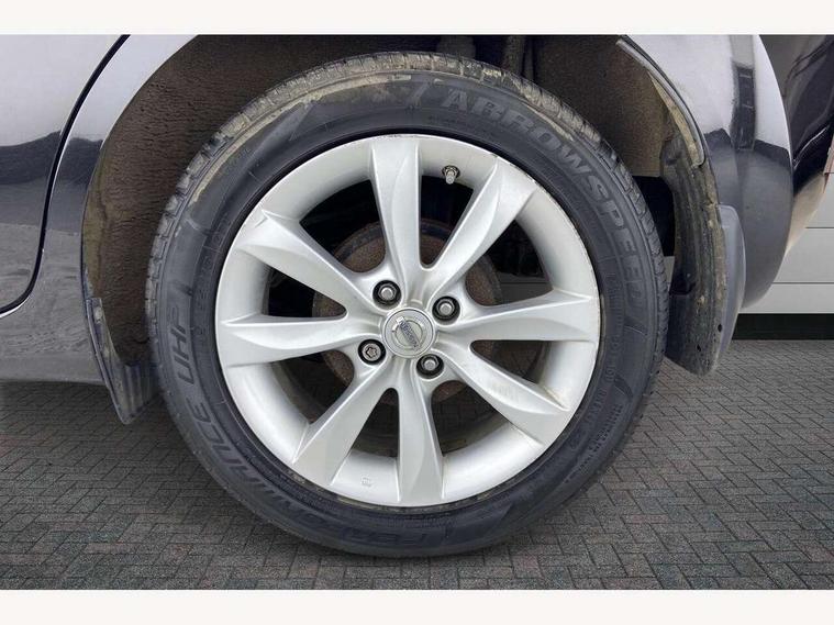 Bluetooth phone integration system, Cruise control + speed limiter, Digital clock, Digital trip meter, Nissan connect sat nav system, PAS, Reverse parking aid, Service interval indicator, Trip computer, 6 speakers, Auxiliary socket for external MP3 player, DAB Digital radio, Radio/CD, Steering wheel audio controls, USB connection, Automatic front wipers, Automatic headlights, Body colour bumpers, Body colour door handles, Body colour door mirrors, Chrome surround for daytime running lights, Daytime running lights, Electric adjustable door mirrors, Electric front windows, Electric rear windows, Front fog lamps, Headlamp levelling, Heated door mirrors, Privacy glass, Rear wiper, 60/40 split rear seats, Centre console storage, Climate control, Driver seat height adjust, Dynamic cloth upholstery, Flexiboard boot storage system, Front cabin and boot lamps, Front headrests, Front seatback pockets, Front/rear armrests, Isofix child seat preparation, Leather steering wheel, Pollen filter, Rear centre head restraint, Rear headrests, Sliding rear seats, Tilt adjustable steering wheel, 3 point seatbelts on all rear seats, ABS with Brake Assist, Childproof rear door locks, Curtain airbags, Driver airbag, ESP, Front side airbags, Passenger airbag, Passenger airbag cut-off device, Side airbags, Tyre pressure monitoring system, Warning triangle and first aid kit, Alarm, Immobiliser, Keyless entry, Remote central locking, 16" alloy wheels, Tyre repair kit,