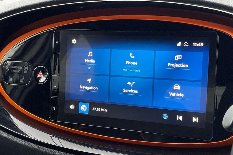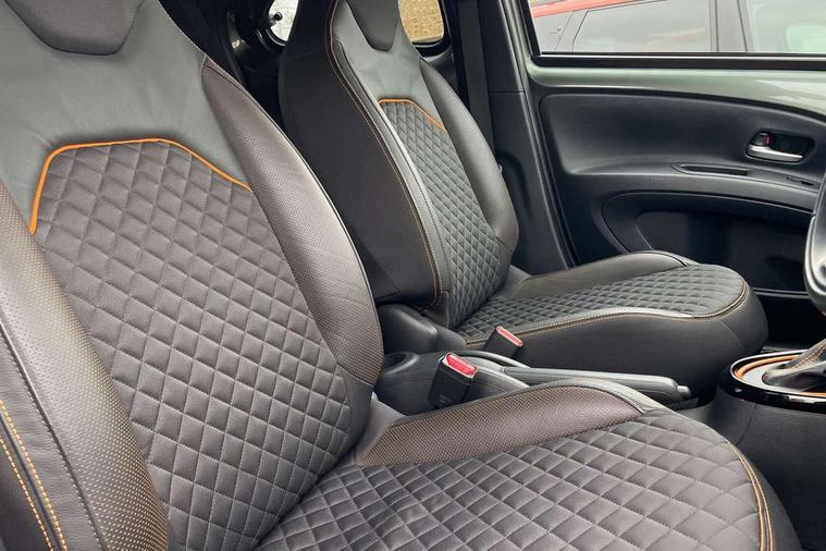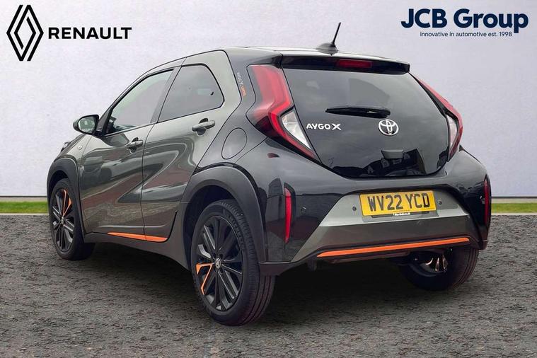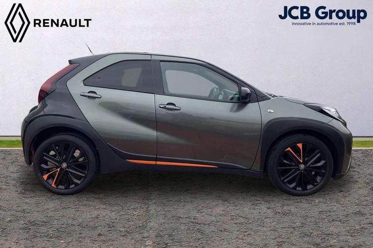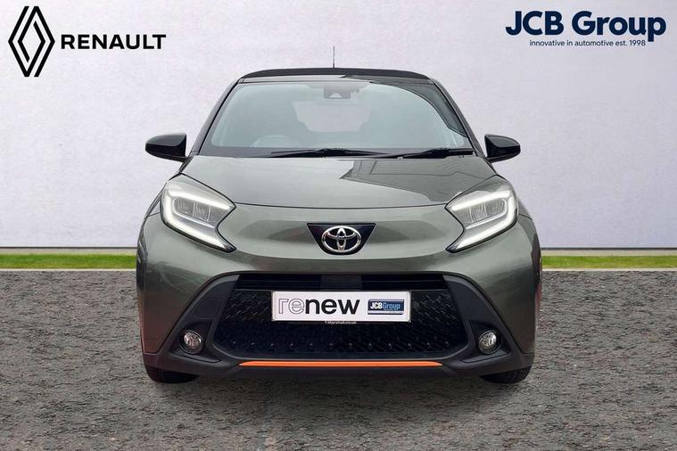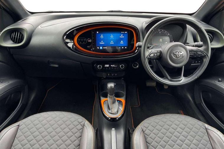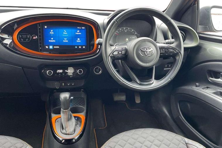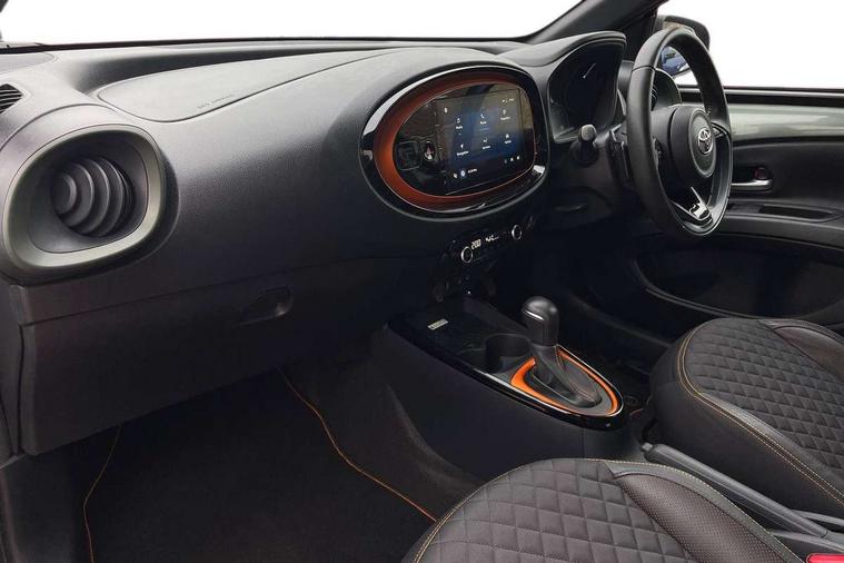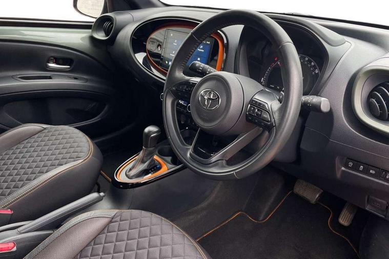 4.2" TFT colour screen, Adjustable speed limiter, Analogue speedometer, Bluetooth connectivity, Digital tachograph, Driver attention alert system, eCall emergency call system, ECO-driving indicator, Electric power steering, Front and rear parking sensors with auto brake, Intersection turn assist, Key reminder warning, Noise reduction kit, Pre collision system with emergency steering assist, Remote boot door release on key, Reversing camera with static guide lines, Smart entry and push button start, Speed limit display, Start and stop, Wireless charger, Wireless Smartphone Integration includes Apple CarPlay and Android auto, Vehicle Stability Control (VSC), 4 speakers, 9" HD multimedia display touch screen with Toyota smart connect, DAB digital audio broadcast, USB connector, Auto headlights, Auto wipers, Automatic headlights cut-off, Automatic high beam On/Off switch, Bicycle towing hook, Black fog light surrounds, Black side protection mouldings, Black wheel arch mouldings, Body colour door handles, Body coloured front bumper, Boot door scuff plate, Canvas roof, Eclipse black rear bumper, Electric heated door mirrors, Follow me home headlights, Front fog lights, Front power windows, Gloss black door mirrors, Gloss black upper front grille, Headlight cut-off reminder, LED daytime running lights guide, LED front light guide, LED High mounted stop lamp, LED projector headlights, Limited edition logo on C pillar, Magnolia strip on lower front and rear bumpers, Manual day/night rear view mirror, Manual headlight levelling, Metallic Bi-tone paint, Power adjustable door mirrors, Privacy glass, Rain sensor, Rear combination lights LED bulb type, Rear side wing doors, Rear windscreen defogger, Rear windscreen wiper, Remote hazard lights system, Short antenna, Variable intermittent windscreen wipers, 12v power outlet - front, 2 seat bench in 2nd row, 3 spoke leather steering wheel, 50/50 split folding rear seat, Adjustable speed limiter switch on steering wheel, Audio and telephone switches on steering wheel, Auto air conditioning, Black insert on steering wheel, Black roof lining, Boot light, Canvas top headlining, Centre room light, Chrome interior door handles, Chrome surround on air conditioning buttons, Clean air filter, Driver and front passenger heated seats, Floor mats, Front and rear cup holders, Front head rest deco art, Front head restraints, Gear shift indicator, Height adjustable driver seat, Intelligent adaptive cruise control switch on steering wheel, ISOFIX child restraint system on rear seats, Lane departure alert switch on steering wheel, Leather gearshift knob, Light blue ambient lighting in centre console, Manual tilt steering wheel, Manually reclining and sliding driver seat, Manually reclining and sliding front passenger seat, Multimedia switches on steering wheel, Paddle shift levers on steering wheel, Partial leather seats, Pollen filter, Rear door pockets, Rear head restraints, Remote air-conditioning system, Satin silver insert on gear shift knob, Single compartment glovebox with lights, Single front passenger seat, Soft tonneau cover, Sun visors with mirror on driver and passenger side, Voice recognition switch on steering wheel, Toyota safety sense pack - Aygo X, Anti lock braking system + Electronic brake force distribution, Child safety door lock, Emergency brake light signal (EBS), Hill start assist control (HAC), Passenger airbag on/off switch, Seat belt reminder for front and rear seats, Supplement restraints system (SRS) - 6 airbags, Traction control, Tyre pressure warning system, Immobiliser, Remote power door locks, Black wheel centre caps, Mandarina Orange wheel insert, Tyre repair kit,