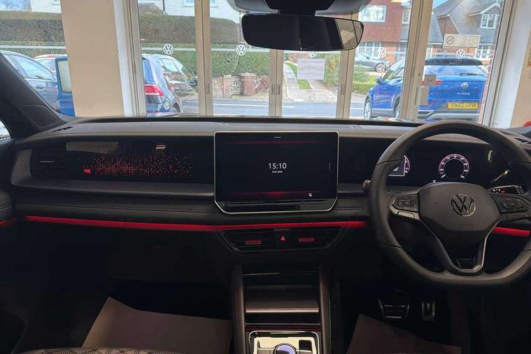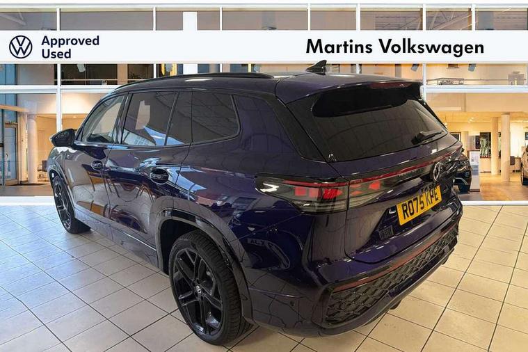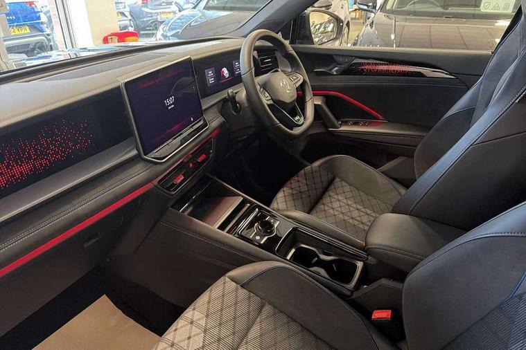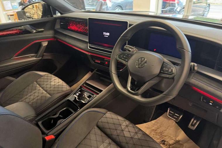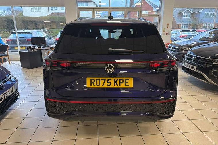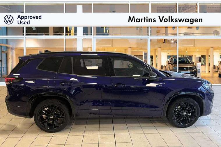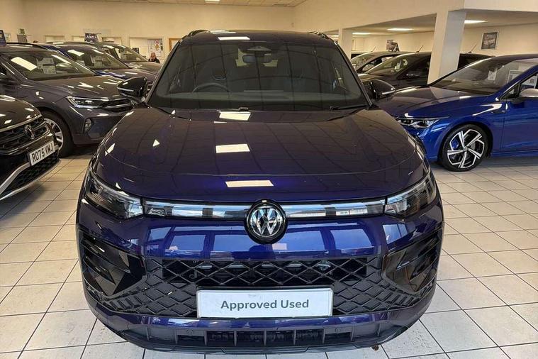 Adaptive cruise control (ACC), Digital Cockpit Pro - 10.25" high resolution dash display screen with customisable menus and information, Driver alert system, Driver attention monitoring system, Dynamic road sign display, E-Sim card for online connectivity, eCall emergency call system, Lane change system, Side assist, Rear traffic alert and Exit warning system, Multifunction front facing camera, Oncoming vehicle braking when turning including swerve support, Progressive steering, Start/stop system with regenerative braking, Voice activation spoken voice commands for telephone and navigation system, Warning signal and warning light for front and rear seatbelts not fastened, Wireless App-Connect, Adaptive chassis control DCC pro includes driving mode selection, Charging cable Mode 2 Type 2 / G (10A), Charging cable Mode 3 Type 2 / 3 (16A), Front shock absorption G08, Front wheel drive, Rear shock absorption, Digital radio reception (DAB), Diversity antenna for FM reception, Air intake with Chrome trim, Auto dimming interior rear view mirror, Automatic headlight control system, Body colour door handles, Chrome moldings on the side windows, Coming/leaving home lighting function, Dynamic headlight range control with dynamic cornering light, Exterior mirrors convex on the left and aspherical on the right, Heat insulating glass in side and rear windows, Illuminated Volkswagen logo rear with animation, Laminated safety glass windshield, heat insulating, LED 3rd brake light, LED separate signature day time running light, Puddle lights, Rain sensor windscreen wipers, Rear fog light on one side, reversing light on both sides, Rear side wing doors, Rear wiper, Reverse activated passenger's door mirror, Surround lighting with welcome light, Tilting and sliding panoramic sunroof with rear panoramic sunroof, Volkswagen logo in front, illuminated lighting animation with wake up/goodbye scenario and illuminated door handles, 10 colour interior ambient lighting, 12V outlet in center console rear and in luggage compartment, 3 rear headrests, 3 rear seat bench in 2nd row, split folding, longitudinally movable and folding with load-through hatch, Black roof lining, Brushed stainless steel pedals, Carpet mats, front and rear, Centre console with illuminated storage compartment with sliding cover and two drinks holders, Chrome elements on the mirror switch and power window switches and door pulls, Door and side trim panel insert in Art velour, Flat luggage compartment floor, Front centre armrest, Front scuff plates in aluminium, ISOFIX anchors for child seats on outer rear seats and front passenger seat compatible with i-Size, Mechanical rear seat release, Power adjustable lumbar support in front, Single front passenger seat, Sports comfort seats in front, Sun visors with illuminated vanity mirrors, Comfort package with park assist pro - Tayron, 3 Point seat belts in front with pretensioners, 3 point seatbelts in outer rear with ECE label, Autonomous emergency braking front assist with pedestrian and cyclist monitoring, Driver and front passenger airbag with front passenger airbag deactivation, Electronic parking brake with auto hold, First aid kit with warning triangle and safety vest, Front and rear curtain airbags, Front and rear side airbags, Front centre airbag, Front disc brakes, Hill start assist, Rear disc brakes, Two tone horn, Decorative material set R-Line, Interior door handle in matte chrome, Tool kit for tyre mobility set, Tyre mobility kit including compressor and sealing foam. In lieu of spare wheel,