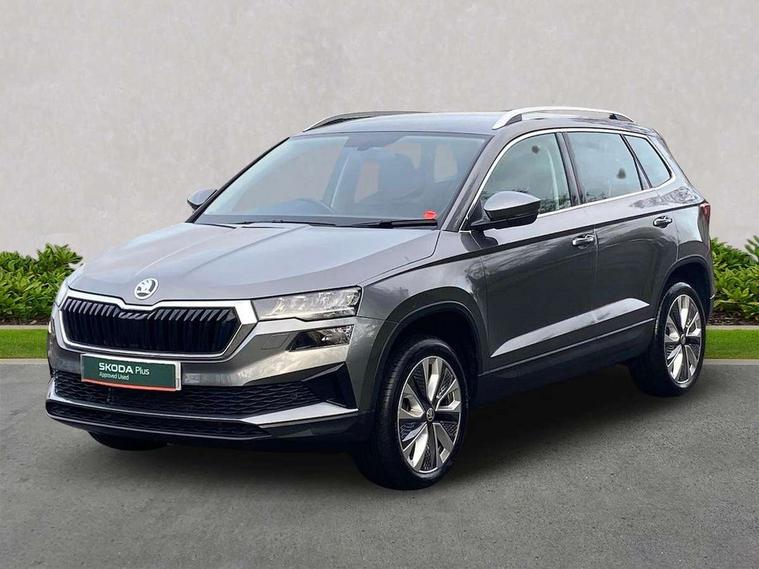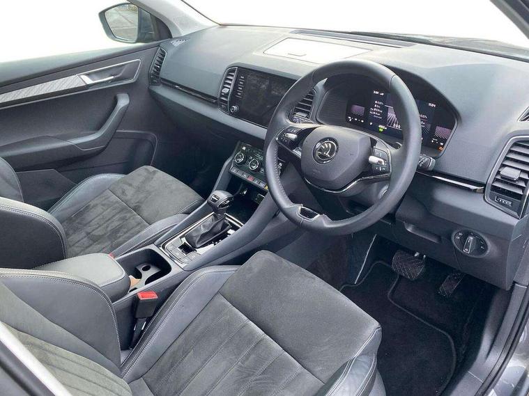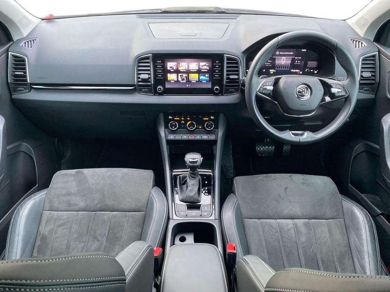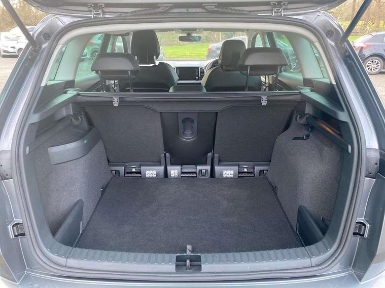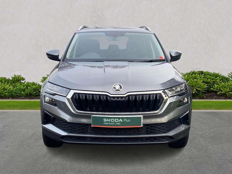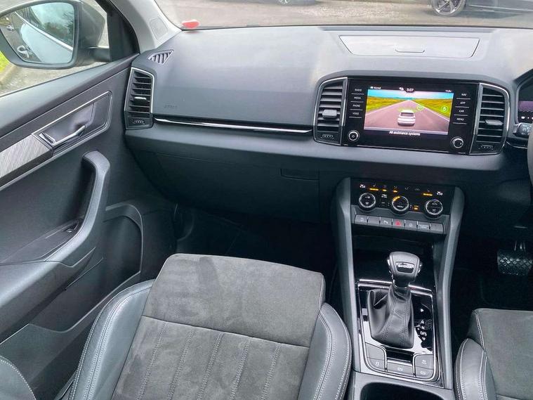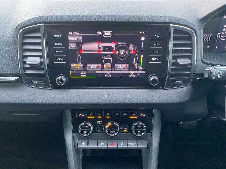 8" Digital display, Care connect, Driver fatigue sensor, Emergency services call system, Outside temperature gauge, Service interval indicator, SmartLink wireless for Apple and wired for Android, Start/stop system with regenerative braking, USB C Port x 2 in front centre console, 8 Speakers, DAB radio with Bluetooth, USB connection, Acoustic glass, Aero front windscreen wipers with intermittent function, Auto dimming rear view mirror with light and rain sensors, Black electric window control buttons, Body colour door mirrors and handles, Dynamic headlight range control with cornering light function, Electric front and rear windows with child proof lock, Heated rear windscreen, LED daytime running lights, LED rear lights with high functionality welcome effect and dynamic indicators, Light assistant (coming/leaving home/tunnel light), Plastic scuff plates, Privacy glass, Rear side wing doors, Rear spoiler, Rear window wiper with washer system and intermittent control, Safety reflectors on front doors, 1.5 litre bottle holders in driver and front passenger door panels, 12V socket in boot, 12v socket in front centre armrest with storage compartment and rear air vents, 2 spoke leather heated multifunction steering wheel with DSG paddles, 2 x Tablet holder, 3 rear height adjustable headrests, 3 seat bench in 2nd row, 4 foldable roof handles with rear coat hooks, Black floor carpet, Chrome inner door handles, Double sided boot floor, Foldable hooks in the boot, Front head restraints, Height adjustable front three point seats belts with tensioners, Height/reach adjust steering wheel, Ice scraper, Illuminated glovebox, Illuminated luggage compartment, Isofix child seat preparation for front passenger seat, Isofix child seat preparation outer rear, Manual lumbar support for front seats, Pen holder, Pollen filter, Rear boot cover, Rear reading lights, Rubbish bin door, Safety vest holder, Single front passenger seat, Storage box in upper central dashboard closed, Sunvisors with illuminated vanity mirrors, Textile floor mats, Ticket holder, VarioFlex seats with standard rear seat release, Boot pack - Karoq, Design Pack - Karoq, Parking pack - Karoq, Automatic door unlocking in case of crash, Automatic fuel cut off in case of crash, Child locks on rear doors, Driver airbag, Electronic parking brake with auto hold function, Emergency rear braking signal, ESC including ABS, MSR, ASR, EDS, HBA, DSR, RBS, MKB and traction control, Front side airbags, Hill hold control, Knee airbags, Passenger airbag with switch-off function, Pedestrian monitor, Seatbelt reminder signalisation and pretensioner for all seats, Three point seatbelts rear, Two tone horn, Tyre pressure display, Tyre pressure monitor, Alarm with interior monitoring, back up horn and tilt sensor with safe function, Electronic engine immobiliser, Keyless entry and start/stop, Remote central locking with 2 remote folding keys, Chrome framed air vents, 18" Miran alloy wheels in black, Anti-theft wheel bolts protection, Tool kit,