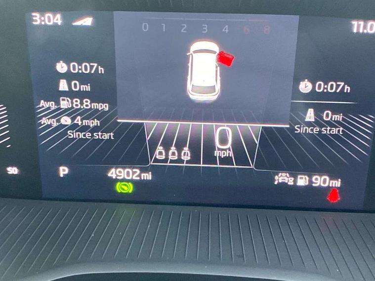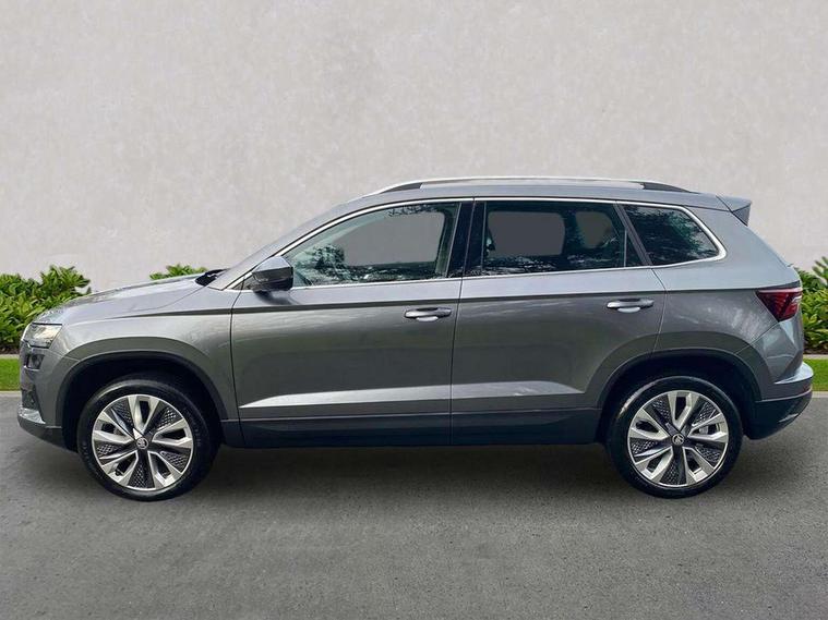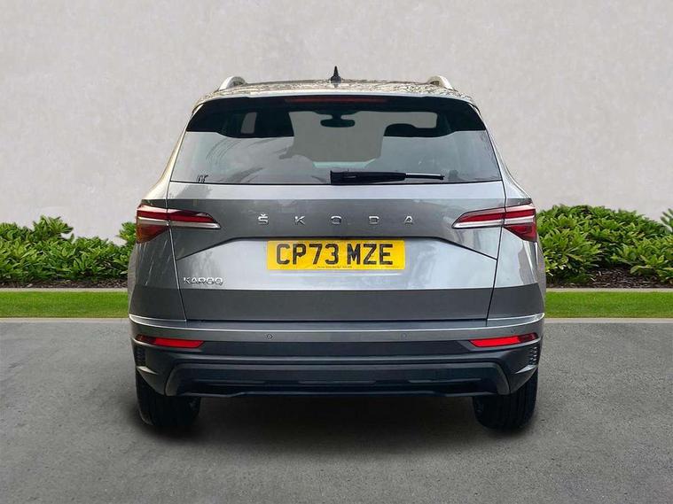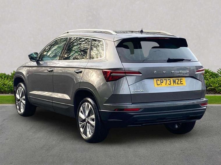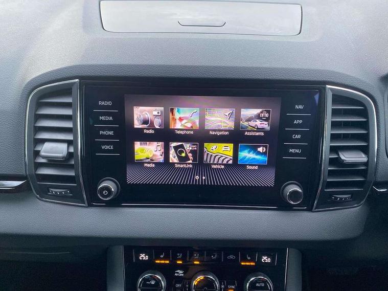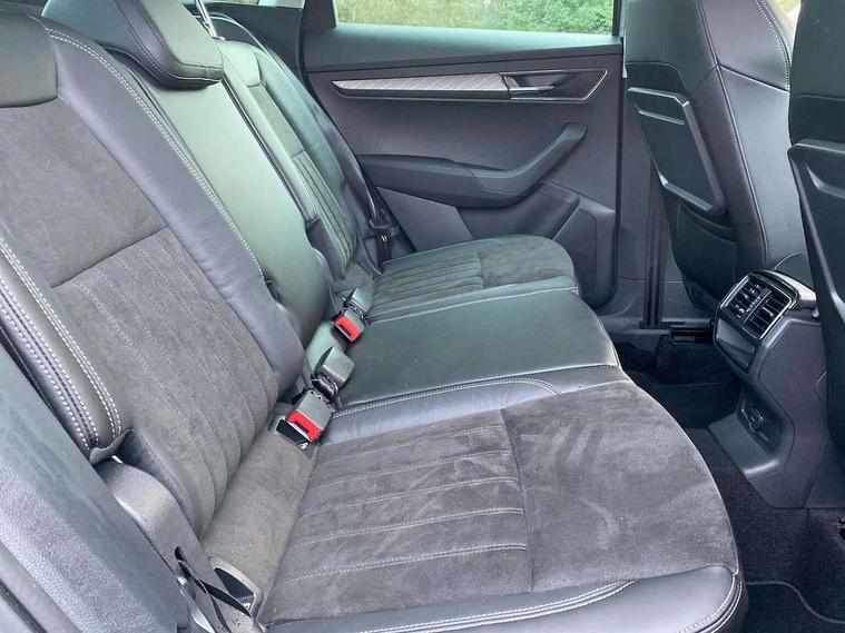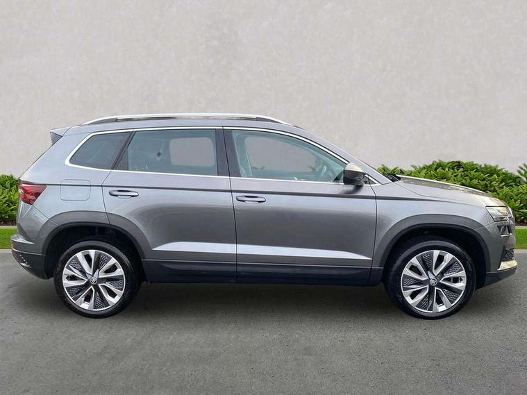 8" Digital display, Care connect, Driver fatigue sensor, Emergency services call system, Outside temperature gauge, Service interval indicator, SmartLink wireless for Apple and wired for Android, Start/stop system with regenerative braking, USB C Port x 2 in front centre console, 8 Speakers, DAB radio with Bluetooth, USB connection, Acoustic glass, Aero front windscreen wipers with intermittent function, Auto dimming rear view mirror with light and rain sensors, Black electric window control buttons, Body colour door mirrors and handles, Dynamic headlight range control with cornering light function, Electric front and rear windows with child proof lock, Heated rear windscreen, LED daytime running lights, LED rear lights with high functionality welcome effect and dynamic indicators, Light assistant (coming/leaving home/tunnel light), Plastic scuff plates, Privacy glass, Rear side wing doors, Rear spoiler, Rear window wiper with washer system and intermittent control, Safety reflectors on front doors, 1.5 litre bottle holders in driver and front passenger door panels, 12V socket in boot, 12v socket in front centre armrest with storage compartment and rear air vents, 2 spoke leather heated multifunction steering wheel with DSG paddles, 2 x Tablet holder, 3 rear height adjustable headrests, 3 seat bench in 2nd row, 4 foldable roof handles with rear coat hooks, Black floor carpet, Chrome inner door handles, Double sided boot floor, Foldable hooks in the boot, Front head restraints, Height adjustable front three point seats belts with tensioners, Height/reach adjust steering wheel, Ice scraper, Illuminated glovebox, Illuminated luggage compartment, Isofix child seat preparation for front passenger seat, Isofix child seat preparation outer rear, Manual lumbar support for front seats, Pen holder, Pollen filter, Rear boot cover, Rear reading lights, Rubbish bin door, Safety vest holder, Single front passenger seat, Storage box in upper central dashboard closed, Sunvisors with illuminated vanity mirrors, Textile floor mats, Ticket holder, VarioFlex seats with standard rear seat release, Boot pack - Karoq, Design Pack - Karoq, Parking pack - Karoq, Automatic door unlocking in case of crash, Automatic fuel cut off in case of crash, Child locks on rear doors, Driver airbag, Electronic parking brake with auto hold function, Emergency rear braking signal, ESC including ABS, MSR, ASR, EDS, HBA, DSR, RBS, MKB and traction control, Front side airbags, Hill hold control, Knee airbags, Passenger airbag with switch-off function, Pedestrian monitor, Seatbelt reminder signalisation and pretensioner for all seats, Three point seatbelts rear, Two tone horn, Tyre pressure display, Tyre pressure monitor, Alarm with interior monitoring, back up horn and tilt sensor with safe function, Electronic engine immobiliser, Keyless entry and start/stop, Remote central locking with 2 remote folding keys, Chrome framed air vents, 18" Miran alloy wheels in black, Anti-theft wheel bolts protection, Tool kit,