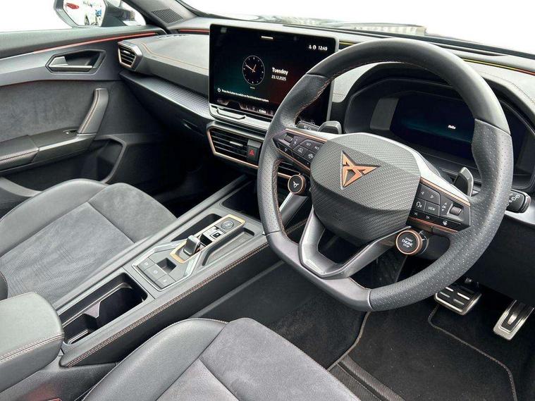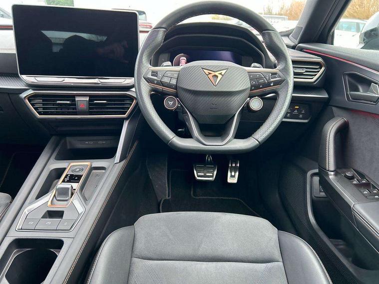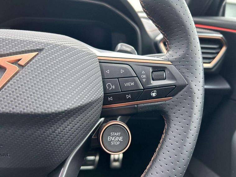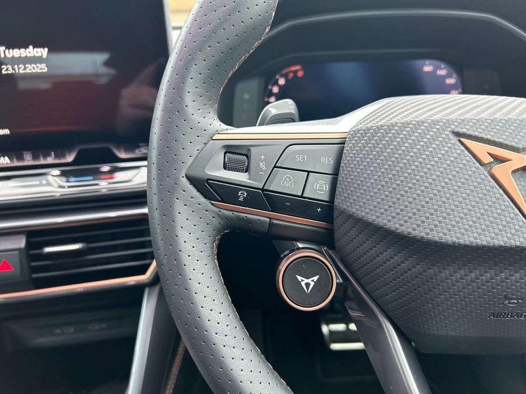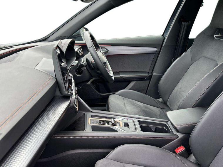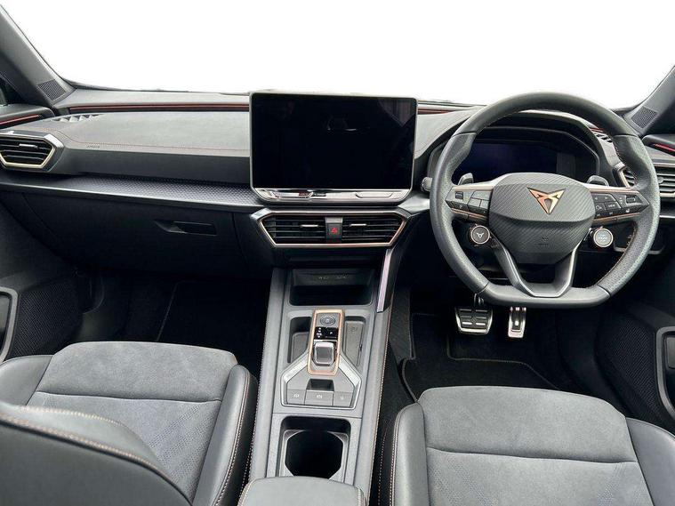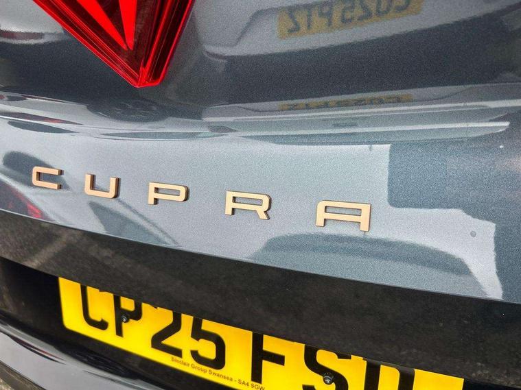 10.25" digital cockpit and configurable dashboard, Adaptive cruise control with follow-to-stop and speed limiter, Advanced driver alert system, Driving profile selection, Dynamic road sign display, Emergency steering support with turn assist, Forward collision warning with automatic braking, Front and rear parking sensors, Full link phone integration, Lane assist, Progressive steering, Rear view camera, RPM, trip computer, outside temp gauge, instrument light brightness, low fuel warning light, lights on reminder, gearshift indicator, Service interval indicator, Start/stop system with regenerative braking, Virtual pedal and electric tailgate, Voice control system, Wired Android Auto, Wireless apple carplay, Wireless phone charger, CUPRA sport suspension, Electronic locking differential and dynamic traction support, 2 front and 2 rear USB type C sockets, Media system with navigation, 12.9" touchscreen display, voice control, DAB, steering wheel mounted controls, Auto dimming rear view mirror, Body colour door handles, Body coloured bumpers, Dark grey wing mirror, Daytime running light with automatic headlight control and coming home feature, Door panel ambient lighting, Dynamic headlight range control, Electric front/rear windows, Electrically adjustable heated and folding door mirrors with memory function, Gloss black roof rails and window surrounds, High beam assist, LED 3rd brake light, LED front fog lamps with cornering function, LED Headlights, LED Taillights with dynamic indicator, Rain sensing wipers, Rear diffuser with black simulated exhaust pipes, Rear fog lights, Rear side wing doors, Rear wash/wipe, Tinted rear windows, Welcome lights (within exterior mirror housing), 12V socket, 2 front and 2 rear reading lights, 3 seat bench in 2nd row, 60/40 split rear bench seat with armrest and mechanical seat release, Black headlining, Black interior roof lining, Cupra sports pedals, Dust/pollen filter, Electrically adjustable driver's seat with memory and lumbar support, Front and rear head restraints, Front centre armrest, Heated front seats, Heated supersports multifunction leather steering wheel with satellite buttons and gear shift paddles, Height/reach adjust steering wheel, Illuminated aluminium doorsteps, Illuminated interior front door sills, Illuminated sunvisor with mirror, Isofix, Leather dashboard, door insert and side trim panel, LED smart wraparound lighting, PVC/Dinamica microfiber upholstery + bucket seats, Satellite steering wheel, Single front passenger seat, Storage pockets on rear of front seats, Three zone climate control with control panel in rear, Variable luggage/load compartment floor, 3 point seatbelts on all rear seats, ABS, Brake control system - ESC and brake booster, Child proof door locks, Driver and front passenger airbags with front passenger airbag de-activation, Electronic parking brake, Front and rear disc brakes, Front side curtain airbags, Hill hold control, Public e-call, Seat belt reminder for front and rear seats, Tyre pressure monitoring system, Anti theft alarm system, KESSY Advanced - Keyless start, keyless entry with SAFELOCK, Locking wheel bolts, Copper and aluminium interior detailing, 19" Sandstorm machined sport black and silver alloy wheels,