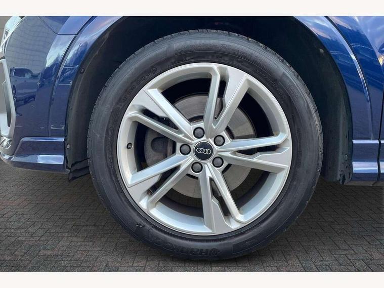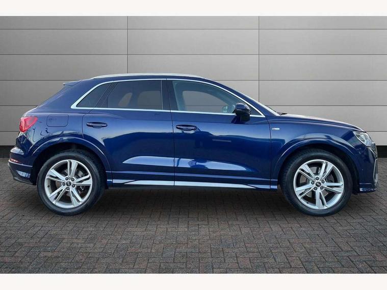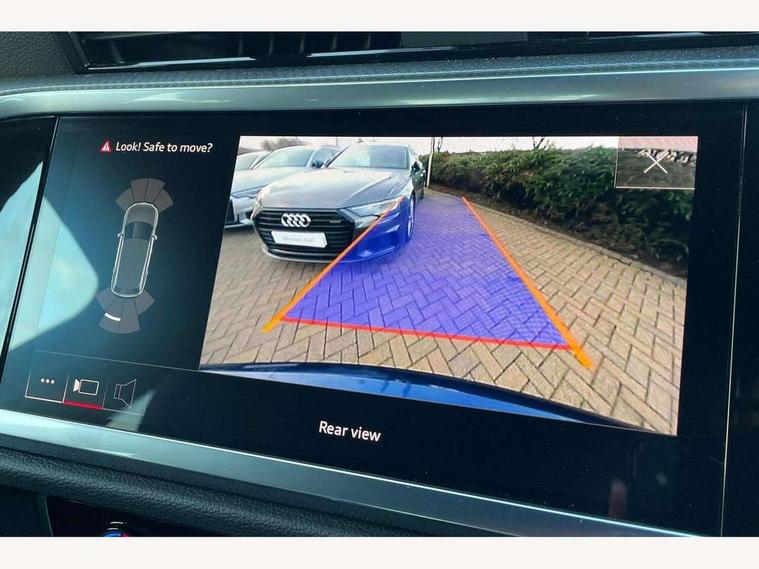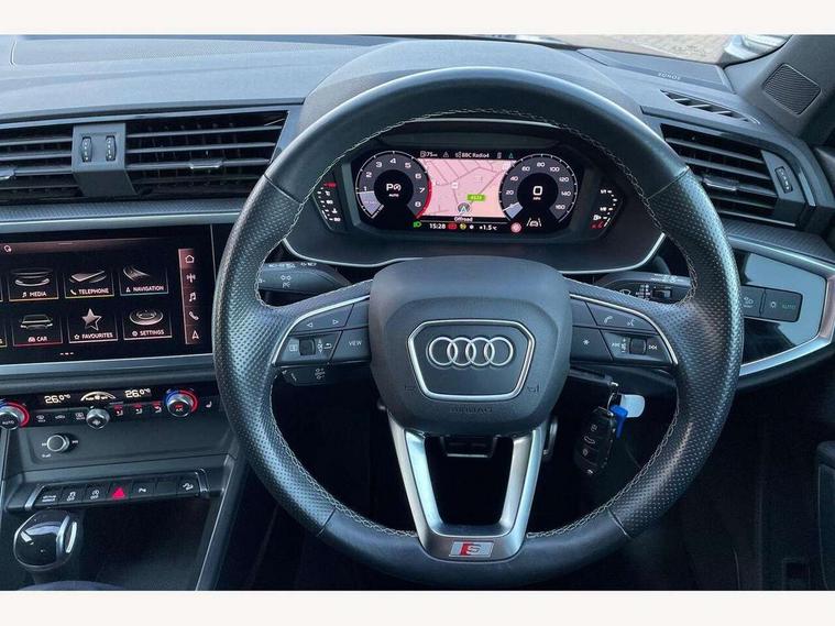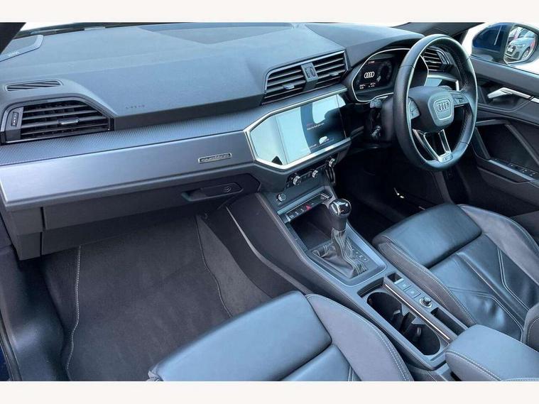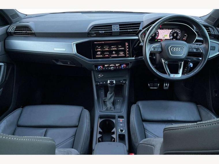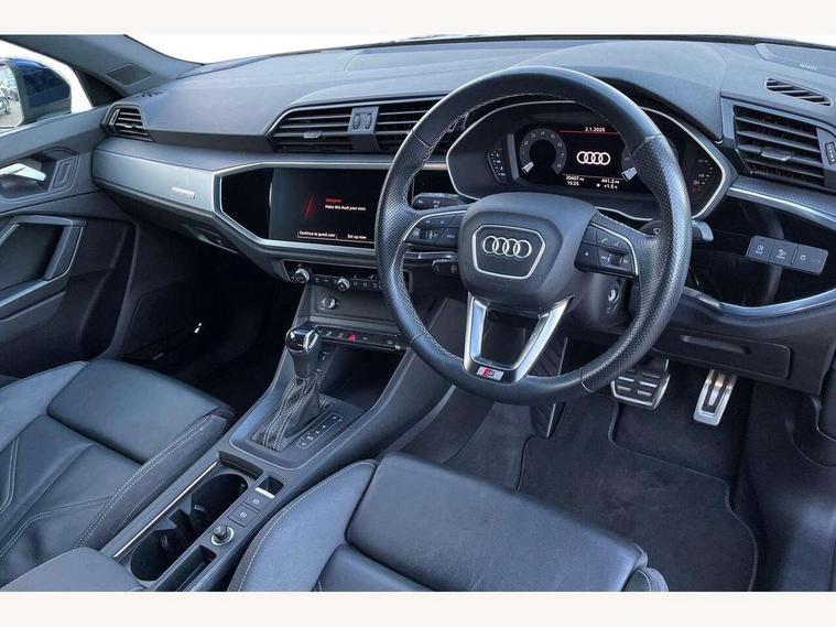 Amazon alexa Integration, Audi connect safety and service (e-call), Audi drive select, Audi lane departure warning, Audi Virtual Cockpit - 10.25" display, Bluetooth interface, Camera based traffic sign recognition, MMI Navigation Plus with high resolution 10.1 inch touchscreen colour display, Power operated tailgate, Progressive steering, Service interval indicator, Smartphone interface includes wireless Apple carplay/Android Auto, Start stop system with recuperation, Voice control system with natural language interaction, Sports suspension, 2 USB-C ports with charge and data functions, 6 passive loudspeakers, DAB digital radio module, Acoustic windscreen, Aluminium roof rails, Aluminium window trim, Auto dimming frameless rear view mirror, Body coloured bumpers, Electrically folding, adjustable and heated door mirrors with integrated LED side indicators and kerb view function for passenger side, Front and rear electric windows, Front fog lights, Front side air inlets in matt platinum grey, Front spoiler blade in matt platinum grey, Grille vertical bars in aluminium silver/Matt, High gloss black finish B and C pillars, LED headlights with LED daytime running lights, LED rear lights, LED third brake light, Privacy glass dark tinted rear and rear-side windows (from B-pillar backwards), Rain and light sensors, Rear diffuser strip in matt titanium black, Rear side wing doors, Rear wiper, S line badges on front wings, S Line front and rear bumpers, Side skirt insert in matt Platinium grey, Silver chrome grille surround, Tinted rear windows, Titanium black radiator grille, Variable front intermittent wipers, 12V socket in rear centre console, 3 seat bench in 2nd row, 40:20:40 folding with manual adjustment for 60:40 forwards/backwards position and backrest angle, Adjustable rear seat bench/backrest with centre armrest and cupholder, Black cloth headlining, Dual zone electronic climate control, Front and rear black floor mats with contrast stitching in rock grey, Front and rear headrests, Front and rear roof module including reading lights, Front centre armrest, Glove compartment lighting, Height and reach adjustable steering wheel, Illuminated door sill trims with S logo, ISOFIX child seat mounting for front passenger with airbag deactivation and outer rear seat including top tether attachment point for outer rear seats, Luggage compartment light, Manual front seats with height adjustment, Perforated leather gearknob, Single front passenger seat, Stainless steel luggage compartment sill finisher, Stainless steel pedals, Non smoking pack - Q3, 3x3 point rear seatbelts, 6 airbags - Driver, front passenger, curtain and side windows, Audi pre-sense front with pedestrain and cyclist recognition, Electrically operated child locks on rear doors, Electromechanical parking brake, Electronic stabilisation control including ABS, ASR and EDL, Front seatbelt reminder, Hill descent control, Hill hold assist, Pre sense basic, Seatbelt monitoring, Tyre pressure warning, Warning triangle and first aid kit, Anti theft alarm, Anti theft wheel bolts, Immobiliser, Remote central locking, Dark matt brushed aluminium inlay, Detail dashboard around MMI touch colour display in glass look, black with surround in aluminium look, Leatherette door armrest,