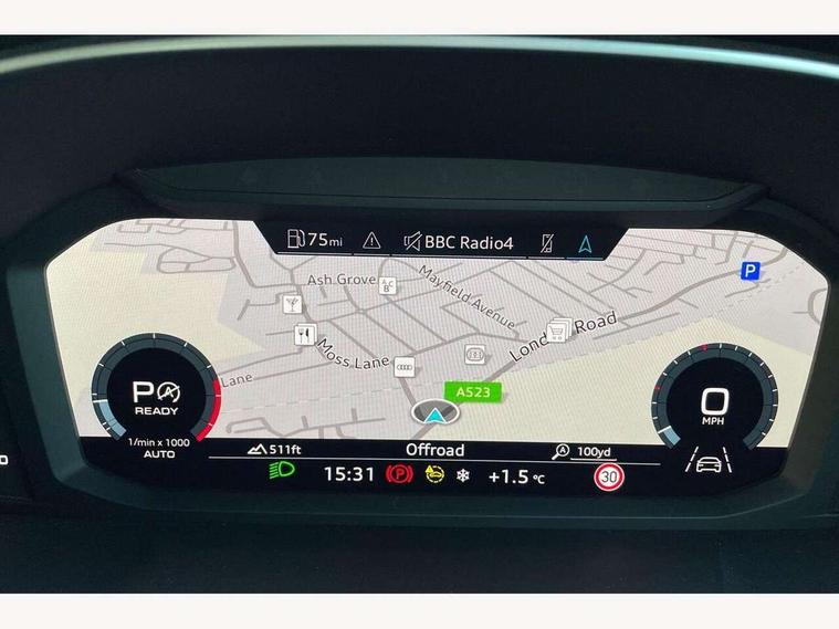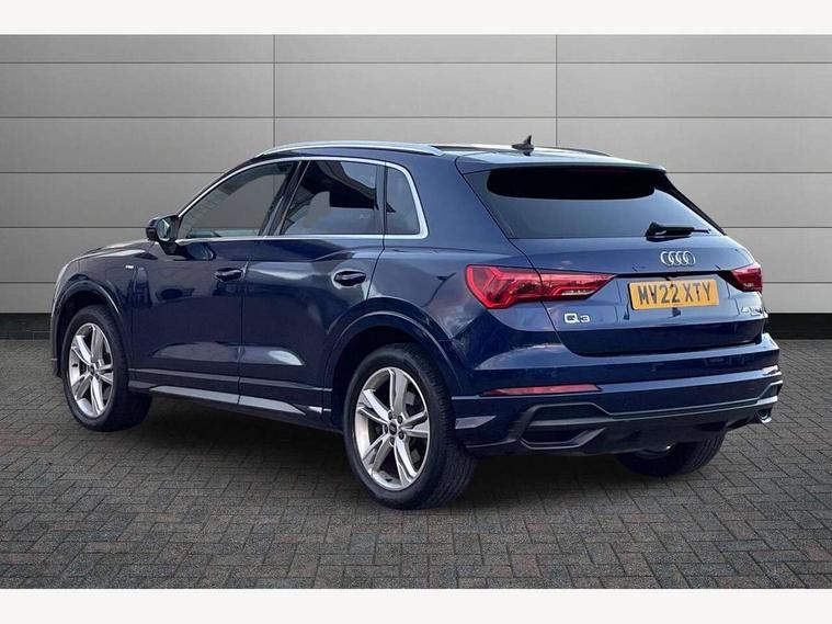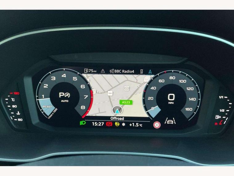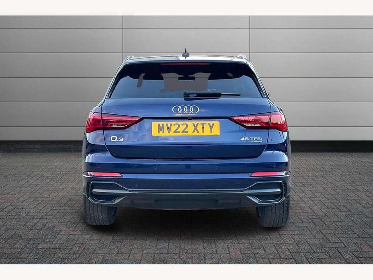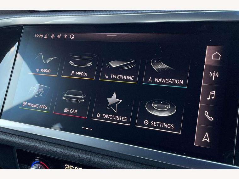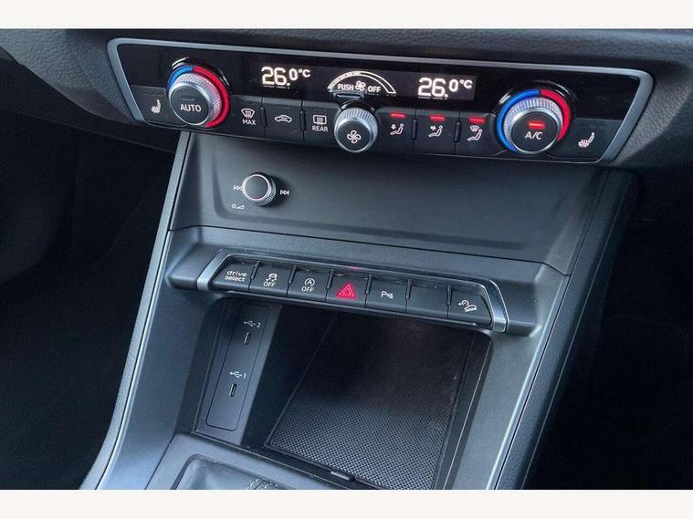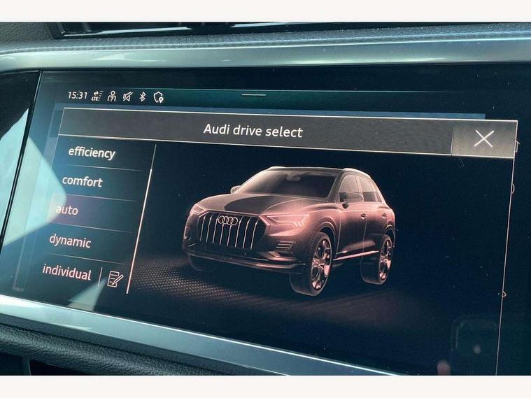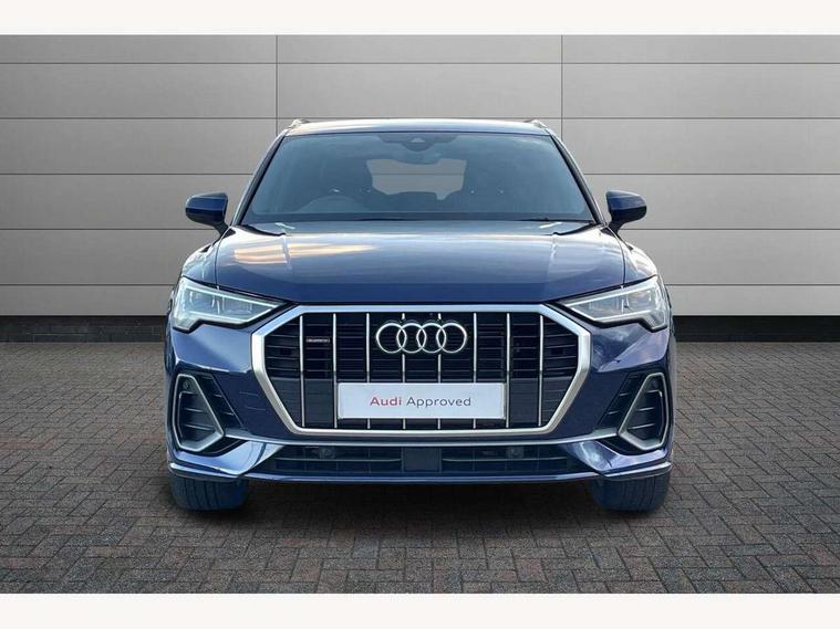 Amazon alexa Integration, Audi connect safety and service (e-call), Audi drive select, Audi lane departure warning, Audi Virtual Cockpit - 10.25" display, Bluetooth interface, Camera based traffic sign recognition, MMI Navigation Plus with high resolution 10.1 inch touchscreen colour display, Power operated tailgate, Progressive steering, Service interval indicator, Smartphone interface includes wireless Apple carplay/Android Auto, Start stop system with recuperation, Voice control system with natural language interaction, Sports suspension, 2 USB-C ports with charge and data functions, 6 passive loudspeakers, DAB digital radio module, Acoustic windscreen, Aluminium roof rails, Aluminium window trim, Auto dimming frameless rear view mirror, Body coloured bumpers, Electrically folding, adjustable and heated door mirrors with integrated LED side indicators and kerb view function for passenger side, Front and rear electric windows, Front fog lights, Front side air inlets in matt platinum grey, Front spoiler blade in matt platinum grey, Grille vertical bars in aluminium silver/Matt, High gloss black finish B and C pillars, LED headlights with LED daytime running lights, LED rear lights, LED third brake light, Privacy glass dark tinted rear and rear-side windows (from B-pillar backwards), Rain and light sensors, Rear diffuser strip in matt titanium black, Rear side wing doors, Rear wiper, S line badges on front wings, S Line front and rear bumpers, Side skirt insert in matt Platinium grey, Silver chrome grille surround, Tinted rear windows, Titanium black radiator grille, Variable front intermittent wipers, 12V socket in rear centre console, 3 seat bench in 2nd row, 40:20:40 folding with manual adjustment for 60:40 forwards/backwards position and backrest angle, Adjustable rear seat bench/backrest with centre armrest and cupholder, Black cloth headlining, Dual zone electronic climate control, Front and rear black floor mats with contrast stitching in rock grey, Front and rear headrests, Front and rear roof module including reading lights, Front centre armrest, Glove compartment lighting, Height and reach adjustable steering wheel, Illuminated door sill trims with S logo, ISOFIX child seat mounting for front passenger with airbag deactivation and outer rear seat including top tether attachment point for outer rear seats, Luggage compartment light, Manual front seats with height adjustment, Perforated leather gearknob, Single front passenger seat, Stainless steel luggage compartment sill finisher, Stainless steel pedals, Non smoking pack - Q3, 3x3 point rear seatbelts, 6 airbags - Driver, front passenger, curtain and side windows, Audi pre-sense front with pedestrain and cyclist recognition, Electrically operated child locks on rear doors, Electromechanical parking brake, Electronic stabilisation control including ABS, ASR and EDL, Front seatbelt reminder, Hill descent control, Hill hold assist, Pre sense basic, Seatbelt monitoring, Tyre pressure warning, Warning triangle and first aid kit, Anti theft alarm, Anti theft wheel bolts, Immobiliser, Remote central locking, Dark matt brushed aluminium inlay, Detail dashboard around MMI touch colour display in glass look, black with surround in aluminium look, Leatherette door armrest,