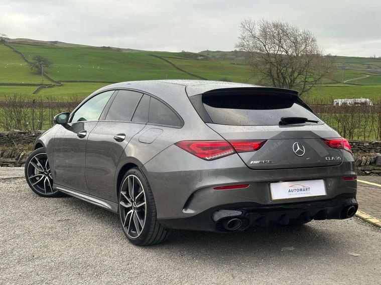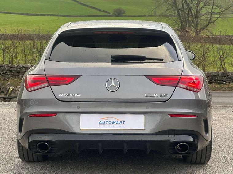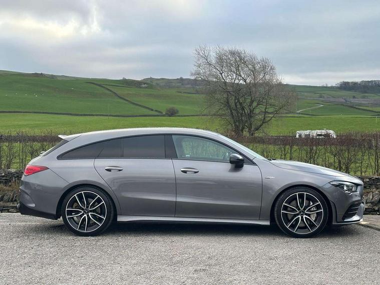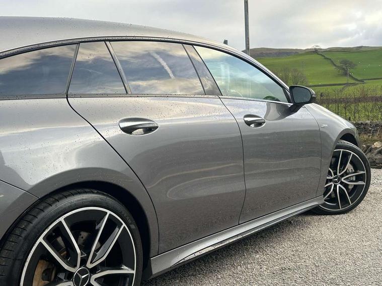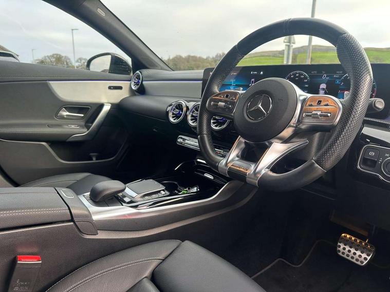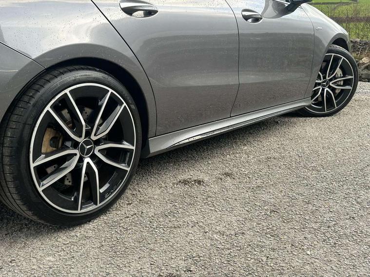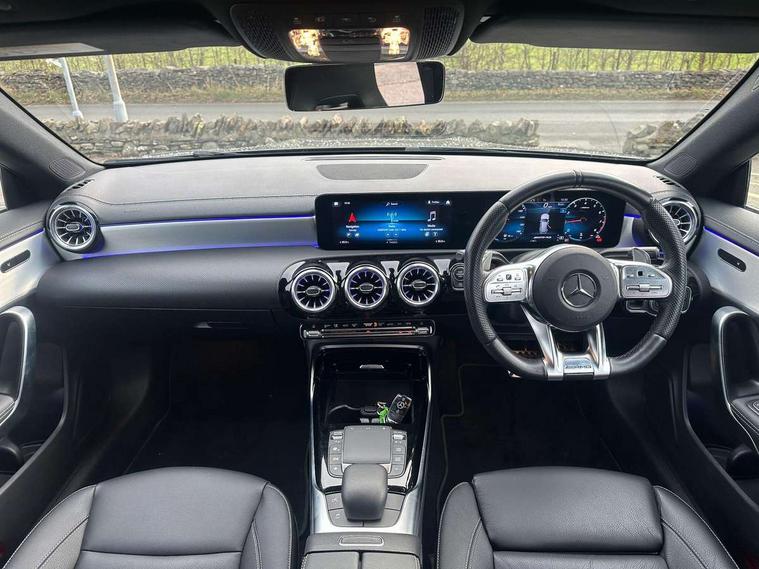 10.25 inch Instrument display with digital cockpit, 10.25 inch touchscreen central media display, Active lane keeping assist, Attention assist - Monitors steering behaviour and long journey fatigue, Bluetooth connection, Car wash mode, Cruise control with limiter, Direct steer system with speed sensitive power steering, DYNAMIC SELECT with driving programs (Slippery, Comfort, Sport, Sport+ and Individual), ECO start/stop function, Fluid level warning indicator for fuel, oil, coolant and washer fluid, Hard-disk navigation, Hey Mercedes Voice activation, Lamp failure indicator, Mercedes me connect including emergency call system, accident recovery, breakdown and maintenance management, Mercedes me remote services, Outside temperature gauge, Owners manual and service booklet in English, Pre-installation of private car share, Preinstallation for Mercedes Benz link, Radio aerial integrated into front and rear windshields, Service indicator (ASSYST), Smartphone integration with Apple CarPlay and Android auto, Speed limit assist, Trip computer in multifunction display with current consumption indicator, 4MATIC permanent four wheel drive, AMG suspension, Rear axle multi-link, DAB digital radio tuner, MBUX multimedia system, Mid-range sound system, USB (type C) ports (2) in stowage compartment and 1 in front of centre console, Adaptive brake lights, AMG body styling with AMG front apron and rear apron and visible exhaust tailpipe in chrome trim elements, AMG bodystyling side skirts, AMG Front apron with flics as air deflector elements on the outer air intakes, AMG radiator grille with twin blade lamella and AMG Lettering, AMG Rear apron with specific diffuser look with four vertical fins and two round chrome plated tailpipe trim elements with a diameter of 90 mm, AMG Sports exhaust system with two round tailpipes measuring 90 mm in diameter attached in rear apron, AMG lettering plus ribbing on the inside of the, Automatically controlled exhaust flap, Beltline strips in High gloss Black, Body colour bumpers, Body colour door handles, Chrome weather strip, Electric windows, Electrically adjustable and heated door mirrors with integrated LED indicators, Front splitter and trim elements on the louvres in the outer air inlets in silver chrome, Front wings with TURBO 4MATIC lettering, Headlamp assist automatic headlamp activation, Heated glass rear windscreen + timer control, High level LED third brake light, Interior mirror with black reading lamps and frameless, LED high performance headlamps with integrated LED daytime running lights, LED tail lamp, Privacy glass with dark tinting on rear side windows and rear window, Rain sensing windscreen wipers with two sensitivity settings, Rear fog lamp, Rear side wing doors, Rear wiper, Window line trim strip in high gloss black, 3 seat bench in 2nd row, 40:20:40 split folding rear seat backrests, Air conditioning - Two zone thermotronic luxury automatic climate control with display, Air vents with surround in silver chrome, AMG Performance steering wheel in nappa leather, Automatic child seat recognition sensor, Black roof lining, Brushed stainless steel sports pedals with rubber studs, Floor mats with stitched AMG lettering, Front centre armrest with stowage, Heated front seats, Illuminated front door sills with changeable cover, Illuminated glove compartment stowage, Interior lighting - 64 colour Ambient lighting, Luggage net on driver/front passenger seat backrest, Manually adjustable front seats, Manually height and reach adjustable steering column, Rear armrest with two integral cup holders for drinks, Rear head restraints, Silver coloured aluminium gear shift paddles on steering wheel, Single front passenger seat, Sport seats with fixed head restraints, Stowage compartment in centre console with retractable cover, Sunvisors with illuminated vanity mirrors, Touchpad on center console, Twin front cupholders, Two outer rear seat isofix and top tether child seat fixing points, AMG Night package - CLA 35/45, Keyless go pack - CLA, Light and sight pack - CLA, Mirror pack - CLA, Parking package - CLA, Seat comfort pack - CLA, Active bonnet pedestrain safety measure which detects an impact and raises bonnet by 65mm, Active brake assist includes forward collision warning system with autonomous braking, Adaptive brake assist with hold function and hill start assist, Anti lock braking system (ABS) with brake assist, Black seat belts, Bonnet with power domes, Brake pad wear warning indicator, Childproof locks manually operated for rear doors and electrically operated for rear power windows, Crash responsive emergency lighting, Driver and front passenger head and sidebags, Driver and front passenger windowbags, Drivers knee airbag, Dual stage driver and front passenger airbags, Electric parking brake, Electronic stability programme with acceleration skid control, ESP curve dynamic assist, Front and rear seatbelt reminder, Front brake calipers with AMG lettering, Front passenger seat occupancy sensor, Perforated front brake discs, Three point rear seat belts, Tyre pressure monitoring system, Warning triangle and first aid kit, Remote central locking and crash sensor with emergency opening function, Urban guard vehicle protection system with immobiliser and interior protection, Light aluminium with longitudinal grain interior trim, 19" AMG multi-spoke high gloss black painted light alloy wheels with high sheen finish, Summer tyres, Tirefit tyre sealant kit, Wheel arches wider for AMG wheels,