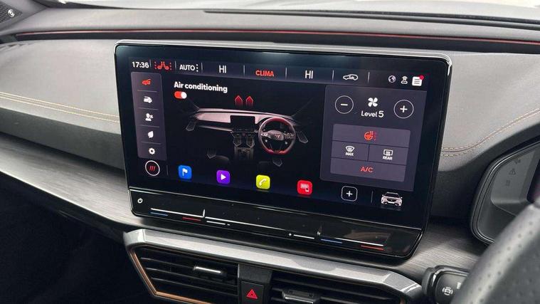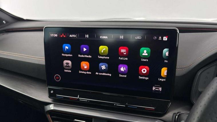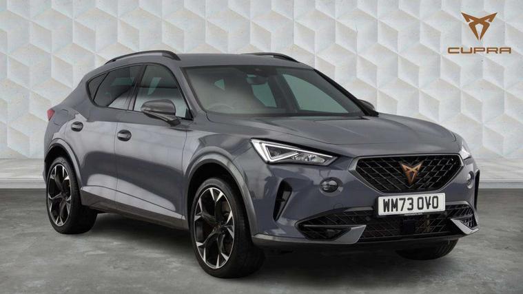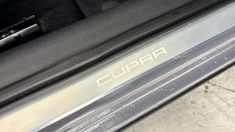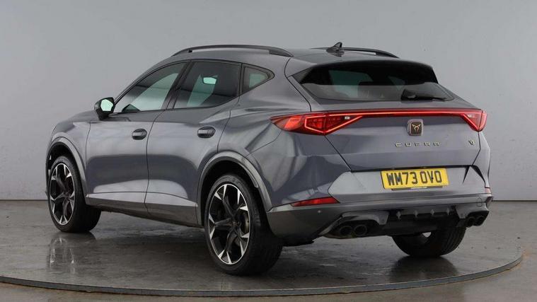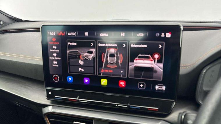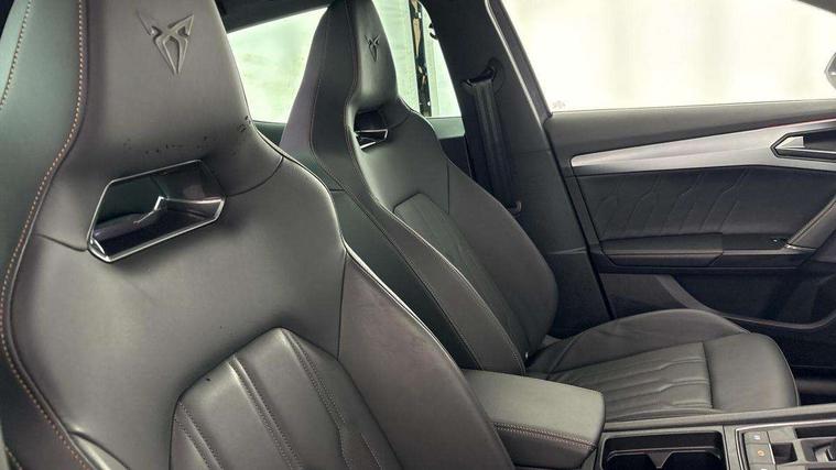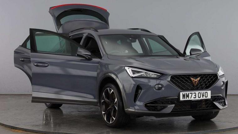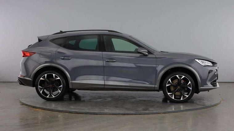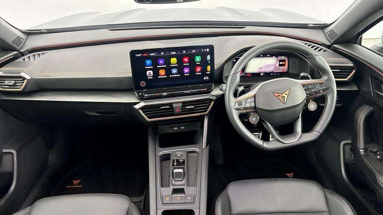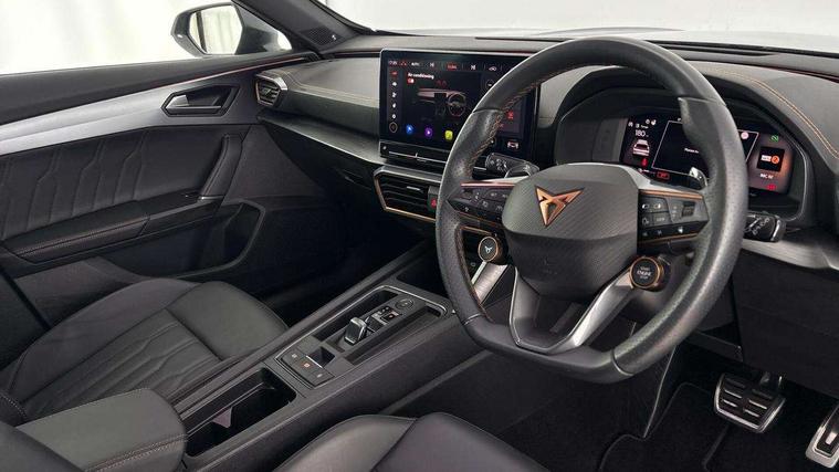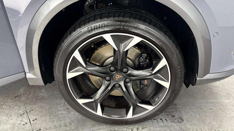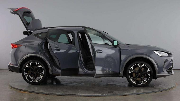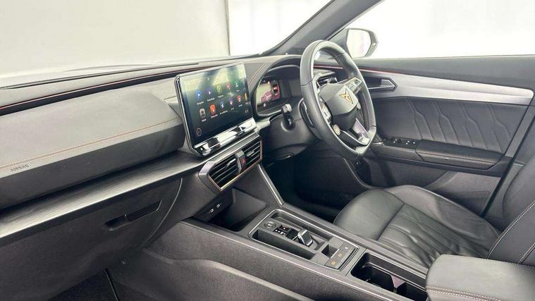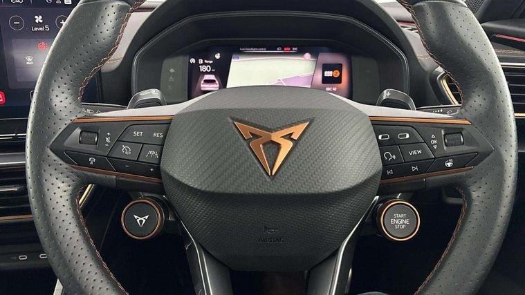 Digital cockpit and configurable dashboard, Driver alert system, Dynamic chassis control with driving profile selection (Comfort, Sport, CUPRA, Individual), Forward collision warning with automatic braking, Lane assist, Navigation system with 12'' Touchscreen Display, Park assist (inc front/rear parking sensors), Predictive adaptive cruise control with speed limiter, RPM, trip computer, outside temp gauge, instrument light brightness, low fuel warning light, lights on reminder, gearshift indicator, Service interval indicator, Speed sensitive power steering, Start/stop system with regenerative braking, Virtual pedal and electric tailgate, Voice control system, Wired Android Auto, Wireless apple carplay, Wireless phone charger, Electronic locking differential and dynamic traction support, Sports suspension with front shock absoption, 2 front and 2 rear USB type C sockets, Auxiliary input socket, DAB radio, Auto dimming rear view mirror, Body colour door handles, Body coloured bumpers, Dark grey wing mirror, Daytime running light with automatic headlight control and coming home feature, Dynamic headlight range control, Electric front/rear windows, Electrically adjustable heated and folding door mirrors with memory function, Front fog lamps with cornering function, Gloss black roof rails and window surrounds, LED Headlights, LED Taillights with dynamic indicator, Rain sensing wipers, Rear diffuser with twin exhaust pipe on each side, Rear side wing doors, Rear wash/wipe, Sports bumpers, Third brake light, Tinted rear windows, VZ logo rear badging, Welcome lights, 12v power supply in centre console, 12V socket, 12v socket in loadspace, 2 front and 2 rear reading lights, 230V socket, 3 seat bench in 2nd row, 60/40 split rear bench seat with armrest and mechanical seat release, Black headlining, Cupra sports pedals, Dust/pollen filter, Front and rear head restraints, Front centre armrest, Height/reach adjust steering wheel, Illuminated interior front door sills, Illuminated sunvisor with mirror, Isofix, Leather heated multi-function sports steering wheel with start stop, CUPRA mode button and gear shift paddles, Luggage tie-down hooks, Single front passenger seat, Three zone climate control with control panel in rear, Variable luggage/load compartment floor, Wraparound lighting, Genuine Nappa leather Pack - Cupra, Safety and driving pack (XL) - Formentor, 3 point seatbelts on all rear seats, ABS, Brake control system - ESC and brake booster, Child proof door locks, Driver and front passenger airbags with front passenger airbag de-activation, Electronic parking brake, Front and rear disc brakes, Front side curtain airbags, Hill hold control, Public e-call, Seat belt reminder for front and rear seats, Tyre pressure monitoring system, Anti theft alarm system, Keyless entry and start system (KESSY), Locking wheel bolts, Copper and aluminium interior detailing, 19" 'Exclusive' machined sport matte black and silver alloy wheels, Space saver spare wheel,