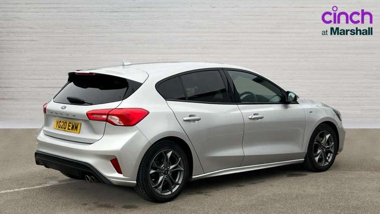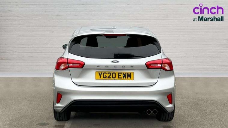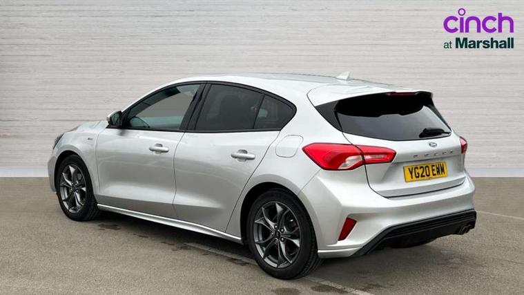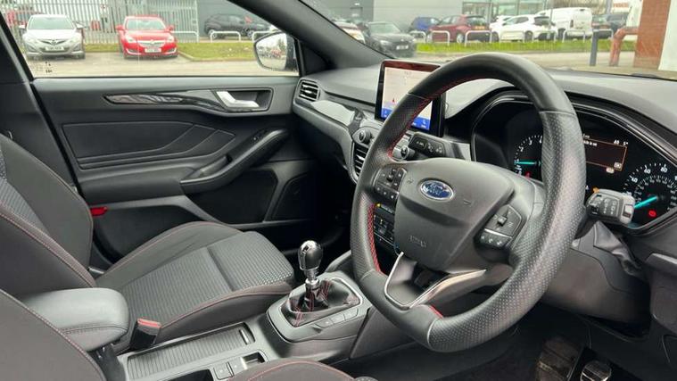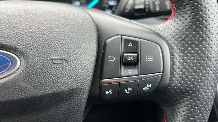 Bluetooth system, Digital clock, Easy fuel capless refuelling system, Eco mode, Ford pass connect, Ford SYNC 3 with 8" TFT touchscreen, and app link Android auto/Apple carplay, Intelligent speed assist, Lane keeping aid with lane departure warning, PAS, Selectable drive mode, Trip computer, Sports tuned suspension, 6 speakers, Aux input, 'Quickclear' heated windscreen/heated washer jets, Auto headlamps (on/off), Body colour large rear spoiler, Body colour side skirt, Body coloured bumpers, Body coloured door handles, Body coloured electrically operated and heated door mirrors with side indicators, Electrically operated front and rear windows with one touch opening and closing, Front variable intermittent wipers with electric wash, Halogen reflector headlamps, Heated rear window, LED daytime running lamp, LED front fog lamps with cornering function, Polished twin tailpipe, ST-Line upper and lower grille with full body styling kit and wing badges, Tailgate wash/wipe, 3 spoke flat bottomed leather steering wheel with red stitching, 60/40 split back and cushion rear seats with 2 height adjustable headrests, Alloy finish pedals, Aluminium gear knob, Centre console with armrest, Cloth upholstery with red stitching, Dark headliner, Driver's lumbar support, Front floor mats, Height adjustable front headrests, Isofix child seat preparation, Manual air conditioning, Reach + rake adjustable steering column, Rear centre headrest, ABS+Electronic Brake force Distribution, Auto hold function, Driver airbag, Electronic parking brake, Electronic stability control, Front and rear seatbelt reminder, Front inertia reel height adjustable seatbelts with pre-tensioners, Front passenger airbag, Front side airbags, Hill start assist, Passenger airbag deactivate switch, Post collision braking, Pre collision assist with autonomous emergency braking and pedestrian/cyclist detection, Side curtain airbags, Three rear inertia reel lap/diagonal seatbelts, Tyre pressure monitoring system, Keyless start with 'Ford Power' starter button, MyKey system, Remote central locking & engine immobiliser, Thatcham category 1 alarm, Contrast stitching - Red, 17" 5x2 spoke alloy wheels with rock metallic finish, Mini steel spare wheel,
