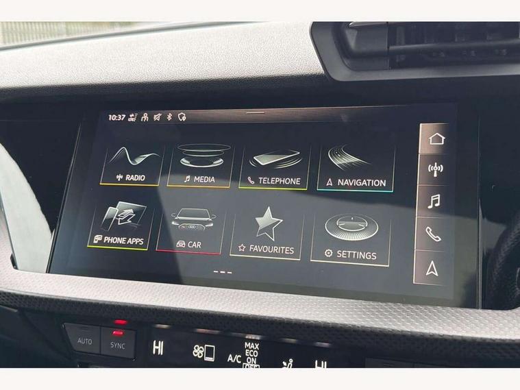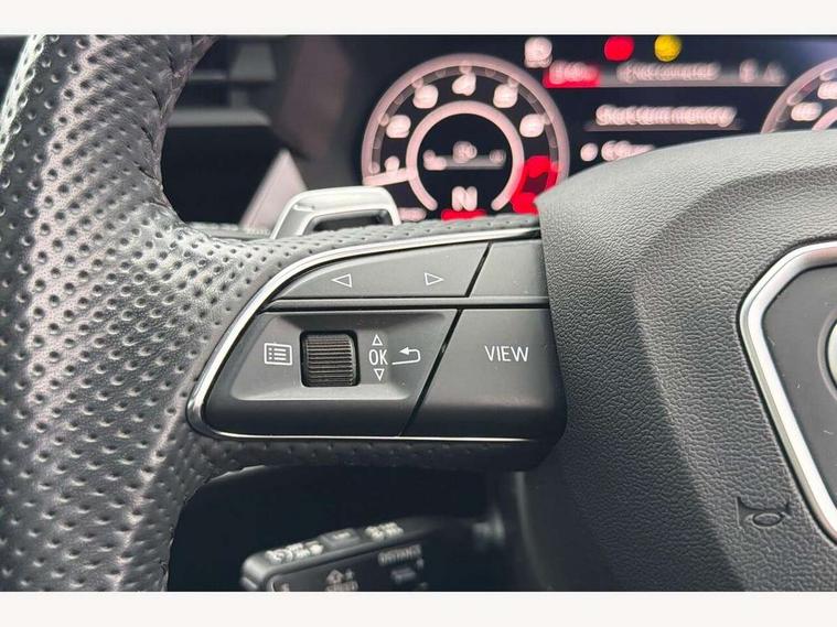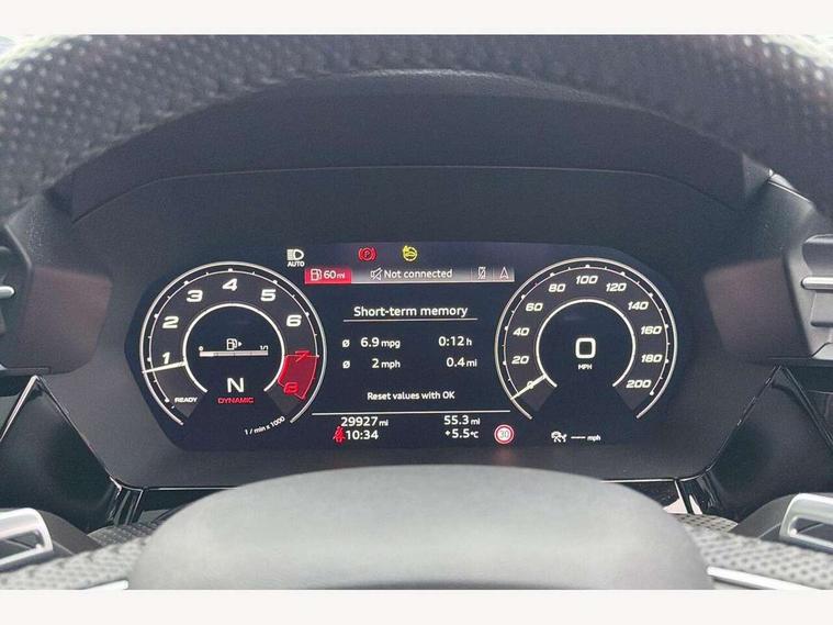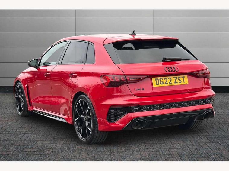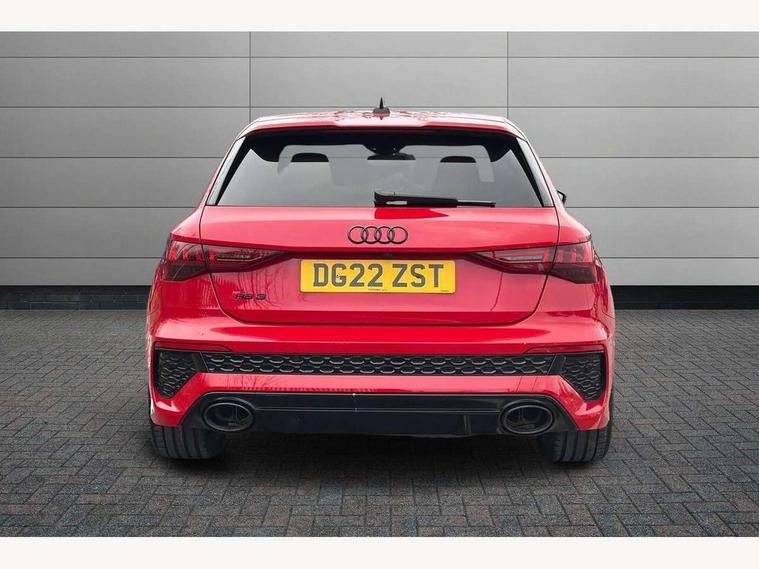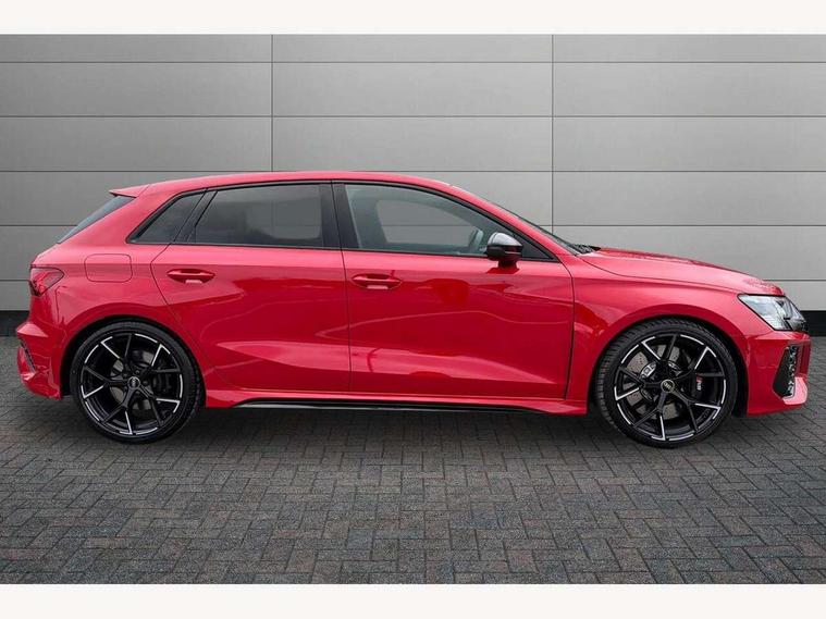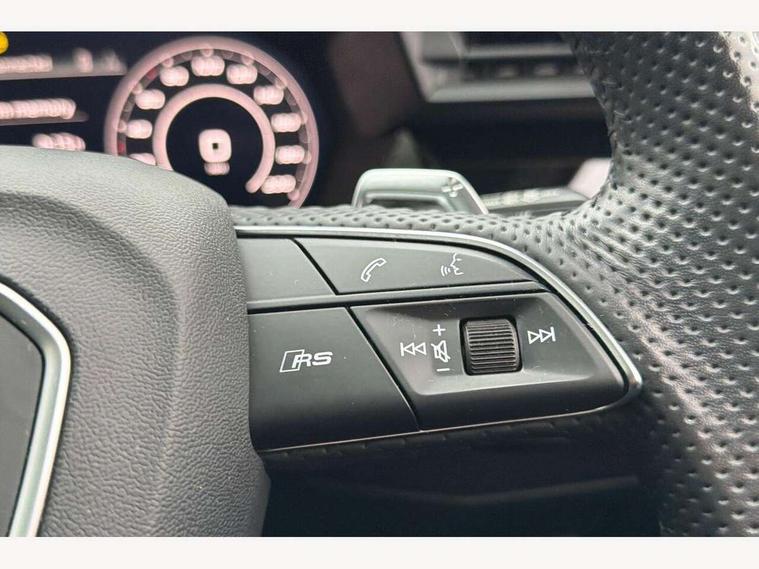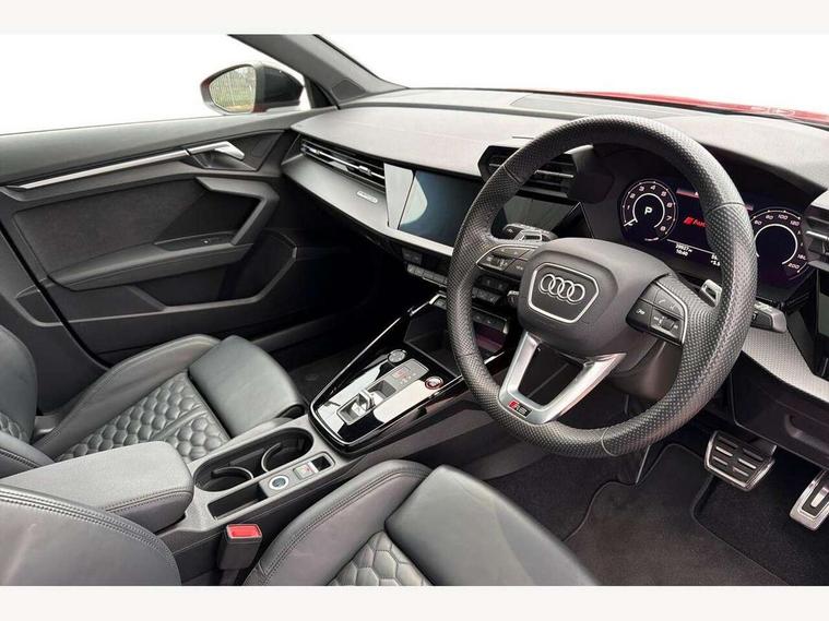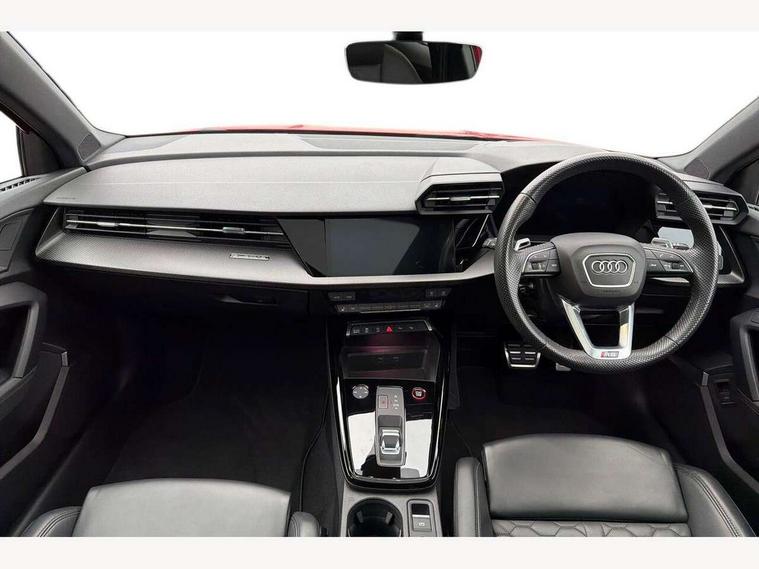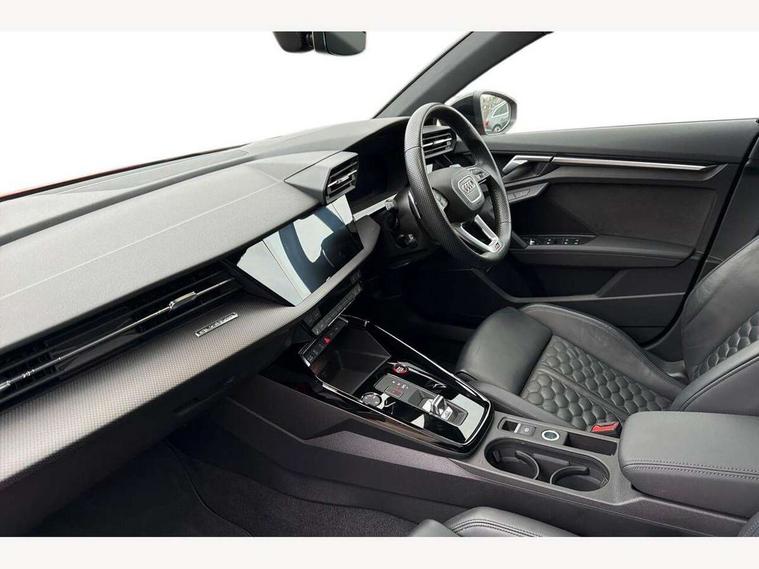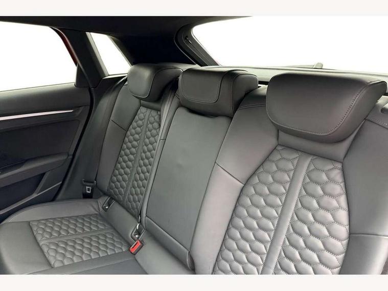Adaptive cruise assist, Adaptive cruise control, Audi connect emergency call and service, Audi smartphone interface, Audi virtual cockpit with RS specific display 12.3" full colour digital instrument cluster, Automatic start/stop system with recuperation, Bluetooth interface, Camera based traffic sign recognition, Collision avoidance assistant, Head up Display, Lane departure warning system, Legal emergency call, Parking assist with parking system plus, Power operated tailgate - Luggage compartment lid opens electrically, Progressive power assisted steering, Reversing camera, Quattro permanent four wheel drive, Rear suspension, DAB Digital radio, 3rd brake light, Acoustic glass windscreen, Audi beam uses LEDs to project the Audi sport logo onto the ground as you exit your RS 3, Audi matrix LED headlights, LED rear lights, dynamic front and rear indicators and headlight cleaning system, Auto dimming rear view mirror, Black side skirts, Body colour roof, Carbon exterior door mirror, Carbon fibre engine cover, Electric adj heated/folding + auto dimming exterior mirrors with memory + LED indicator + auto kerb side function for passenger side exterior mirror, Front spoiler in high gloss black, Heat insulating glass windscreen, Light and rain sensors, Panoramic glass sunroof, Privacy glass - dark tinted rear and rear side windows from B-pillar backwards, Rear window wiper and washer system, RS exterior features in gloss black, RS sports exhaust system, 3 spoke leather multifunction steering wheel with gear shift paddles, 4 way lumbar support for front seats, 40/20/40 split folding rear seat bench, Black cloth headlining, Dual zone electronic climate control, Electrically adjustable front seats with memory function for driver's side, Front and rear headrests, Front centre armrest, Front sports seats RS embossed logo, Front/rear floor mats, Heated front seats, Honeycomb stitching and RS embossing, Illuminated door sill trims inlays in aluminium with RS 3 logo, RS emblems, Stainless steel pedals and front footrest in black, Aluminium interior elements pack - RS3, Ambient lighting pack - RS3, Comfort and sound pack - RS3, Driver assistance pack with 3 spoke leather multi function steering wheel - RS3, MMI navigation plus with MMI touch - RS3, RS bodystyling - RS3, Storage Pack - RS3, 3x3 point rear seat belts, ABS/EBD, ASR, Audi pre sense front, Driver/Front Passenger airbags, EDL, ESC - Electronic Stability Control + traction control, Front passenger airbag deactivation, Front side airbags with head airbags and interaction airbag, Hill hold assist, Seat belt reminder with passenger presence detection in rear, Tyre pressure loss indicator, Warning triangle and first aid kit, Anti theft alarm, Anti-theft wheel bolts, Electronically operated child lock, Remote control central locking, Full decorative carbon trim, 19" 5 Y spoke black with graphic print alloy wheels, Tool kit, Tyre repair kit,