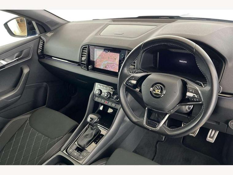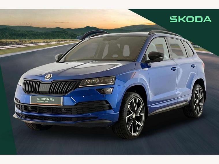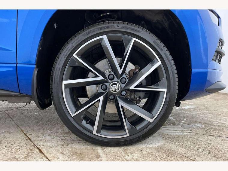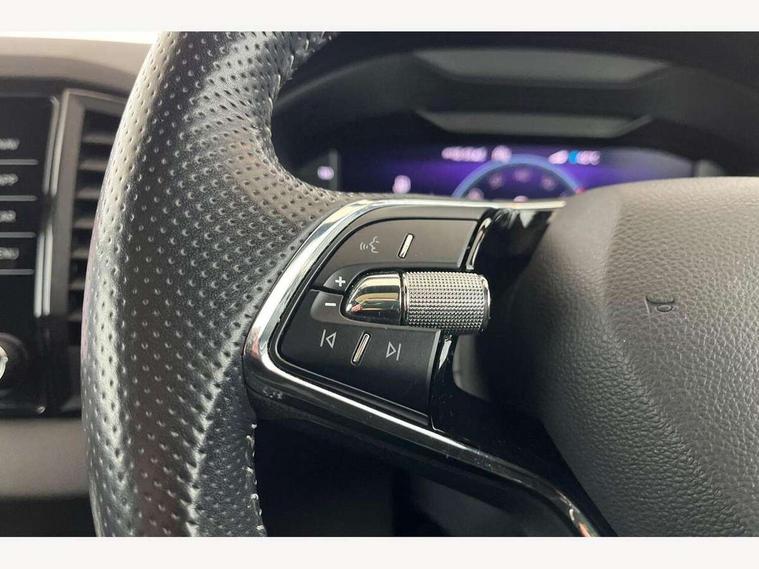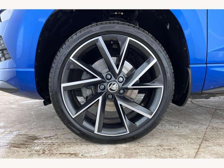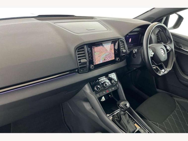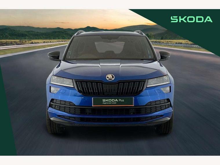 Care connect, Drive mode selector, Driver fatigue sensor, Multifunction colour trip computer, Outside temperature gauge, Service interval indicator, SmartLink wireless for Apple and wired for Android, Start/stop system with regenerative braking, USB C Port x 2 in front centre console, DAB radio with Bluetooth, USB connection, Wireless charging without wireless aerial connection, Acoustic glass, Aero front windscreen wipers with intermittent function, Automatic headlight control system, Black door mirrors, Black electric window control buttons, Black radiator grille, Black roof rails, Body colour door handles, Body coloured bumpers, Electric front and rear windows with child proof lock, Front door steps with SportLine logo, Full LED headlights + adaptive front light system + LED daytime running lights and front cornering fog lights, Headlight washers, Heated rear windscreen, LED rear lights with high functionality, Light assistant (coming/leaving home/tunnel light), Panoramic sliding sunroof, Privacy glass, Protective door side sills in body colour, Rear diffuser, Safety reflectors on front doors, Skoda lettering on tailgate in black, Sportline badge on front fender, Sportline decorative inserts with badging, Sports front and rear bumpers, Third brake light, 1.5 litre bottle holders in driver and front passenger door panels, 12V socket in boot, 12v socket in front centre armrest with storage compartment and rear air vents, 2 Folding hooks and nets in boot, 2 Front readings lights for driver and passenger, 3 rear height adjustable headrests, 4 foldable roof handles with rear coat hooks, Aluminium pedals, Black roof headlining, Cargo elements in boot, Chrome inner door handles, Door sill scuff plates, Driver and passenger seats height adjust, Front head restraints, Height adjustable front three point seats belts with tensioners, Height/reach adjust steering wheel, Ice scraper, Illuminated and cooled glovebox, Illuminated luggage compartment, Isofix child seat preparation outer rear, Manual lumbar support for front seats, Net programme in boot, Pen holder, Pollen filter, Rear reading lights, Rear seats fixed folding and divided 60:40, Retractable parcel shelf attachable to tailgate, Safety vest holder, Solid rear boot cover, Storage box in upper central dashboard closed, Storage compartment below the passenger seat, Sunvisors with illuminated vanity mirrors, Textile floor mats, Umbrella under passenger seat, Welcome animation with sportline logo, LED Interior lighting pack with Skoda welcome logo - Karoq, Airbags - Front side, head, knee and curtain, Automatic door unlocking in case of crash, Automatic fuel cut off in case of crash, Driver airbag, Electronic parking brake with auto hold function, Emergency rear braking signal, ESC including ABS, MSR, ASR, EDS, HBA, DSR, RBS, MKB and traction control, Front assist radar scanning of the space in front of the car with automatic braking, Hill hold control, Passenger airbag with switch-off function, Pedestrian monitor, Seatbelt reminder signalisation and pretensioner for all seats, Three point seatbelts rear, Two tone horn, Tyre pressure display, Tyre pressure monitor, Alarm with interior monitoring, back up horn and tilt sensor with safe function, Electronic engine immobiliser, Keyless entry and keyless start with safe system, Remote central locking with 2 remote folding keys, Black air vent surround, 19" Vega anthracite alloy wheels, Anti-theft wheel bolts protection, Storage on wheel cover,