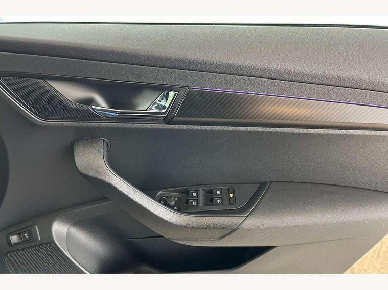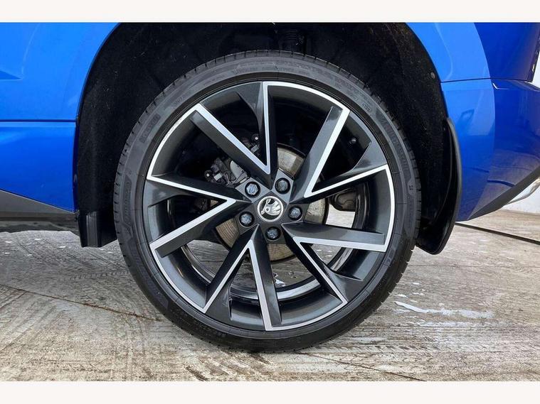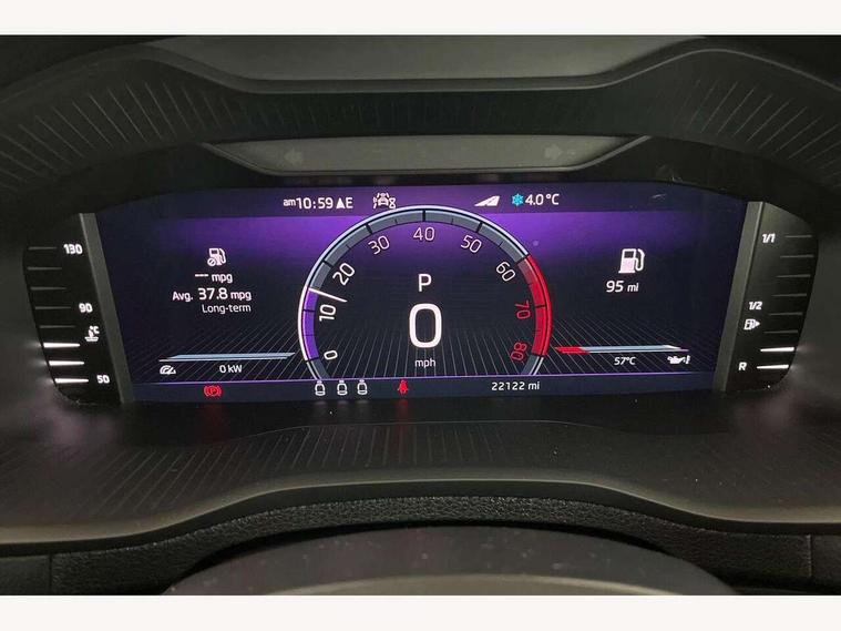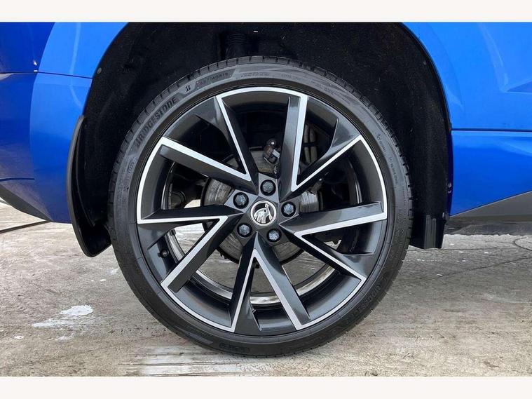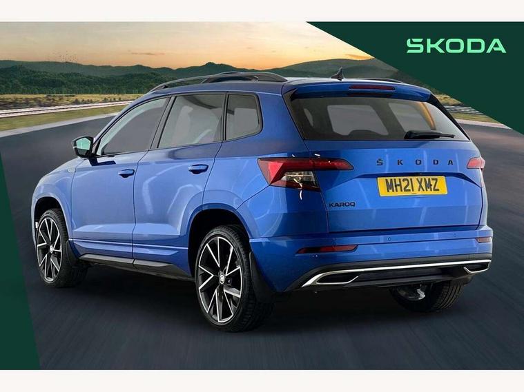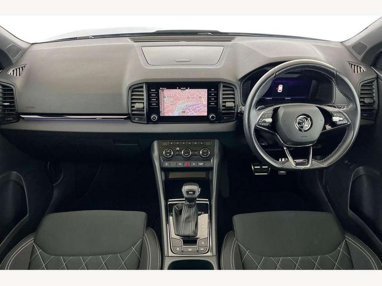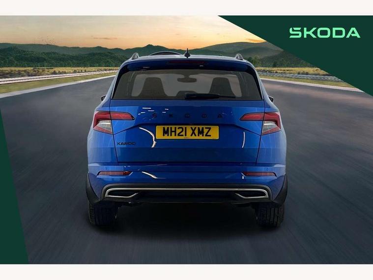 Care connect, Drive mode selector, Driver fatigue sensor, Multifunction colour trip computer, Outside temperature gauge, Service interval indicator, SmartLink wireless for Apple and wired for Android, Start/stop system with regenerative braking, USB C Port x 2 in front centre console, DAB radio with Bluetooth, USB connection, Wireless charging without wireless aerial connection, Acoustic glass, Aero front windscreen wipers with intermittent function, Automatic headlight control system, Black door mirrors, Black electric window control buttons, Black radiator grille, Black roof rails, Body colour door handles, Body coloured bumpers, Electric front and rear windows with child proof lock, Front door steps with SportLine logo, Full LED headlights + adaptive front light system + LED daytime running lights and front cornering fog lights, Headlight washers, Heated rear windscreen, LED rear lights with high functionality, Light assistant (coming/leaving home/tunnel light), Panoramic sliding sunroof, Privacy glass, Protective door side sills in body colour, Rear diffuser, Safety reflectors on front doors, Skoda lettering on tailgate in black, Sportline badge on front fender, Sportline decorative inserts with badging, Sports front and rear bumpers, Third brake light, 1.5 litre bottle holders in driver and front passenger door panels, 12V socket in boot, 12v socket in front centre armrest with storage compartment and rear air vents, 2 Folding hooks and nets in boot, 2 Front readings lights for driver and passenger, 3 rear height adjustable headrests, 4 foldable roof handles with rear coat hooks, Aluminium pedals, Black roof headlining, Cargo elements in boot, Chrome inner door handles, Door sill scuff plates, Driver and passenger seats height adjust, Front head restraints, Height adjustable front three point seats belts with tensioners, Height/reach adjust steering wheel, Ice scraper, Illuminated and cooled glovebox, Illuminated luggage compartment, Isofix child seat preparation outer rear, Manual lumbar support for front seats, Net programme in boot, Pen holder, Pollen filter, Rear reading lights, Rear seats fixed folding and divided 60:40, Retractable parcel shelf attachable to tailgate, Safety vest holder, Solid rear boot cover, Storage box in upper central dashboard closed, Storage compartment below the passenger seat, Sunvisors with illuminated vanity mirrors, Textile floor mats, Umbrella under passenger seat, Welcome animation with sportline logo, LED Interior lighting pack with Skoda welcome logo - Karoq, Airbags - Front side, head, knee and curtain, Automatic door unlocking in case of crash, Automatic fuel cut off in case of crash, Driver airbag, Electronic parking brake with auto hold function, Emergency rear braking signal, ESC including ABS, MSR, ASR, EDS, HBA, DSR, RBS, MKB and traction control, Front assist radar scanning of the space in front of the car with automatic braking, Hill hold control, Passenger airbag with switch-off function, Pedestrian monitor, Seatbelt reminder signalisation and pretensioner for all seats, Three point seatbelts rear, Two tone horn, Tyre pressure display, Tyre pressure monitor, Alarm with interior monitoring, back up horn and tilt sensor with safe function, Electronic engine immobiliser, Keyless entry and keyless start with safe system, Remote central locking with 2 remote folding keys, Black air vent surround, 19" Vega anthracite alloy wheels, Anti-theft wheel bolts protection, Storage on wheel cover,