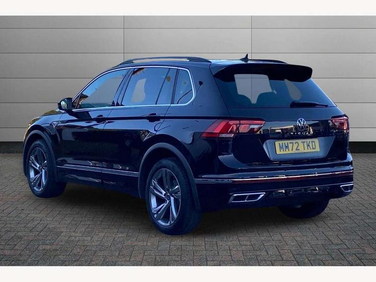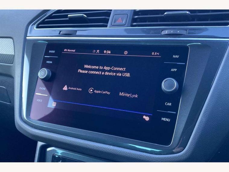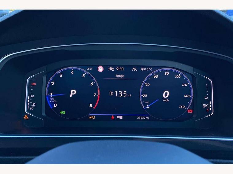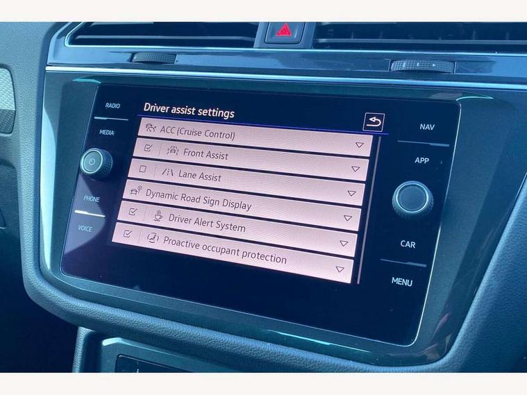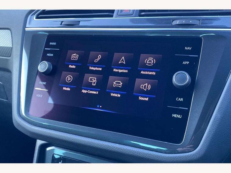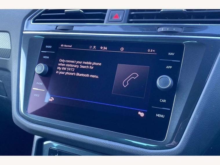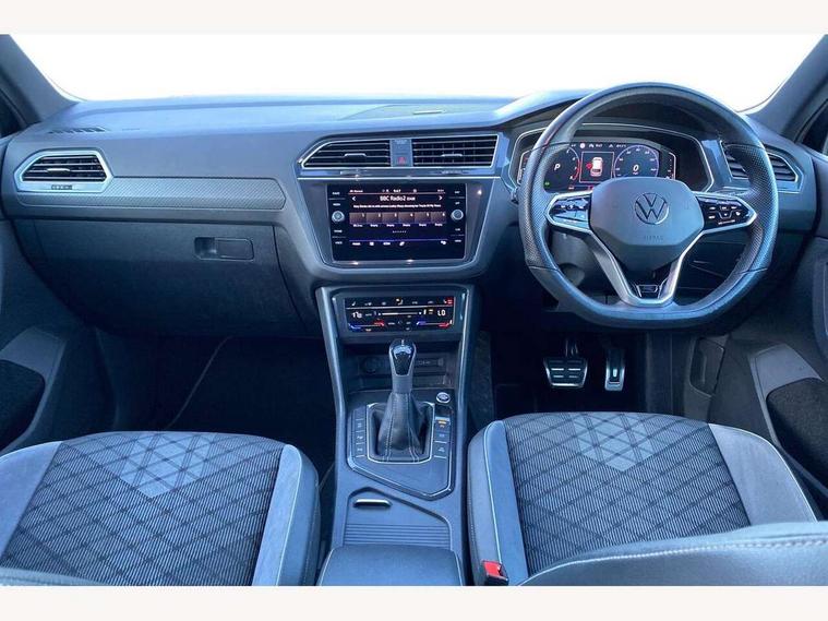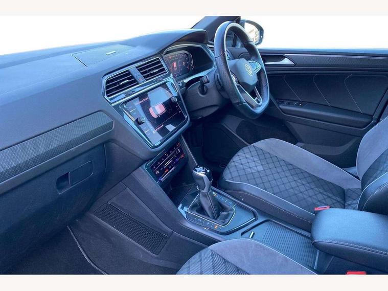 Adaptive cruise control ACC stop and go including speed limiter, App-Connect incl. App-Connect Wireless for Apple CarPlay and Android Auto, Bluetooth phone integration system, Comfort drive travel assist, Digital cockpit pro, Driver alert system, Driver profile selection, Dynamic road sign display, eCall emergency call system, Electromechanical speed sensitive power steering, Emergency assist, Front and rear parking distance sensors, Instrument cluster mph speedometer Great Britain, Lane keeping system Lane Assist, Lights on warning, Multifunction front facing camera, Outside temperature display, Premium multifunction display with multi colour display, Preparation for subsequent activation Navigation feature Discover Media includes Streaming and Internet, Remote control boot opening, Rev counter, Service interval indicator, Speed limit display, Start/stop system with regenerative braking, Tailgate/trunk lid unlocking from outside, Trip computer, Warning sound and light for doors and tailgate open, Battery regeneration during braking, Sports suspension, 8 Speakers, Digital radio reception DAB+, Diversity antenna for FM reception, Radio, Auto dimming interior rear view mirror, Automatic headlight control system, Body colored bumpers in R-Line style, Body colored exterior mirror housings, Body colour door handles, Chrome moldings on the side windows, Coming/leaving home lighting function, Dynamic headlight range control, Front and rear electric windows, Heated rear window, High level 3rd brake light, Laminated safety glass windshield, heat and sound insulating, LED headlamps with LED separate daytime running light and dynamic cornering light, LED rear combination lamps, LED rear number plate lights, License plate carrier in front and rear, Poor weather light and cornering light, Power adjustable, folding and heated door mirrors with surround lighting, front passenger exterior mirror lowering function, Privacy glass for rear side windows and rear window, R Line body kit, R Line side sills, Rain sensor, Rear exhaust tailpipe, Rear fog lamp, Rear side wing doors, Rear spoiler in R style, Rear windscreen washer and wiper with interval delay, Side and rear windows in heat insulating glass, Trailer Stability Programme, Unique R Line badging, Windscreen wipers/ intermittent wipe + 4 position delay, 12V outlet in center console rear and in luggage compartment, 12V outlet in front and tray, 2 LED front reading lights, 2 LED rear reading lights, 3 bench rear seats in 2nd row, 3 rear headrests, Air Care Climatronic 3 zone automatic climate control with enhanced air filter and controls in the rear, Art Velours greyson sports cloth upholstery, Backrest release for left front seat, Black headlining, Brushed stainless steel pedals and footrest, Carpet mats in front and rear with decorative stitching in Gray, Climate control unit rear with touch function, Door and side trim panel in foam film, insert in leatherette, Driver + front passenger lumbar support, Front footwell illumination, Front scuff plates in aluminum with R-Line logo, Front seats head restraints (x-adjustment), Height adjustable front seats, Height/reach adjust steering wheel, Isofix Preparation 2 Rear child seats, Leather gear knob, Rear bench seat asymetrically split folding, longitudinally movable and folding with load-through hatch and center armrest, Remote unlocking for rear seat backrest, Single front passenger seat, Sun visors with illuminated vanity mirrors, Top front comfort seats, Winter pack - Tiguan, 3 point seat belt for centre rear seats, 3 point seat belts with seat belt pretensioners for the outer rear seats, Curtain airbags for front and rear passengers, Driver/Front Passenger airbags, Drivers knee airbag, Electronic parking brake with auto hold, Electronic Stability Control with driver steering recommendation, ABS, ASR, EDL, EDTC and trailer stabilization, Front assist with autonomous emergency braking (for Adaptive Cruise Control ACC up to 130 mph), Front disc brakes, Front passenger airbag deactivation, Front side airbags, Height adjustable front 3 point seatbelts + pretensioners, Manual child proof rear door locks, Pedestrian monitoring system, Proactive passenger protection system in combination with front assist, Rear disc brakes, Two tone horn, Tyre pressure loss indicator, Warning sound and light for front seat belts if unfastened, Warning triangle, Anti theft alarm system with interior monitoring, backup horn and towing protection, Anti theft wheel bolts, Electronic engine immobiliser, Keyless locking and starting system keyless access with safelock, Chrome elements on the mirror switch power window switches and door pulls, Decorative inserts Carbon Gray for dashboard and front door trim panels, Interior door handle in matte chrome, 19" Valencia alloy wheels with AirStop tyres, Tool kit, Tyre mobility kit Includes 12V compressor and tyre sealant,