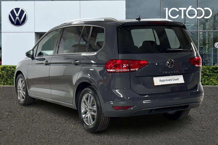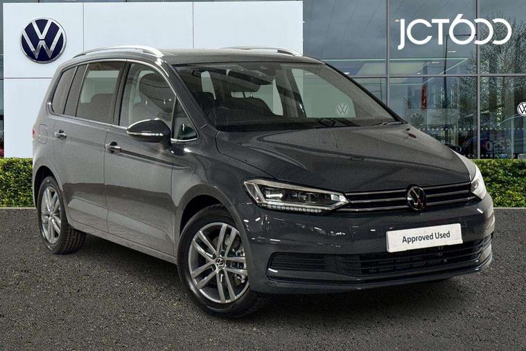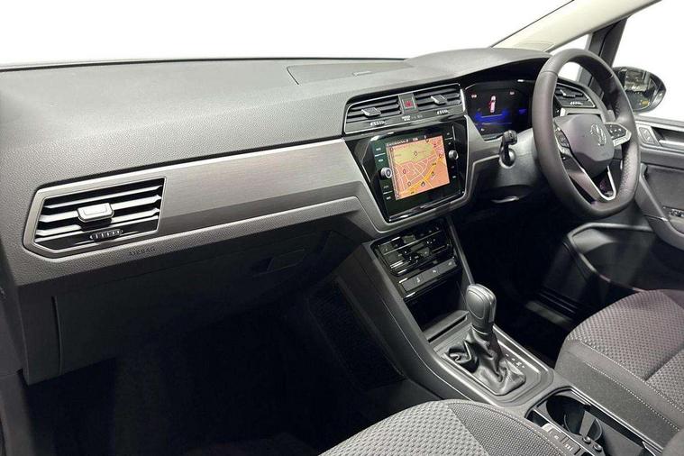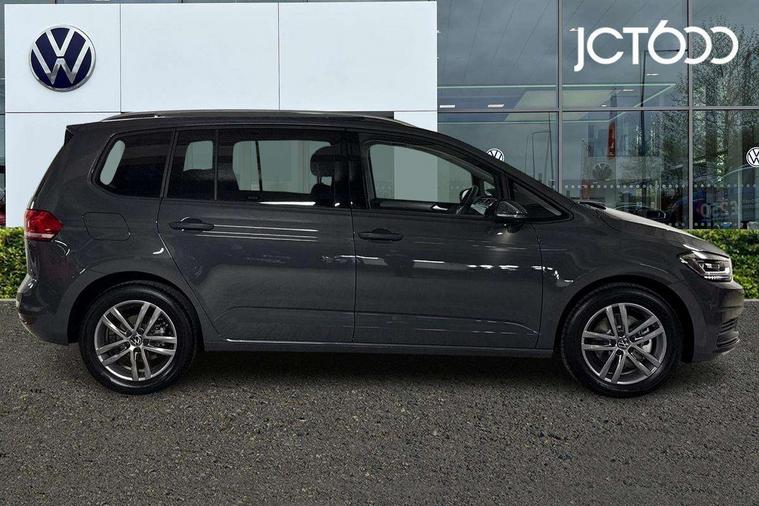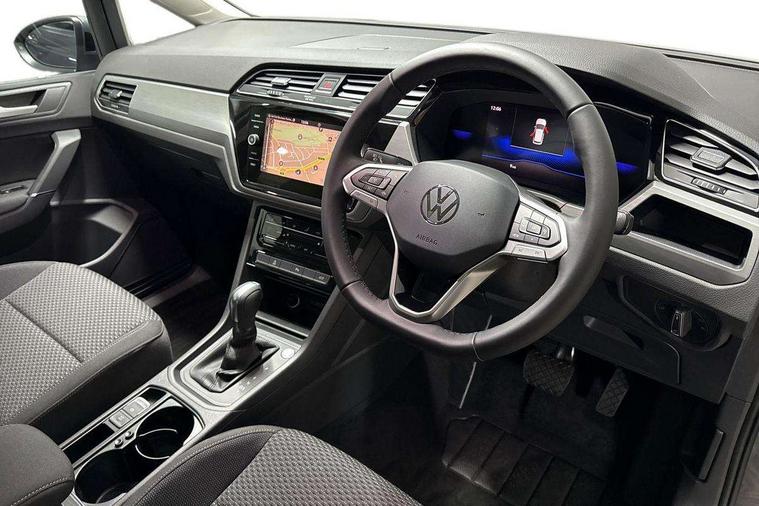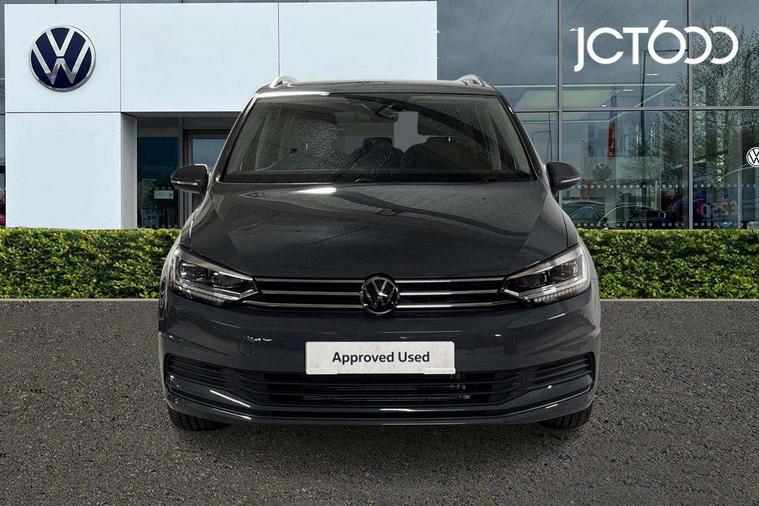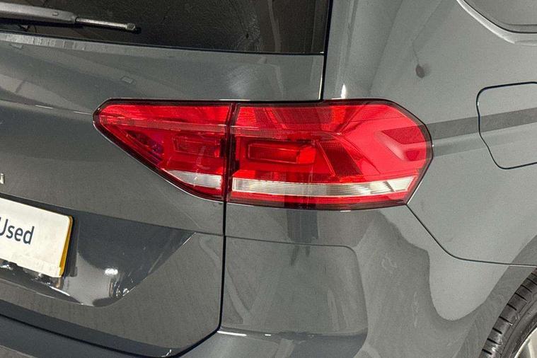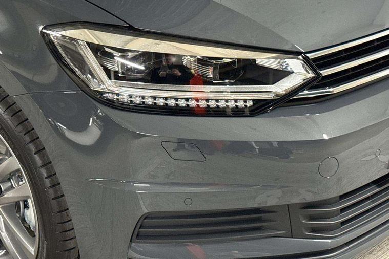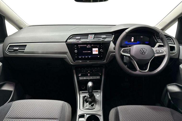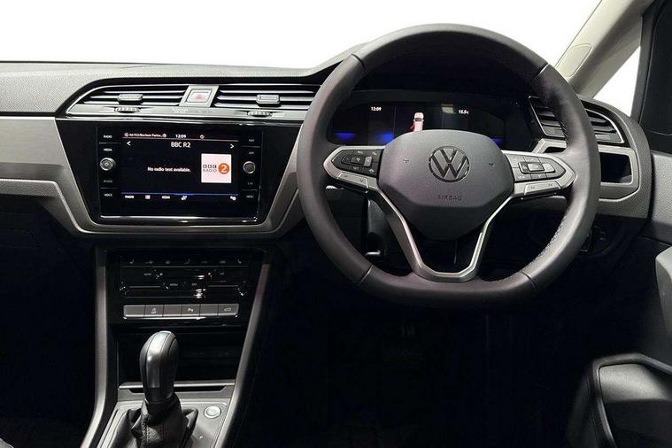 Adaptive cruise control, Audible lights on warning, Discover media navigation touchscreen navigation/radio system with streaming and internet, Driver alert system, Driver profile selection, Dynamic road sign display, Electric tailgate, Electronic odometer, Emergency services call system, Extended, crash-active and proactive Pedestrian and cyclist monitoring, External temperature gauge, Front parking sensors, Lane change system side assist and rear traffic alert, Lane keep assist, Misfuelling protection device, Mobile pairing with SMS function, Mobile phone interface with inductive charging, Rear view camera displayed via vehicles audio system display, Rev counter with fuel gauge, Side scan, Speed limiter, Speed sensitive power steering, Stop/start system, Think blue trainer driver tips and journey analysis, Trip and service interval display, We connect' and 'We connect plus' functionality, Petrol Particulate Filter, Rear stabiliser bar, XDS electronic differential lock, 4x20 watt output, 8 Speakers, Audio Connectivity System, DAB Digital radio, External USB-C data socket with increased charging performance - 2 USB sockets 45W, MP3/WMA compatability, SD card slot, Title and cover art display, USB connection, Aerial integrated into side window, Auto dimming door mirrors, on driver side, surround lighting and front passenger side mirror lowering function, Auto dimming rear view mirror, Automatic coming/leaving home lighting function, Body colour bumpers, Body colour door handles, Body colour door mirrors with integral indicators, Door mirrors with memory function, Dusk sensor + auto driving lights, Electric folding door mirrors, Electric heated + adjustable door mirrors, Electric, glass sliding/tilting panoramic sunroof including integrated roller blind and LED lighting around aperture, Front and rear electric windows, Fully galvanised body, Gloss black finish B pillar, Green tinted heat insulating glass, High level third brake light, Rain sensor, Rear fog lights, Rear side wing doors, Rear tinted glass from B-pillar backwards approx 65% tinted, Rear wash/wipe with intermittent wipe setting, Removable engine badge, Silver roof rails, Tailgate wiper- reverse gear activation, Twin chrome exhaust tailpipes, Volkswagen roundel, Windscreen wipers intermittent wipe, 12V power point for Row 2, 12V socket in luggage compartment, 2 individual fold flat 3rd row seats, 2 three point seatbelts in 3rd row, 2nd row centre armrest, 2nd row centre seat converts into table, 3 single slide/fold/removable 2nd row seats, 3 spoke steering wheel, 3x3 point seatbelts on 2nd row with height adjust on outer seats, 4 boot load lashing points, 4 way adjustable front head restraints, 5 headrests, Activated charcoal canister for intensified evaporation system, Air care climatronic 3 zone air conditioning system with rear air conditioning control panel, Chrome plated radiator grille inserts, air vent surrounds and light switch surrounds, Driver and front passenger under seat drawer, Dust/pollen filters, Foldable front passenger seat backrest with load through function, Front and rear reading lights X 2, Front centre armrest with storage compartment, Front comfort seats with lumbar support, Front cupholders x 2, Front passenger seat height adjust, Front seat storage pockets, Front seatback folding tables, Height adjustable driver's seat, Height/reach adjust steering wheel, Illuminated glovebox, Instrument lighting white adjustable panel illumination with red night time illumination, Interior light with delay, Isofix on 2nd row outer seats, Isofix on 3rd row seats, Large storage compartment in roof console, Lasano cloth upholstery, Leather multifunction steering wheel with gear knob, Leatherette on rear of front seats, Low tunnel 2nd row seat, Luggage compartment lighting, Media box in dashboard on passenger side, Multi storage in passenger/luggage areas, Multi-function centre console with storage facilities, Retractable luggage cover, Split folding rear seat backrests, Storage bins on all doors, Sun visors with illuminated vanity mirrors, Family Pack - Touran, Winter pack without heated washer jet - Touran, 3 point height adjustable front seatbelts, Auto hold function, Automatic post collision braking system, Door open warning reflectors, Driver/Front Passenger airbags, Drivers knee airbag, EDL + ASR, Electronic parking brake, Energy recovery system, ESC with ABS, First aid kit, Front and rear (row 2) curtain airbags, Front assist with autonomous emergency braking, Front seat side impact airbags, Front seatbelt pretensioners, Front/rear disc brakes, Hill hold control, Hydraulic Brake Assist (HBA), Loose wheel warning function, Manual passenger airbag deactivation function, Pre crash preventive occupant protection, Proactive passenger protection system with front and side assist, Rear child proof door locks, Road sign recognition, Seatbelt warning lamp and buzzer, Traction control, Two tone horn, Warning triangle, Alarm with remote central locking and interior protection, Electronic engine immobiliser, Keyless Access Keyless locking and starting system with SAFELOCK, New brushed design decorative inserts in dash and front doors, 17" Salvador alloy wheels with anti-theft wheel bolts, 215/55 R17 self sealing tyres with low rolling resistance,