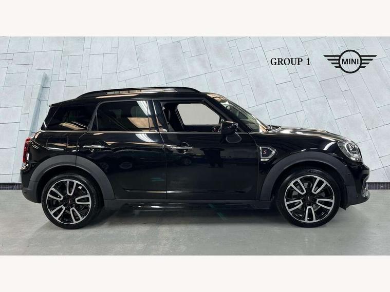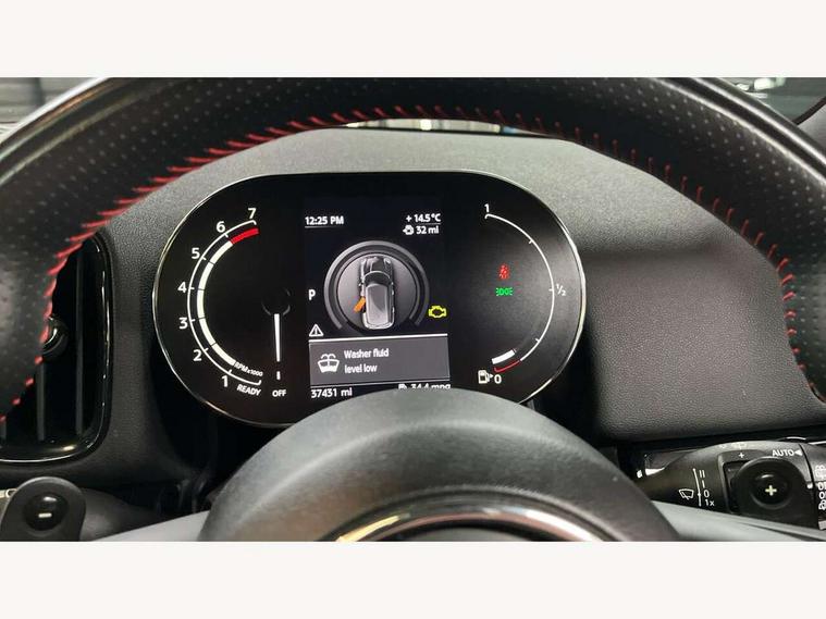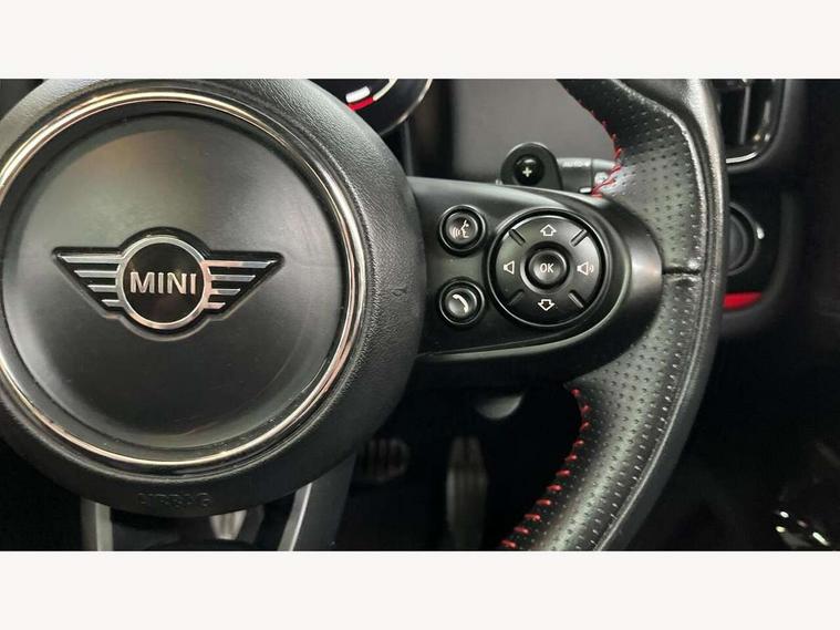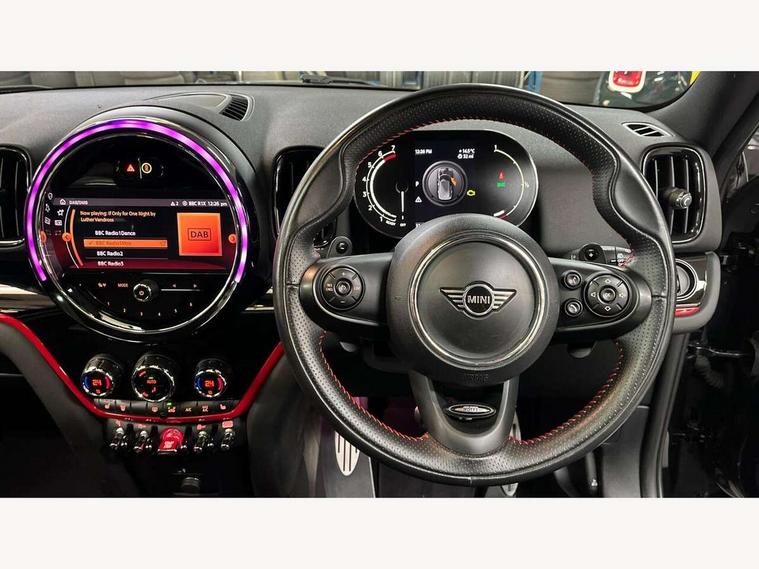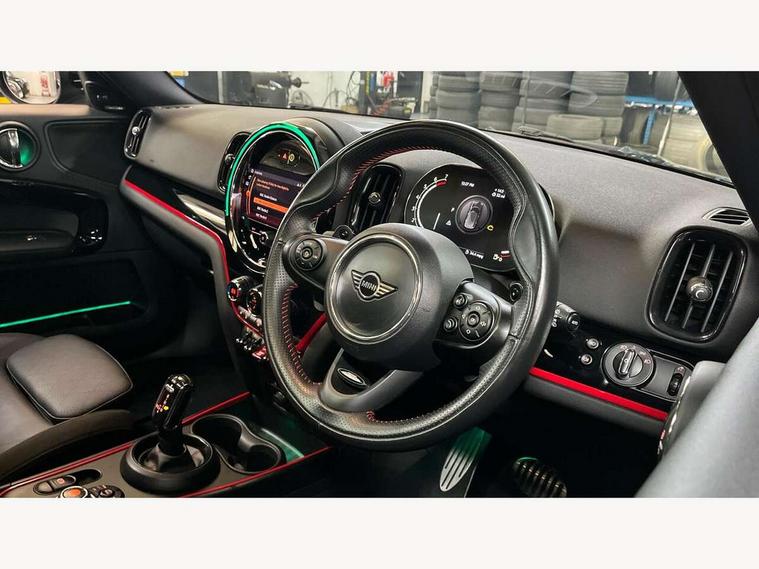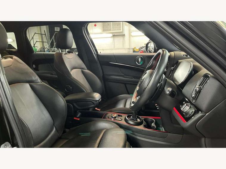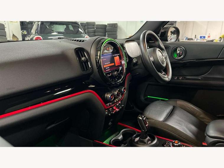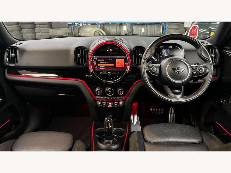Active Guard incl speed limiting and lane departure functions with auto steering, and front collision warning with brake intervention, Automatic start/stop function with brake energy recuperation, Digital cockpit, Electro-mechanical speed dependant steering assistance, Instrument cluster, MINI Driving Modes - centre toggle switch to control driving setting (sport, mid and green), Mini E-call, MINI TeleServices, On board computer, Rear parking distance control, Double Vanos system, Fully variable valve control, High precision injection, Performance Control, Steptronic sport transmission with double clutch and steering wheel paddles, FM tuner and DAB digital radio, Bonnet scoop, Chrome border honeycomb structure radiator grille with S badge, Chrome fuel filler cap, Day time driving lights, Dynamic brake lights, Electric windows, Heated rear window, Heated windscreen washer jets, John Cooper Works - aerodynamic kit (front and rear apron, spoiler), front and rear sport bumpers and part-painted side sills with door sill finishers, John Cooper Works Logo, John Cooper Works rear spoiler, LED fog lights, LED Headlights, Metal door sill strips with Cooper S imprint, Model logo, Model logo on Tailgate, Rain sensor with auto headlights, Rear fog lights, Rear window wiper, Side scuttle panel with integrated indicator, Split rear doors, Sun/heat protection glass, Twin exhaust tailpipe, White indicator lenses, 12V Accessory socket in centre console, 360L luggage compartment capacity, 4 lashing eyes in luggage compartment, 40:20:40 split folding rear seats, Anthracite headlining with grab handles and clothes hooks, Chrome interior highlights, Colour line - Carbon black, Cupholders, English handbook, Front headrests, Glove compartment, Height and length steering column adjustment, Interior lighting with 12 basic colours selectable via toggle switch in roof, Isofix rear child seat preparation, John Cooper Works perforated leather steering wheel with contrast stitching in chilli red and John Cooper Works logo, Leather gearshift lever and handbrake gaiters, LED reading lights, vanity mirror lights, front foot well light and spotlight on front seats, Manual air conditioning, Multifunction steering wheel, Passenger seat height adjuster, Rear headrests, Storage compartments in doors, Sunvisors with vanity mirrors, Excitement pack - Countryman, Navigation pack - Countryman, 2 tone horn, 3 point seatbelts on all seats, 6 Airbags - front, side, head and seat belt tensioners, Anti-lock braking system (ABS), DSC - Dynamic Stability Control, Electronic handbrake, Front and rear disc brakes, Hill start assist, Tyre pressure monitoring system, Alarm system with tilt sensor, monitoring doors, bonnet interior and tailgate, Auto drive away locking, Deadlocking function, Electronic vehicle immobiliser, Locking wheel bolts, Start/stop toggle with keyless go, Piano black JCW interior trim, Tool kit,
