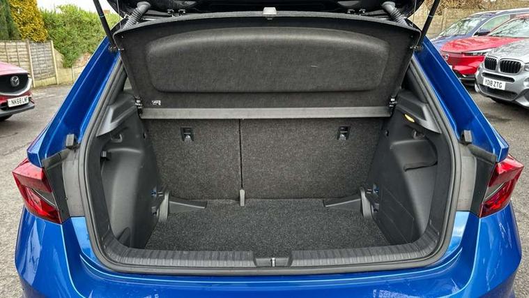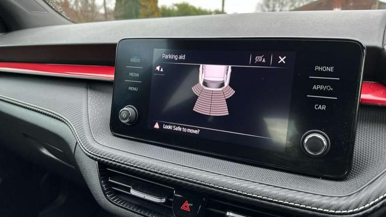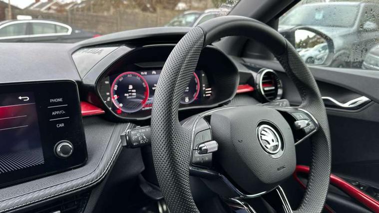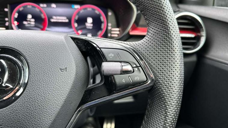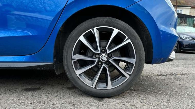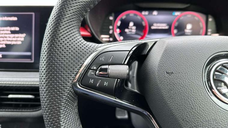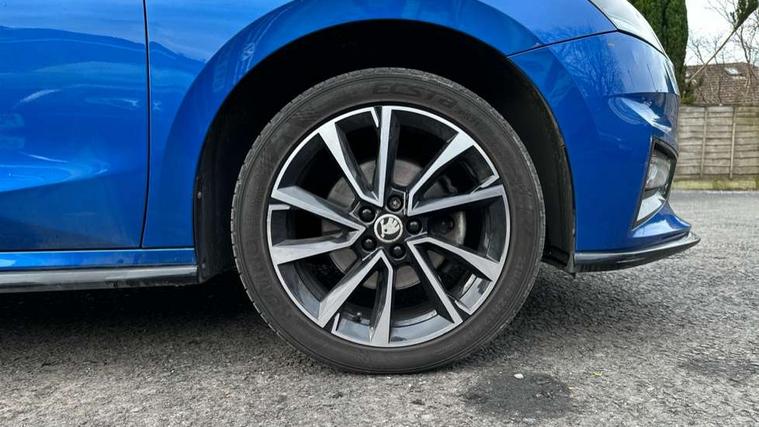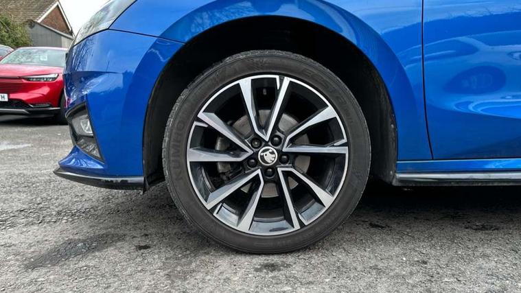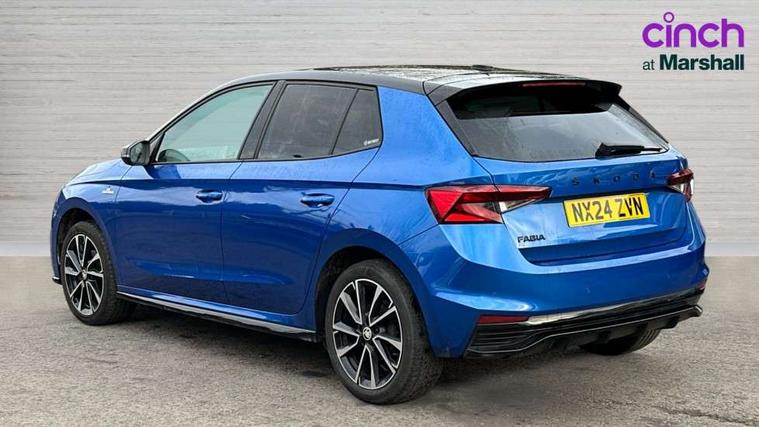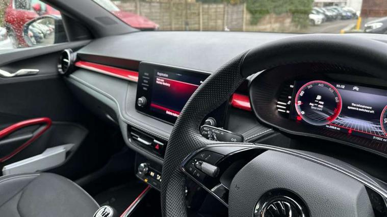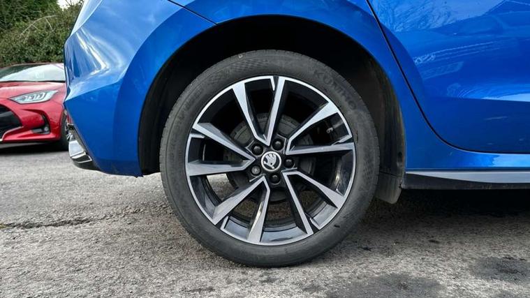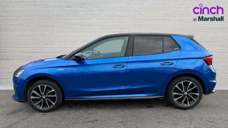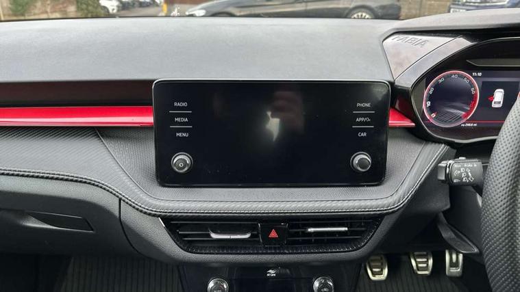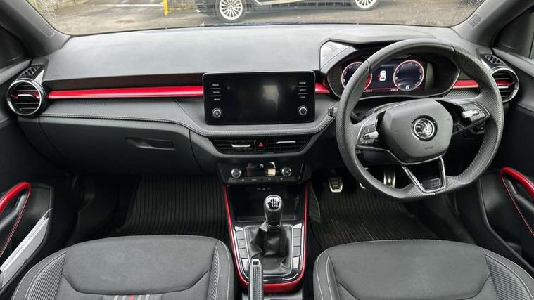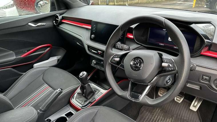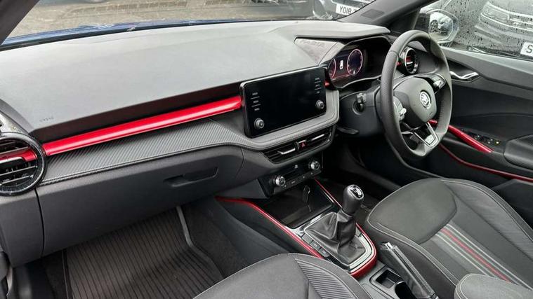 Bluetooth connection, Driver alert system - DAS, Electromechanical power steering, Exterior temperature gauge, Service interval indicator, 2x USB-C in the front (for data transmission and charging), 6 Speakers (4 in front and 2 in rear), Auxiliary socket for external MP3 player, Bolero radio with 8" colour display, DAB digital radio reception, Auto dimming rear view mirror, Basic LED Headlights, Black radiator grille, Body coloured bumpers, Door mirror integrated indicators, Electrically adjustable and heated door mirrors, Front and rear electric windows, Front fog lights, Front window wiper intermittent control, Headlight range control - Automatic, Ice scraper in fuel cap, LED daytime running lights with coming and leaving home feature, Monte Carlo badging, Privacy glass, Rain sensor, Rear LED fog light, Rear side wing doors, Rear window wiper with washing nozzles, Roof mounted spoiler, SKODA tailgate lettering in black, Sports bumpers, Third brake light, 3 rear headrests, Aluminium pedals, Backrest split and folding, Black headlining, Central console with removable cup holder and storage box, Chrome handbrake release button, Door sills with fabia badging, Fabric/artificial leather upholstery, Front centre armrest, Front sports seats, Gearshift knob/handle in leather, Hand brake lever handle in leather, Height adjustable front headrests, Height adjustable front seats, Height adjustable steering wheel, ISOFIX and TopTether anchorage points to the outer rear seats, ISOFIX and TopTether on the front passenger seat, Luggage compartment lighting, Metallic painted red central console cover, Metallic red interior door handles, Pollen filter, Rear seat bench unsplit, Single front passenger seat, Sun visors with mirror and airbag label on passenger side, Textile floor mats, Ticket holder, Umbrella in drivers door, 3-point height adjustable front seats belts with pretensioner and force limiter, Automatic warning lights in case of crash, Driver and passengers airbag with switch off function, e-Call+, ESC including ABS, MSR, ASR, EDS, HBA and XDS, Front and rear seat belt warning, FRONT ASSIST (AEB City and AEB Inter Urban), Front side airbags, Head airbags, One tone horn, Pedestrian protection, Three rear 3-points safety seat belts with pretensioner and force limiter including stop function for outer rear seat belts, Tyre pressure monitoring system, Anti-theft alarm system including immobiliser, interior monitoring, backup horn, and towing protection, Central locking with radio remote control, interior controls, SAFE function and 2 foldable keys, KESSY - Keyless engine start/stop, Carbon effect door and side trim panels, Carbon effect lower decorative trim with white stitching, Red metallic upper decorative trim, Anti-theft wheel bolts protection, Super-low rolling resistance tyres,
