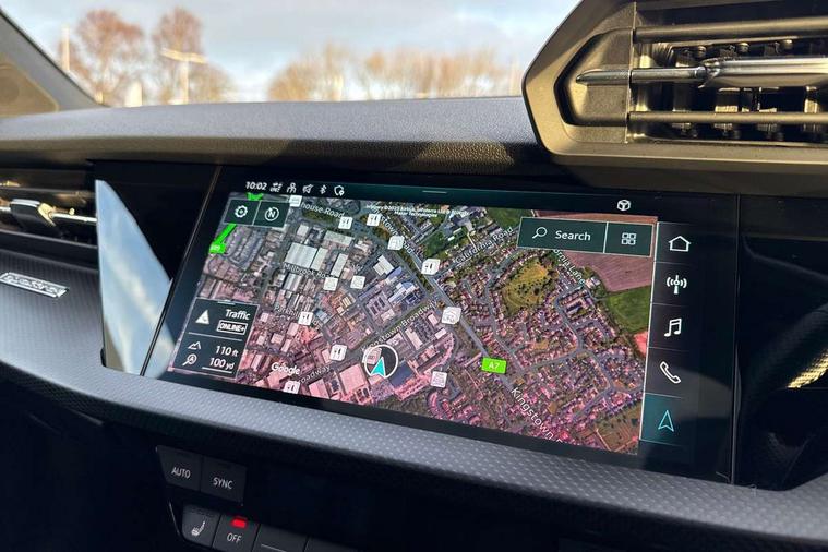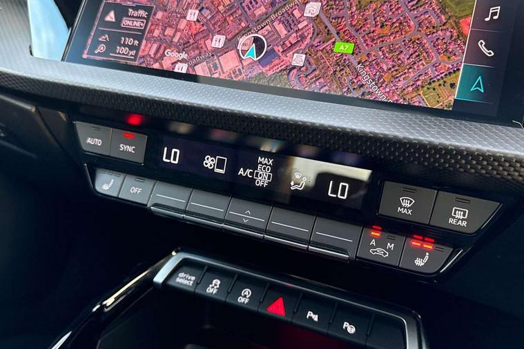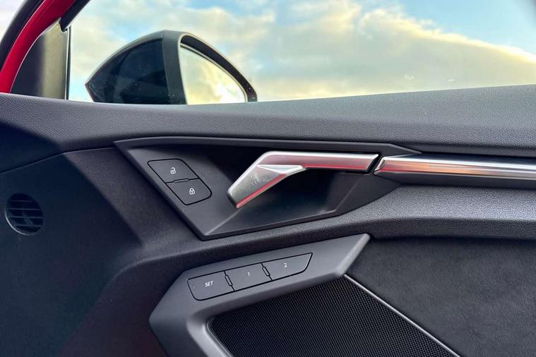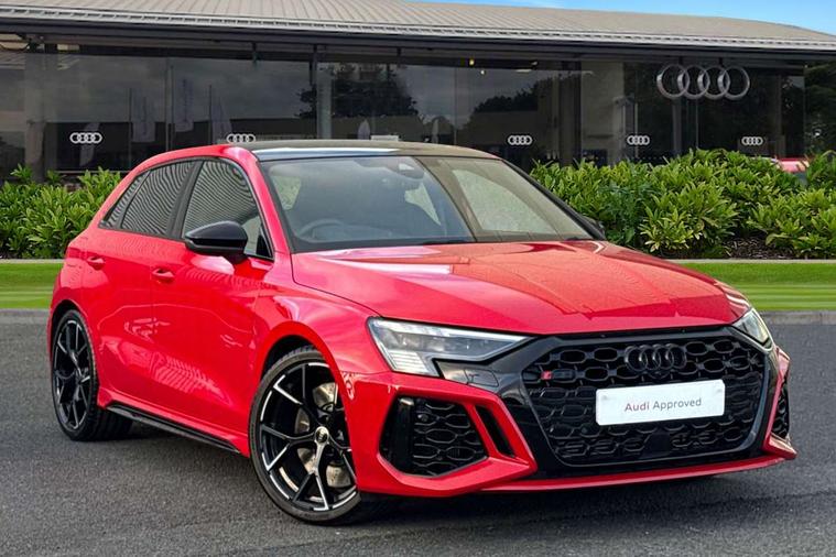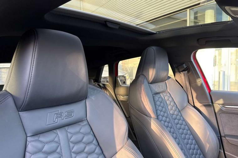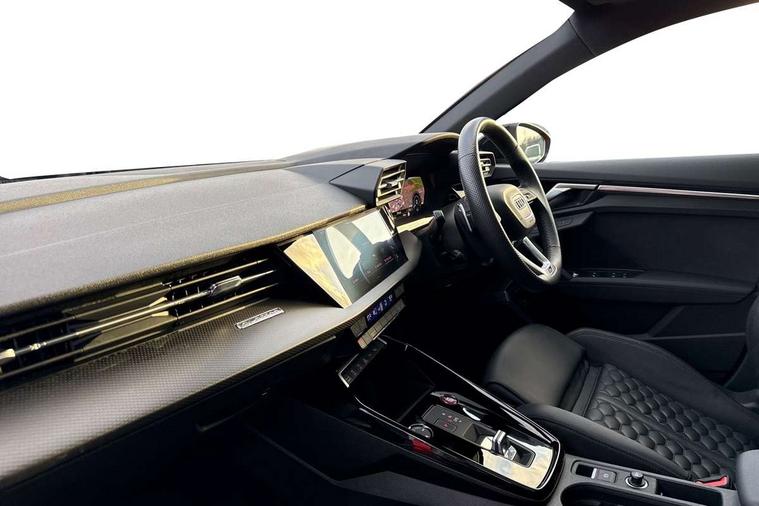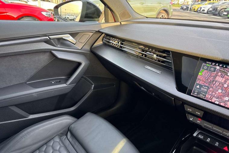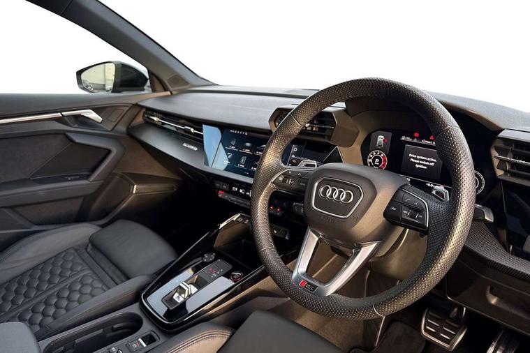 Adaptive cruise assist, Adaptive cruise control, Audi smartphone interface, Audi virtual cockpit with RS specific display 12.3" full colour digital instrument cluster, Automatic start/stop system with recuperation, Bluetooth interface, Camera based traffic sign recognition, Collision avoidance assistant, Emergency e-call, Head up Display, Lane departure warning system, Legal emergency call, Parking assist with parking system plus, Power operated tailgate - Luggage compartment lid opens electrically, Progressive power assisted steering, Reversing camera, Quattro permanent four wheel drive, Rear suspension, DAB Digital radio, 3rd brake light, Acoustic glass windscreen, Audi beam uses LEDs to project the Audi sport logo onto the ground as you exit your RS 3, Audi matrix LED headlights, LED rear lights, dynamic front and rear indicators and headlight cleaning system, Auto dimming rear view mirror, Black side skirts, Body colour roof, Carbon exterior door mirror, Carbon fibre engine cover, Daytime running lights, Electric adj heated/folding + auto dimming exterior mirrors with memory + LED indicator + auto kerb side function for passenger side exterior mirror, Front spoiler in high gloss black, Heat insulating glass windscreen, Light and rain sensors, Panoramic glass sunroof, Privacy glass - dark tinted rear and rear side windows from B-pillar backwards, Rear side wing doors, Rear window wiper and washer system, RS exterior features in gloss black, RS sports exhaust system, 3 seat bench in 2nd row, 3 spoke leather multifunction steering wheel with gear shift paddles, 4 way lumbar support for front seats, 40/20/40 split folding rear seat bench, Black cloth headlining, Dual zone electronic climate control, Electrically adjustable front seats with memory function for driver's side, Front and rear headrests, Front centre armrest, Front sports seats RS embossed logo, Front/rear floor mats, Heated front seats, Honeycomb stitching and RS embossing, Illuminated door sill trims inlays in aluminium with RS 3 logo, Illuminated vanity mirror, RS emblems, Single front passenger seat, Stainless steel pedals and front footrest in black, Aluminium interior elements pack - RS3, Ambient lighting pack - RS3, Comfort and sound pack - RS3, Driver assistance pack with 3 spoke leather multi function steering wheel - RS3, MMI navigation plus with MMI touch - RS3, RS bodystyling - RS3, Storage Pack - RS3, 3x3 point rear seat belts, ABS/EBD, ASR, Audi pre sense front, Driver/Front Passenger airbags, EDL, ESC - Electronic Stability Control + traction control, Front passenger airbag deactivation, Front side airbags with head airbags and interaction airbag, Hill hold assist, Seat belt reminder with passenger presence detection in rear, Tyre pressure loss indicator, Warning triangle and first aid kit, Anti theft alarm, Anti-theft wheel bolts, Electronically operated child lock, Remote control central locking, Full decorative carbon trim, 19" 5 Y spoke black with graphic print alloy wheels, Tool kit, Tyre repair kit,