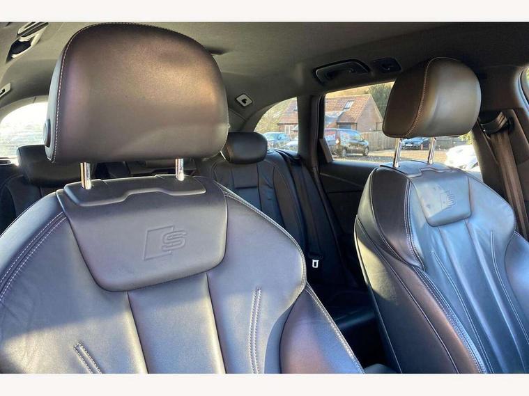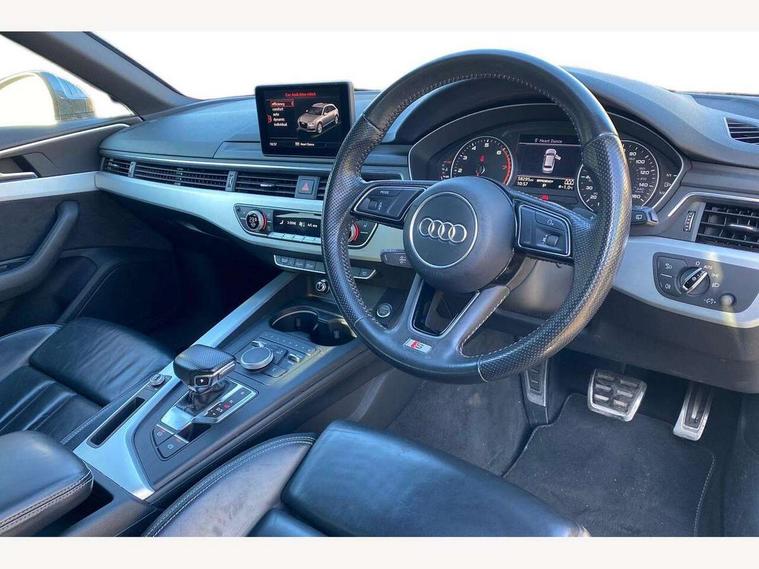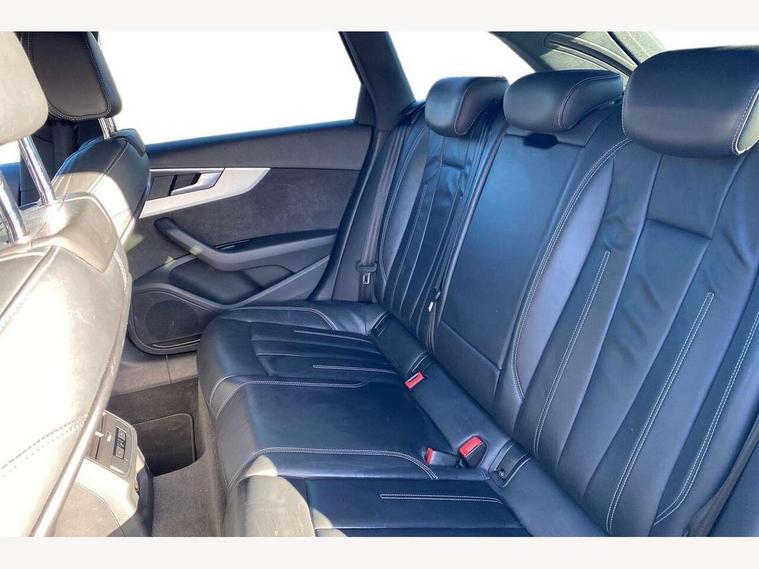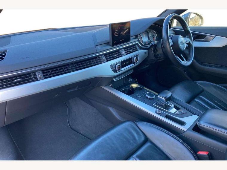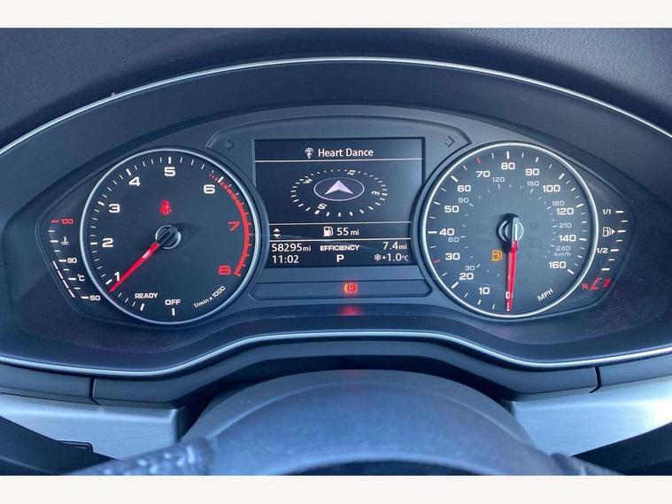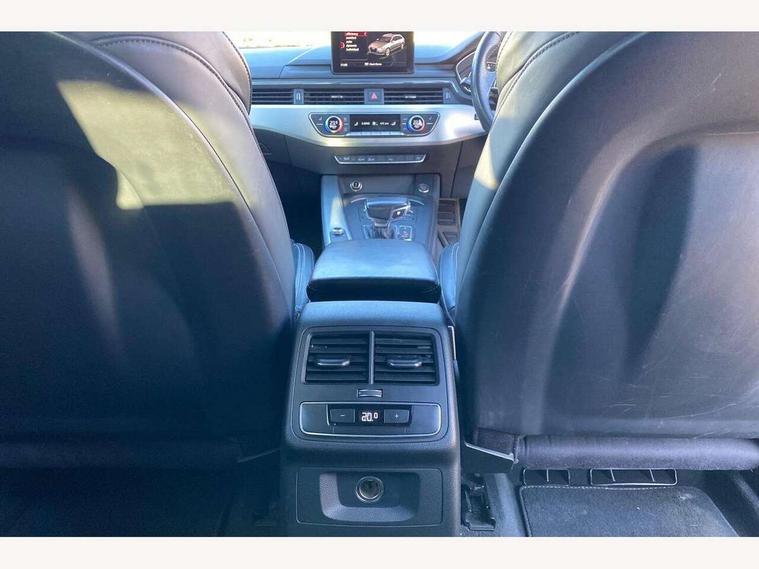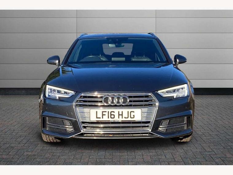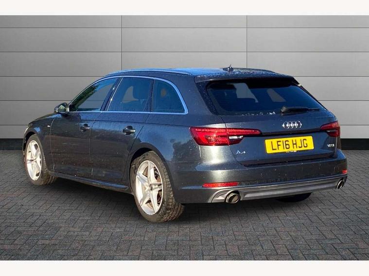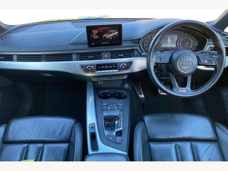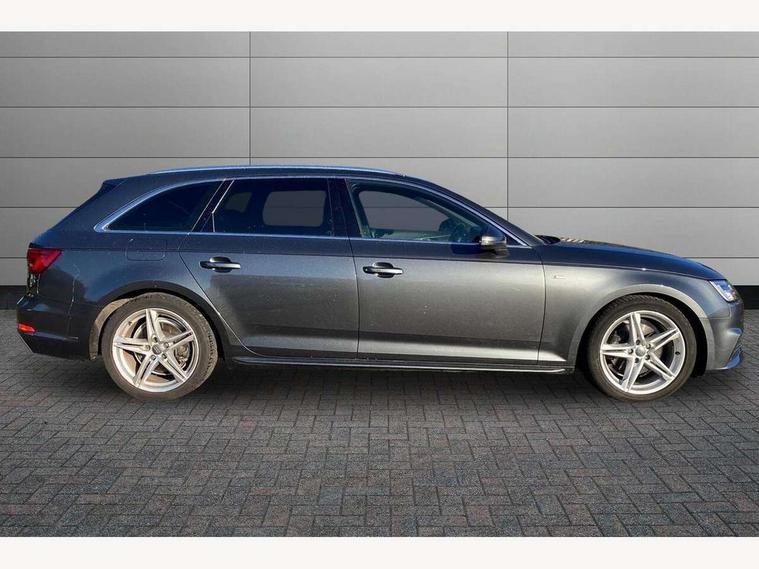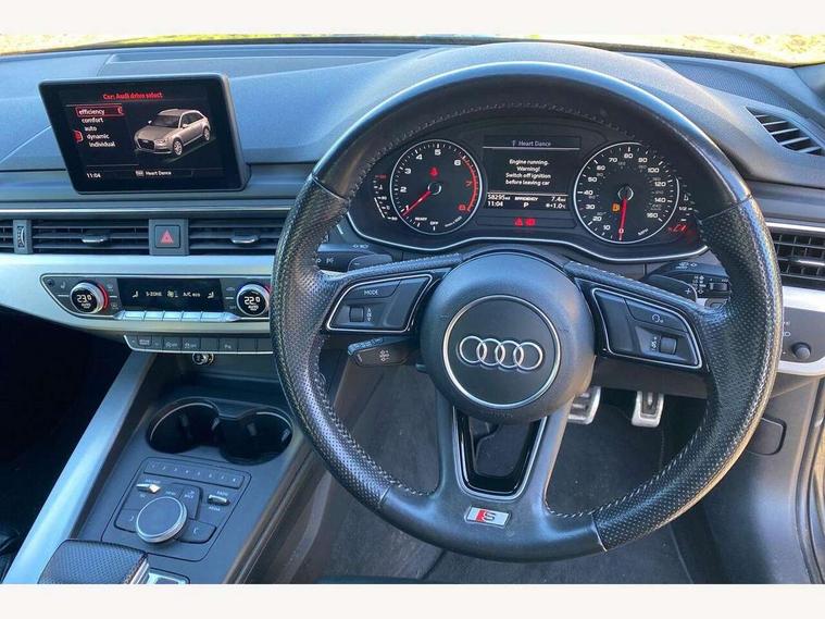 Audi drive select, Audi Pre sense collision avoidance, Electro-mechanical PAS, Power boot opening and closing, Service interval indicator, Stop/start button, Voice control system, 2 USB ports, Aux input, DAB digital radio module, MMI radio plus with CD player, Acoustic windscreen, Aluminium roof rails, Auto dimming rear view mirror, Automatic headlights + automatic windscreen wipers, Body colour bumpers, Body colour door mirrors, Chrome rolled exhaust, Electric adjustable heated door mirrors, Electric front windows, Electric rear windows, Headlight range control, LED daytime running lights, Rear diffuser in Twilight grey matt, Rear wiper, Twilight grey matt radiator grille with chrome inlay, 3 zone climate control, 4 way electric lumbar support for driver and front passenger, Black cloth headlining, Front centre armrest with 12v socket, Front sport seats, Front/rear floor mats, Gearshift paddles, Illuminated door sill finishers, Isofix child seat preparation for front passenger/outer rear seats inc passenger airbag deactivation, Jack and tool kit, Perforated leather gearknob, Reach + rake adjustable steering column, Rear headrests, Retractable load area cover, Split folding rear seats, Stainless steel pedals, Top tether anchor plate for isofix child seat, Exterior aluminium pack - A4, S line exterior styling pack - A4 Avant, 3 point seatbelts on all rear seats, ABS/EBD, Adaptive driver and front passenger airbags, Electromechanical parking brake, ESP, First aid kit, Front head airbags, Front seatbelt pretensioners + load limiters, Front side airbags, Seatbelt warning, Traction control, Tyre pressure monitoring system, Warning triangle, Locking wheel bolts, Remote central locking, Thatcham category 1 alarm + immobiliser, Space saver spare wheel,