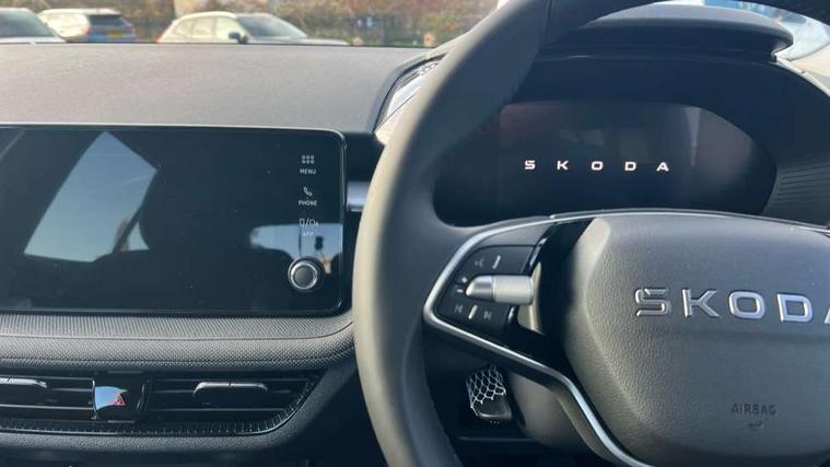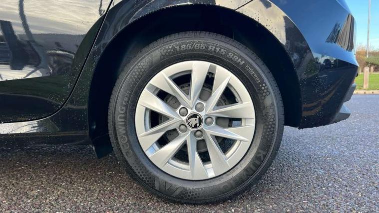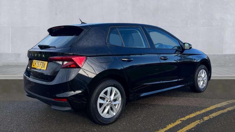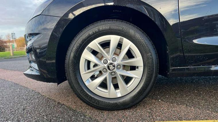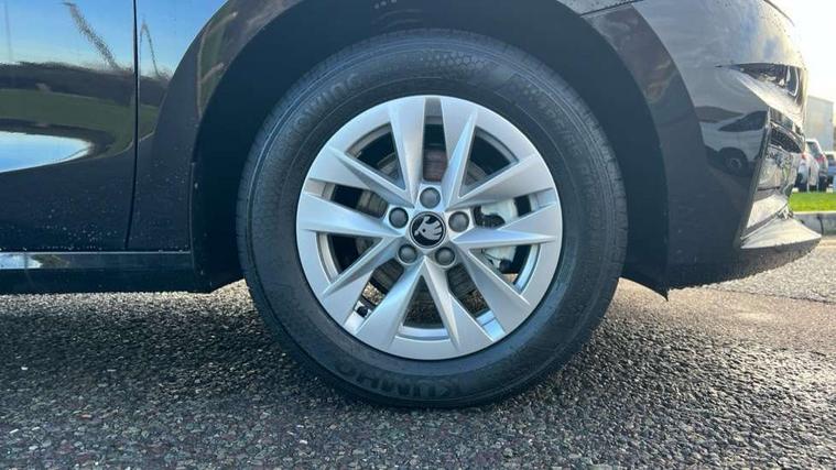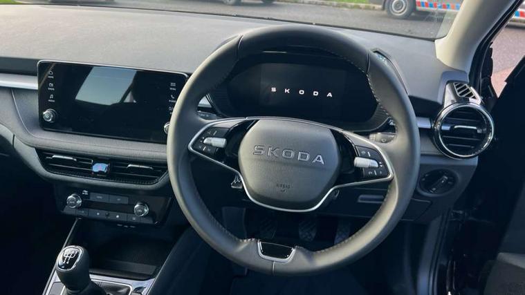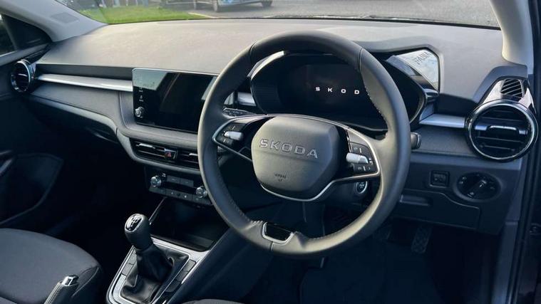 8" Digital instrument display, Advanced driver attention and drowsiness monitor, Bluetooth connection, Driver alert system, Electromechanical power steering, Exterior temperature gauge, Service interval indicator, Traffic sign recognition, Wireless SmartLink for Apple CarPlay and Android Auto, 6 Speakers (4 in front and 2 in rear), 8.25" Skoda infotainment touchscreen display, Auxiliary socket for external MP3 player, DAB digital radio reception, Auto dimming rear view mirror, Body colour door mirrors, Body coloured bumpers, Door mirror integrated indicators, Front and rear electric windows, Front window wiper intermittent control, Headlight range control - Automatic, LED 3rd brake light, LED daytime running lights with coming and leaving home feature, LED rear lights, Rear LED fog light, Rear side wing doors, Rear window wiper with washing nozzles, Roof mounted spoiler, SKODA tailgate lettering in chrome, Unique dark chrome design logo on alloy wheels, 2 reading lights in front and 2 reading lights in rear, 3 rear headrests, Backrest split and folding, Central console with removable cup holder and storage box, Chrome handbrake release button, Dual zone air conditioning with climatronic electronic control, Fabric upholstery, Front centre armrest, Gearshift knob/handle in leather, Grain satin black interior door handles, Hand brake lever handle in leather, Height adjustable front headrests, Height adjustable front seats, Height adjustable steering wheel, ISOFIX and TopTether anchorage points to the outer rear seats, ISOFIX and TopTether on the front passenger seat, Luggage compartment lighting, Manually adjustable lumbar support in front seats, Pollen filter, Rear seat bench unsplit, Single front passenger seat, Skoda lettering on steering wheel, Storm grey headlining, Sun visors with mirror and airbag label on passenger side, Textile floor mats, Ambient lighting pack - Fabia Hatchback, 3-point height adjustable front seats belts with pretensioner and force limiter, Automatic warning lights in case of crash, Driver and passengers airbag with switch off function, e-Call+, ESC including ABS, MSR, ASR, EDS, HBA and XDS, Front and rear seat belt warning, FRONT ASSIST (AEB City and AEB Inter Urban), Front side airbags, Head airbags, One tone horn, Pedestrian protection, Three rear 3-points safety seat belts with pretensioner and force limiter including stop function for outer rear seat belts, Tyre pressure monitoring system, Anti-theft alarm system including immobiliser, interior monitoring, backup horn, and towing protection, Central locking with radio remote control, interior controls, SAFE function and 2 foldable keys, Black painted air vents, Grain satin black central console cover, Metallic grey upper decorative trim, Satin black door and side trim panel in front, Textile Kota grey lower decorative inserts, Anti-theft wheel bolts protection, Super-low rolling resistance tyres,