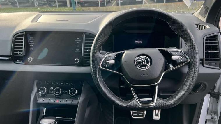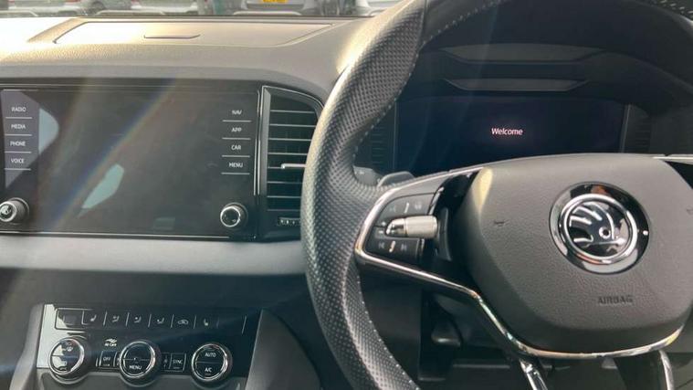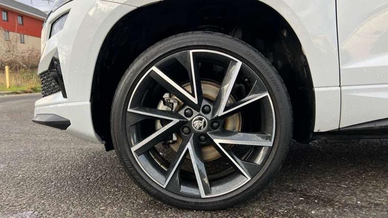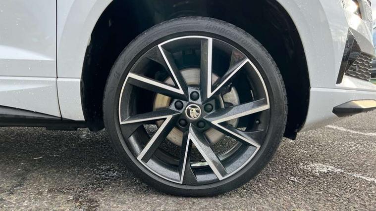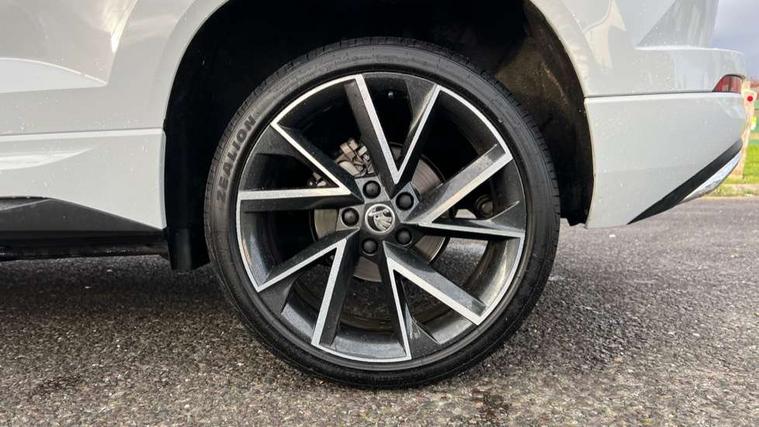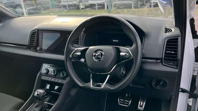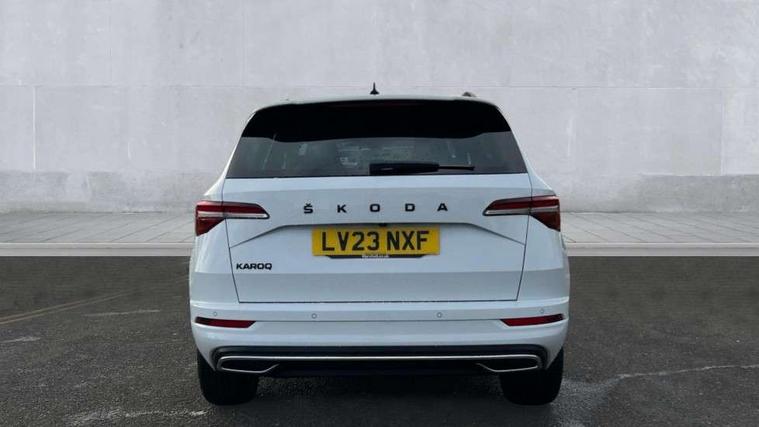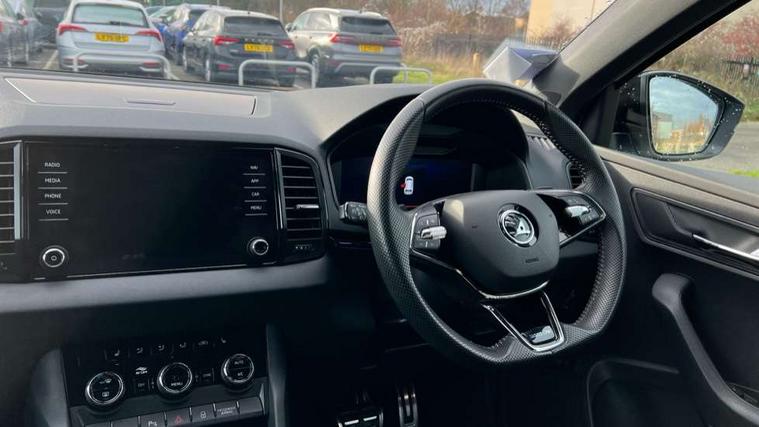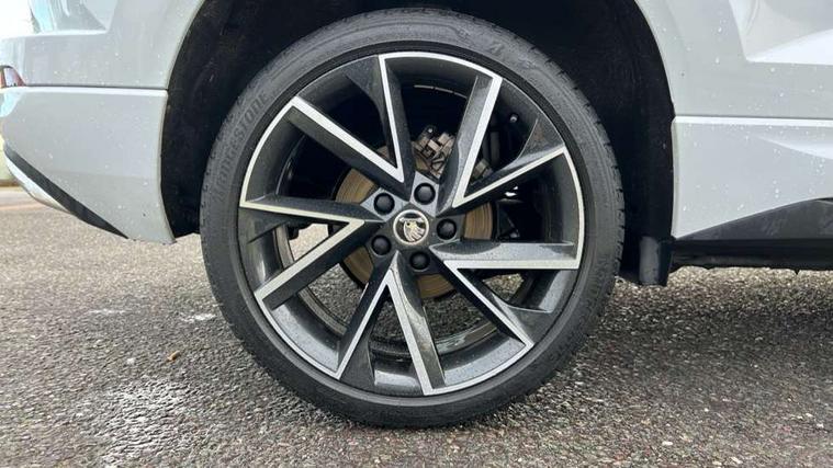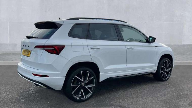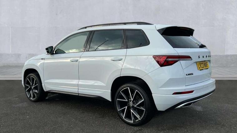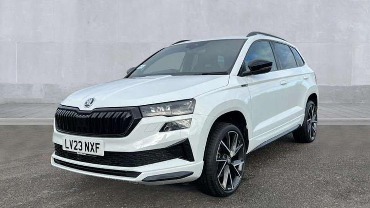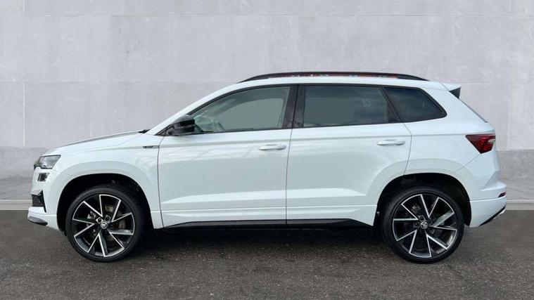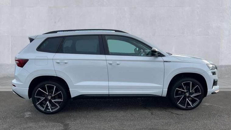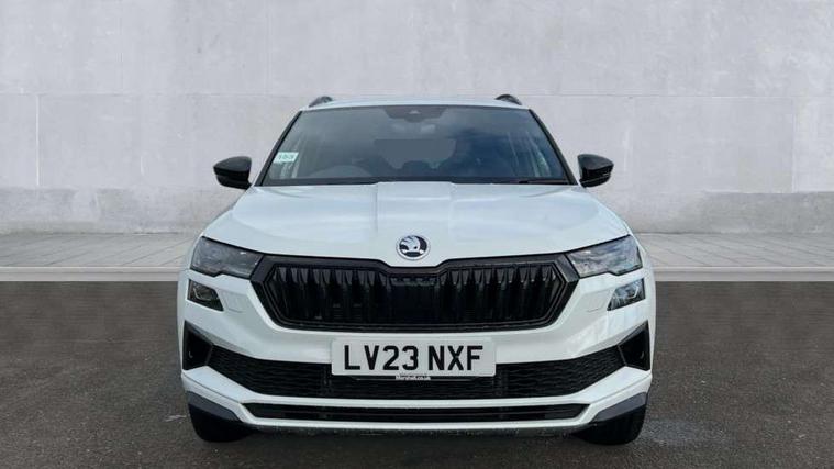 8" Digital display, Care connect, Driver fatigue sensor, Emergency services call system, Outside temperature gauge, Service interval indicator, SmartLink wireless for Apple and wired for Android, Start/stop system with regenerative braking, USB C Port x 2 in front centre console, Virtual cockpit, Virtual pedal with electrically operated boot door, 8 Speakers, DAB radio with Bluetooth, USB connection, Wireless charging without wireless aerial connection, Acoustic glass, Aero front windscreen wipers with intermittent function, Auto dimming rear view mirror with light and rain sensors, Black door mirrors, Black electric window control buttons, Black radiator grille, Black roof rails, Body colour door handles, Dynamic headlight range control with cornering light function, Electric front and rear windows with child proof lock, Front door steps with SportLine logo, Heated rear windscreen, LED daytime running lights, LED rear lights with high functionality welcome effect and dynamic indicators, Light assistant (coming/leaving home/tunnel light), Panoramic sliding sunroof, Plastic scuff plates, Privacy glass, Protective door side sills in body colour, Rear diffuser, Rear side wing doors, Rear spoiler, Rear window wiper with washer system and intermittent control, Safety reflectors on front doors, Skoda lettering on tailgate in black, Sportline badge on front fender, Sportline decorative inserts with badging, Sports front and rear bumpers, 1.5 litre bottle holders in driver and front passenger door panels, 12V socket in boot, 12v socket in front centre armrest with storage compartment and rear air vents, 3 rear height adjustable headrests, 3 seat bench in 2nd row, 3 spoke leather sports multifunction steering wheel and silver stitching with gear shift paddles, 4 foldable roof handles with rear coat hooks, Black floor carpet, Black roof headlining, Chrome inner door handles, Double sided boot floor, Foldable hooks in the boot, Front head restraints, Height adjustable front three point seats belts with tensioners, Height/reach adjust steering wheel, Ice scraper, Illuminated glovebox, Illuminated luggage compartment, Isofix child seat preparation outer rear, Manual lumbar support for front seats, Pen holder, Pollen filter, Rear boot cover, Rear reading lights, Rear seats fixed folding and divided 60:40, Rubbish bin door, Safety vest holder, Single front passenger seat, Storage box in upper central dashboard closed, Sunvisors with illuminated vanity mirrors, Textile floor mats, Ticket holder, Titan black interior ceiling, Welcome animation with sportline logo, Boot pack - Karoq, Light Pack - Karoq, Parking pack - Karoq, Automatic door unlocking in case of crash, Automatic fuel cut off in case of crash, Child locks on rear doors, Driver airbag, Electronic parking brake with auto hold function, Emergency rear braking signal, ESC including ABS, MSR, ASR, EDS, HBA, DSR, RBS, MKB and traction control, Front side airbags, Hill hold control, Knee airbags, Passenger airbag with switch-off function, Pedestrian monitor, Seatbelt reminder signalisation and pretensioner for all seats, Three point seatbelts rear, Two tone horn, Tyre pressure display, Tyre pressure monitor, Alarm with interior monitoring, back up horn and tilt sensor with safe function, Electronic engine immobiliser, Keyless entry and start/stop, Remote central locking with 2 remote folding keys, Black air vent surround, Black centre console, Satin black dashboard, Satin black door trim, 19" Vega black polished alloy wheels, Anti-theft wheel bolts protection, Matt black aero hub caps, Storage on wheel cover, Tool kit,