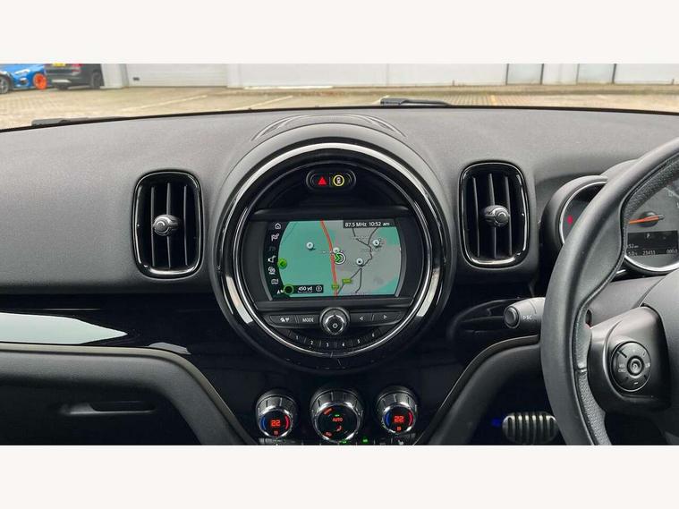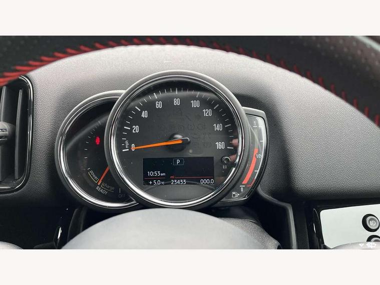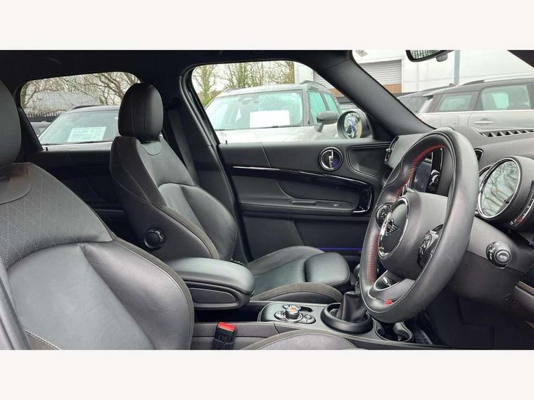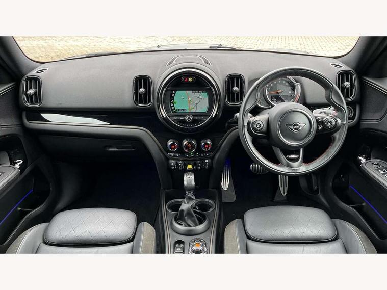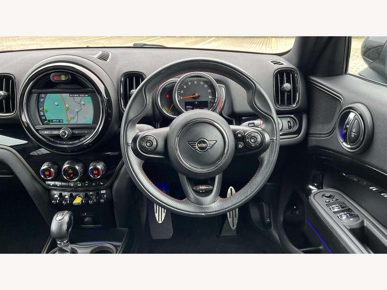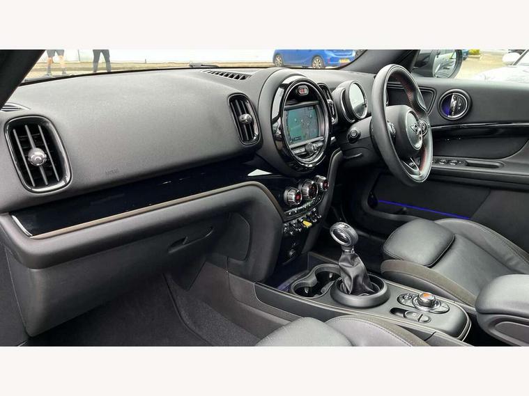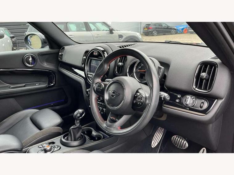Active Guard incl speed limiting and lane departure functions with auto steering, and front collision warning with brake intervention, Automatic start/stop function with brake energy recuperation, eDrive button, Electro-mechanical speed dependant steering assistance, Instrument cluster, MINI Driving Modes - centre toggle switch to control driving setting (sport, mid and green), Mini E-call, MINI TeleServices, On board computer, Rear parking distance control, Automatic transmission, Charging flap on front left lower A-panel, Double Vanos system, Fully variable valve control, High precision injection, Performance Control, FM tuner and DAB digital radio, Bonnet scoop, Chrome border honeycomb structure radiator grille with S badge, Chrome fuel filler cap, Day time driving lights, Dynamic brake lights, Electric windows, Heated rear window, Heated windscreen washer jets, John Cooper Works - aerodynamic kit (front and rear apron, spoiler), front and rear sport bumpers and part-painted side sills with door sill finishers, John Cooper Works Logo, John Cooper Works rear spoiler, Metal door sill strips with Cooper S imprint, Model logo, Model logo on Tailgate, Rain sensor with auto headlights, Rear fog lights, Rear window wiper, Side scuttle panel with integrated indicator, Split rear doors, Sun/heat protection glass, Twin exhaust tailpipe, White indicator lenses, 12V Accessory socket in centre console, 360L luggage compartment capacity, 4 lashing eyes in luggage compartment, 40:20:40 split folding rear seats, Anthracite headlining with grab handles and clothes hooks, Chrome interior highlights, Colour line - Carbon black, Cupholders, English handbook, Front headrests, Glove compartment, Height and length steering column adjustment, Interior lighting with 12 basic colours selectable via toggle switch in roof, Isofix rear child seat preparation, John Cooper Works perforated leather steering wheel with contrast stitching in chilli red and John Cooper Works logo, Leather gearshift lever and handbrake gaiters, LED reading lights, vanity mirror lights, front foot well light and spotlight on front seats, Manual air conditioning, Mechanical seat adjustment, driver seat height adjust, forward/back and front seats backrest, Multifunction steering wheel, Passenger seat height adjuster, Rear headrests, Storage compartments in doors, Sunvisors with vanity mirrors, Excitement pack - Countryman, Navigation pack - Countryman, 2 tone horn, 3 point seatbelts on all seats, 6 Airbags - front, side, head and seat belt tensioners, Anti-lock braking system (ABS), DSC - Dynamic Stability Control, Electronic handbrake, Front and rear disc brakes, Hill start assist, Tyre pressure monitoring system, Alarm system with tilt sensor, monitoring doors, bonnet interior and tailgate, Auto drive away locking, Deadlocking function, Electronic vehicle immobiliser, Locking wheel bolts, Start/stop toggle with keyless go, Tool kit,