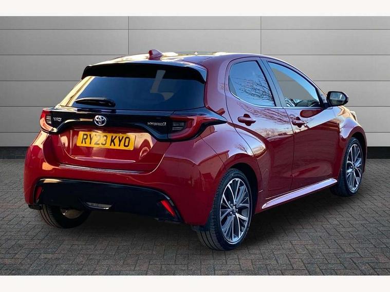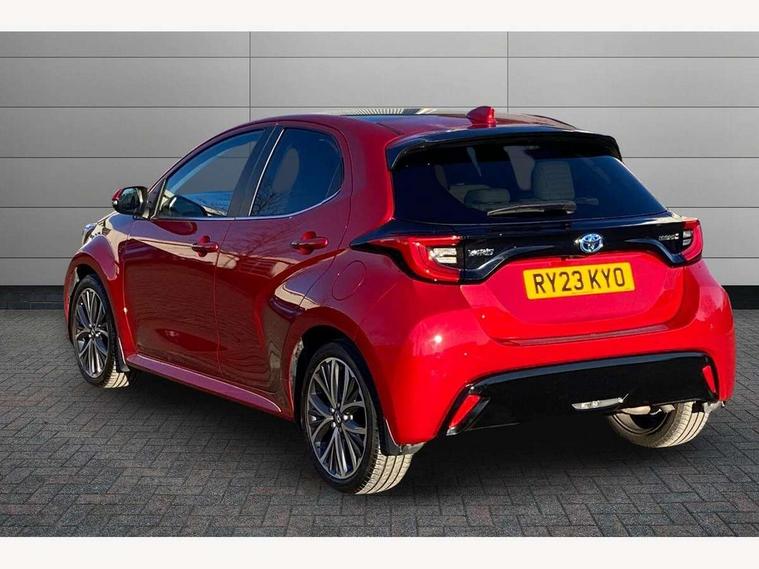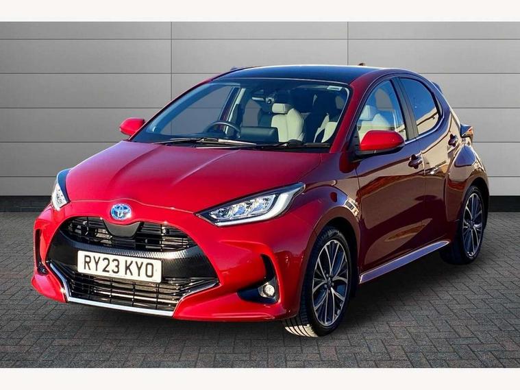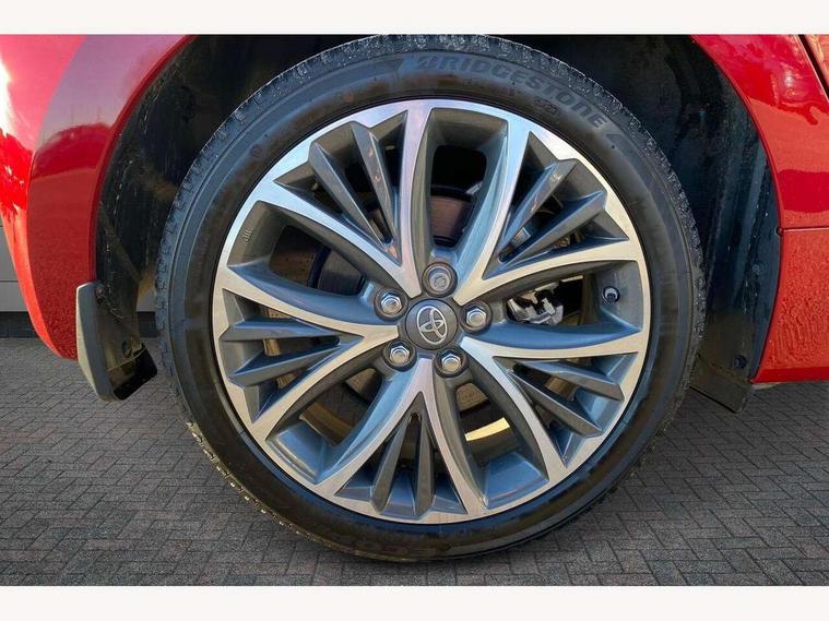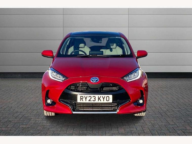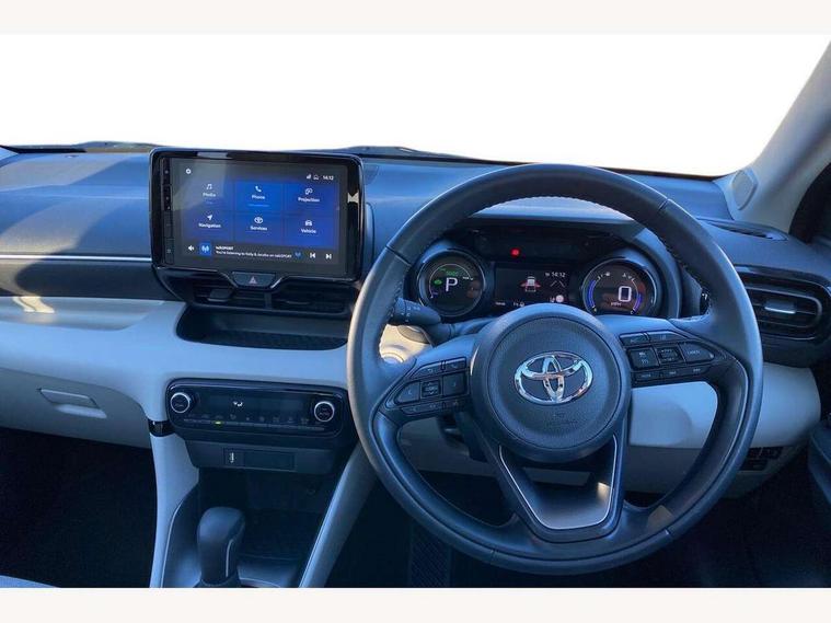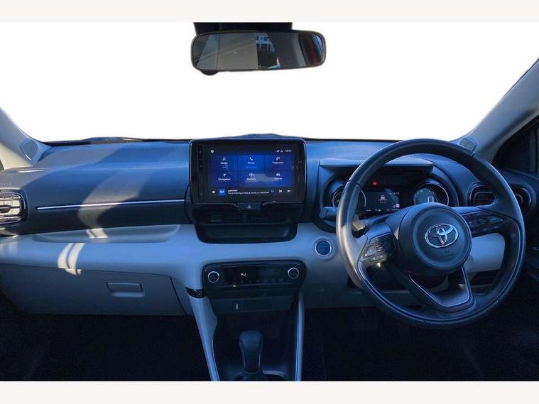Adaptive cruise control, Adjustable speed limit with speed warning, Blind spot monitoring, Bluetooth connectivity, Colour binocular inspired displays with digital speedometer, E-call, Electric power steering, Hybrid energy display, Multi information display switches on steering wheel, Reversing camera, Smartphone integration with Apple CarPlay and Android auto, Tailgate, Touch 2 navigation system, Voice recognition, Vehicle Stability Control (VSC), 6 speakers, 9" HD multimedia display touch screen with Toyota smart connect, USB connection, Acoustic windscreen glass, Auto windscreen wipers, Automatic headlights, Automatically retractable door mirrors, Body coloured door mirrors, Electric adjustable heated door mirrors, Follow me home headlights, Front auto power windows with anti jam protection, Full LED rear lights, LED daytime running lights, LED front fog lights, LED front light guide, LED Headlights, LED High mounted stop lamp, LED Indicators, LED rear light guide, Manual headlight levelling, Painted chequered front grille, Rain sensor, Rear auto power windows with anti jam protection, Rear privacy glass, Rear side wing doors, Rear spoiler, Rear wiper, Satin lower front grille, Shark fin antenna, Turning signal integrated indicators in door mirrors, Variable front intermittent wipers, 3 adjustable rear headrests, 3 seat bench in 2nd row, 3 spoke leather steering wheel, 60/40 split folding rear seat, Active headrests, Adjustable boot height, Coat hooks in rear grab handles, Cup holders (2 front & door), Data Communication Module (DCM) connected services, Dual zone automatic air conditioning, Fabric seat with partial synthetic leather upholstery, Front armrest, Front sport seats, Glovebox, Grey roof lining, Height adjustable driver's seat, Height adjustable passenger seat, Isofix seat fixing, Leather gearshift, Map pockets on the backs of the front seats, Pollen filter, Shopping bag hooks, Single front passenger seat, Tilt/telescopic steering column, Parking pack - Yaris, 3 point seatbelts on all rear seats, ABS+EBD+Brake assist, Electronic parking brake, Emergency brake light system (EBS), Front passenger airbag on/off switch, Front seatbelt reminder, Hill start assist control (HAC), Rear child proof door locks, Rear seat belt reminder, Supplemental Restraint System (SRS) 8 airbags: Driver & passenger's airbags, dual side curtain airbags, side impact airbags, front centre airbag, Toyota Safety Sense 2, Precollison + Night time Pedestrian & Cyclist Detection, Lane Trace Assist, Auto High Beam, Intelligent ACC & Road Sign Assist, Tyre pressure warning system, 2x Master key, Alarm/immobiliser, Keyless smart entry with push button start, Remote AC via MyT, Remote locking via MyT, Remote powered central double locking doors, Satin chrome interior styling, Soft touch instrument panel, Space saver spare wheel,