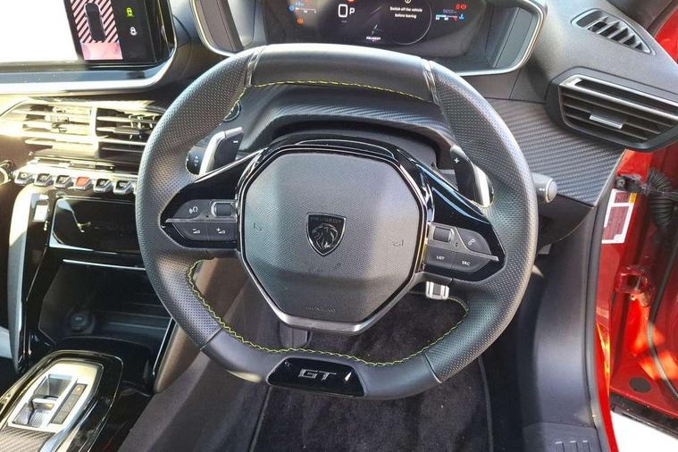Bluetooth telephone facility, Driver attention warning, E-call, Exterior temperature indicator with ice warning, Multi function trip computer, PEUGEOT i-Cockpit with compact steering wheel, PEUGEOT i-Cockpit with configurable 3D headup instrument panel, PEUGEOT SOS and assistance, Smartphone charging plate, Speed limit recognition and recommendation, Wireless mirror screen with mirror link, apple carplay and android auto, Petrol Particulate Filter, 1x USB-C socket in rear and 1x USB-A socket in rear, 2 USB-C ports in the front, 6 speakers radio with mp3 compatible, DAB Radio (Digital Audio Broadcasting), Voice recognition for radio, navigation and telephony features, 2 X Rear number plate lights, Aluminium door sill scuff plates with peugeot lettering, Automatic hazard light activation upon heavy brake application, Black diamond roof, Black front wing trim with gloss black detail and GT badging, Body coloured exterior door handles, Dark tinted rear side and tailgate windows, Diamond black mirror shells, Diamond black rear roof spoiler, Electric, heated, and power folding door mirrors, Frameless electrochrome interior rear view mirror, Front bumper - Meteor grey lower trim, Full LED headlights with smartbeam assist with auto height adjustment, Gloss black finish on B pillar, Gloss black rear cluster connecting strip, Gloss black roof bars, Gloss black window surround, GT model designation badging on tailgate, Headlights left on audible warning, LED daytime running lights with distinctive 3 claw signature, LED side indicator lights integrated into door mirrors, LED third brake light, Model designation badges front and rear, One touch electric front/rear windows with pinch protection, Radiator grille - body coloured vertical chequered grille, Radiator grille - gloss black top edge trim, Rear full LED 3D peugeot signature claw effect lights with daylight function, Rear reversing lights, Rear side wing doors, Rear windscreen wiper triggered automatically in reverse gear, Tailgate with heated rear windscreen and wiper blade, Twin chromed exhaust pipes, Wheel arch extensions, 1/3 to 2/3 split folding rear seats, 12V socket, 3 seat bench in 2nd row, 8 Colour personalisable ambient lighting, Automatic air conditioning with pollen and active carbon filter, Central front armrest with storage compartment, Driver and front passenger sport seats, Electric power steering with reach and rake adjustable steering column, Front and rear carpet mats in black, Front LED interior light with 2 reading spotlights and rear interior light with timer, Front passenger seat manual adjustment - height, longitudinal and back rest angle, High centre console, ISOFIX child seat mounting points on passenger seat, Mistral full-grain perforated leather steering wheel with Lime Green stitch detail and satin chrome 'GT' emblem, Multifunction steering wheel, Piano keys: Gloss black and chrome toggle switches to access main functions of the vehicle and touchscreen functions, Roof lining - Mistral black, Seatbelt unfastened on the move audible and visual alert for front and rear seats, Single front passenger seat, Two position modular boot floor, Visibility pack - 2008, 2x 2nd row ISOFIX child seat mountings, ABS (Anti-lock Braking System) with EBD (Electronic Brakeforce Distribution) and EBA (Emergency Braking Assistance), Active safety brake with night function/cyclists/pedestrians, Adaptive driver and front passenger airbags with passenger airbag deactivation function, Child locking functionality on rear doors, Driver/front passenger side airbags, Electric parking brake, ESP (Electronic Stability Program) + Hill Start Assist, Front and rear curtain airbags, Front and rear disc brakes, Front and rear three-point retractable seatbelts, with force limiters, Front optimised safety headrests and rear retractable headrests (x3), height adjustable, Tyre pressure sensor, Automatic door locking when moving off, Deadlocks, Electronic code immobiliser, Peugeot Open and Go (keyless entry and push button start), Thatcham category 1 alarm, Carbon effect Dashboard, front and rear door panel finish,