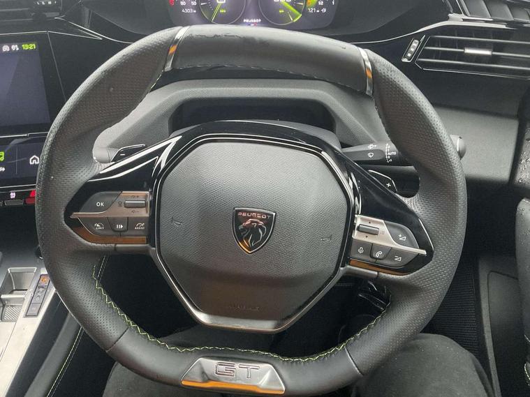 Bluetooth telephone facility, Compact drive selector, Driver attention warning, Emergency call service, Exterior temperature indicator with ice warning, Front and rear parking sensors, Intelligent speed adaptation, Lane keep assist, Mirror screen with wireless apple carplay and android auto, Multi driving mode selector - Eco / Normal / Sport mode selector, Multi function trip computer, Peugeot connect advanced with connected 3D navigation, PEUGEOT i-Cockpit - compact steering wheel, 10" HD colour touchscreen with configurable 3D headup instrument panel, PEUGEOT SOS and assistance, Service interval indicator, Speed limit recognition and recommendation, Sport pedals with foot rest, DAB Digital radio, Peugeot customisable iToggles, Voice recognition for radio, navigation and telephony features, 2 X LED rear number plate lights, Acoustic and tinted windscreen, Acoustic laminated front side windows, Automatic hazard light activation upon heavy brake application, Automatic triggered rear windscreen wiper in reverse gear, Body colour door handles, Body colour rear roof spoiler, Dark chrome chequered radiator grille, Dark tinted rear side and tailgate windows, Electric operated/heated door mirrors, Extended lower body sills to the front and side, Frameless electrochrome rear view mirror, Front and rear electric windows with one touch/anti pinch, Full LED matrix headlights with automatic adjustment, Gloss black finish B pillar, Gloss black rear cluster connecting strip, GT model designation badging on tailgate, High beam assist, LED 3rd brake light, LED side indicator lights integrated into door mirrors, Lion emblem badging on front wings, Model designation badges on front and rear, Nera black door mirrors, Peugeot aluminium door sills, Peugeot signature LED daytime running lights, Power folding door mirrors, Rear full LED 3D Peugeot new claw effect lights with sequential welcome sequence upon unlocking the vehicle, Rear lower bumper gloss black diffuser effect trim, Rear reversing lights, Rear side wing doors, Tailgate with heated rear windscreen and wiper blade, Twin exhaust pipes with chrome surround, 1/3 to 2/3 split folding rear seats, 12V socket, 2 front USB socket including 1 USB type c, 3 seat bench in 2nd row, 8 Colour personalisable ambient lighting, Automatic air conditioning with AQS 3, Carpet mats, Central front armrest with storage compartment, Dynamic front seats, Electric power steering with reach and rake adjustable steering column, Front central console with two cup holders, LED Glovebox light, Manual driving mode - change gear manually via steering mounted paddles, Multifunction full grain leather steering wheel with admite green stitching & GT badging, Piano keys gloss black plated toggle switches to access main functions of the vehicle, Roof lining - Mistral black, Seatbelt unfastened on the move audible and visual alert for front and rear seats, Single front passenger seat, Ski hatch with central rear armrest with cup holder, Sunvisor with concealable mirrors and LED lighting, Twin USB charging ports in the rear (Type C), Driver sport pack with sports power steering - 308, Visibility pack with automatic magic wash windscreen wipers - 308, 2x Isofix child seat fitting on outer rear seats, 3x Rear three-point retractable seatbelts with force limiters in the outer rear seats, ABS + EBD + EBA, Active safety brake with night function/cyclists/pedestrians, Adaptive driver and front passenger airbags with passenger airbag deactivation function, Automatic post collision braking, Child locks on rear doors, Driver/front passenger side airbags, Electronic parking brake, ESP, Front and rear curtain airbags, Front optimised safety headrests and rear retractable headrests (x3), height adjustable, Front three point retractable seatbelts with force limiters, Front/rear disc brakes, Hill start assist, Tyre pressure sensor, Automatic door locking when moving off, Deadlocking system, Electronic code immobiliser, Locking wheel nuts, PEUGEOT Open and Go keyless entry system, Thatcham cat. 1 alarm with anti lift sensor,