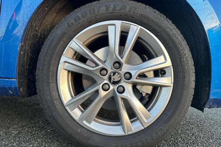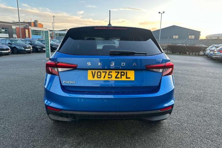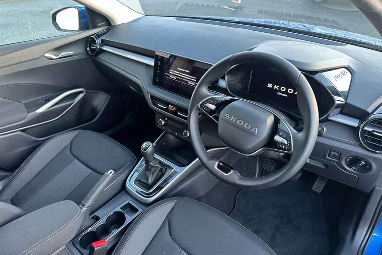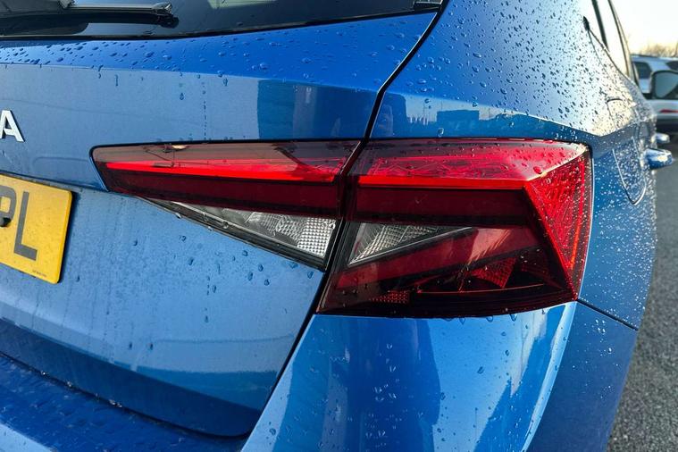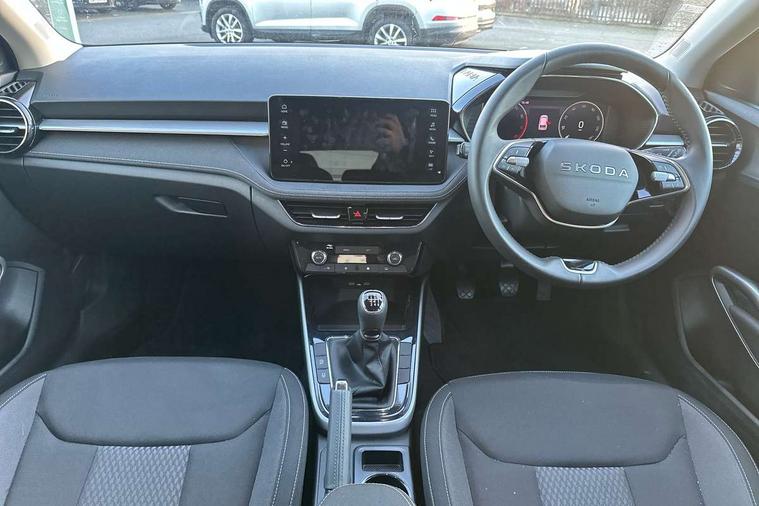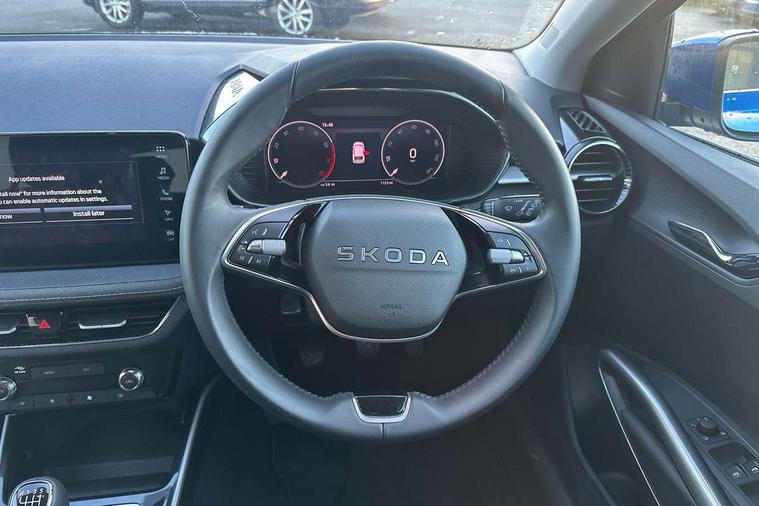 Advanced driver attention and drowsiness monitor, Bluetooth connection, Driver alert system, Electromechanical power steering, Exterior temperature gauge, Service interval indicator, Traffic sign recognition, Virtual cockpit with 10.25" colour display, Wireless SmartLink for Apple CarPlay and Android Auto, 6 Speakers (4 in front and 2 in rear), 9.2" colour display skoda navigation system with voice control and web radio, Auxiliary socket for external MP3 player, DAB digital radio reception, Auto dimming rear view mirror, Body colour door mirrors, Body coloured bumpers, Chrome window surround, Door mirror integrated indicators, Front and rear electric windows, Front window wiper intermittent control, Headlight range control - Automatic, Ice scraper in fuel cap, LED 3rd brake light, LED daytime running lights with coming and leaving home feature, LED rear lights, Privacy glass, Rear LED fog light, Rear side wing doors, Rear window wiper with washing nozzles, Roof mounted spoiler, SKODA tailgate lettering in chrome, Unique dark chrome design logo on alloy wheels, 2 LED reading lights in front and rear, 3 rear headrests, Backrest split and folding, Central console with fixed cup holder and storage box, Chrome handbrake release button, Comfort seats, Door sills with fabia badging, Dual zone air conditioning with climatronic electronic control, Fabric upholstery, Front centre armrest, Gearshift knob/handle in leather, Grain satin black interior door handles, Hand brake lever handle in leather, Height adjustable front headrests, Height adjustable front seats, Height adjustable steering wheel, ISOFIX and TopTether anchorage points to the outer rear seats, ISOFIX and TopTether on the front passenger seat, Luggage compartment lighting, Manually adjustable lumbar support in front seats, Pollen filter, Rear seat bench unsplit, Single front passenger seat, Skoda lettering on steering wheel, Storm grey headlining, Sun visors with mirror and airbag label on passenger side, Textile floor mats, Ticket holder, Umbrella in drivers door, Ambient lighting pack - Fabia Hatchback, 3-point height adjustable front seats belts with pretensioner and force limiter, Automatic warning lights in case of crash, Driver and passengers airbag with switch off function, e-Call+, ESC including ABS, MSR, ASR, EDS, HBA and XDS, Front and rear seat belt warning, FRONT ASSIST (AEB City and AEB Inter Urban), Front side airbags, Head airbags, One tone horn, Pedestrian protection, Three rear 3-points safety seat belts with pretensioner and force limiter including stop function for outer rear seat belts, Tyre pressure monitoring system, Anti-theft alarm system including immobiliser, interior monitoring, backup horn, and towing protection, Central locking with radio remote control, interior controls, SAFE function and 2 foldable keys, Chrome edged air vents, Grain satin black central console cover, Metallic grey upper decorative trim, Satin black door and side trim panel in front, Textile microsuede grey lower decorative trim with art grey stitching, Anti-theft wheel bolts protection, Super-low rolling resistance tyres,