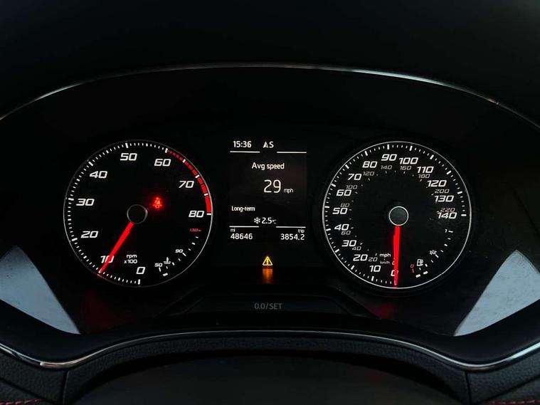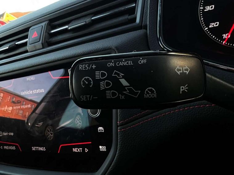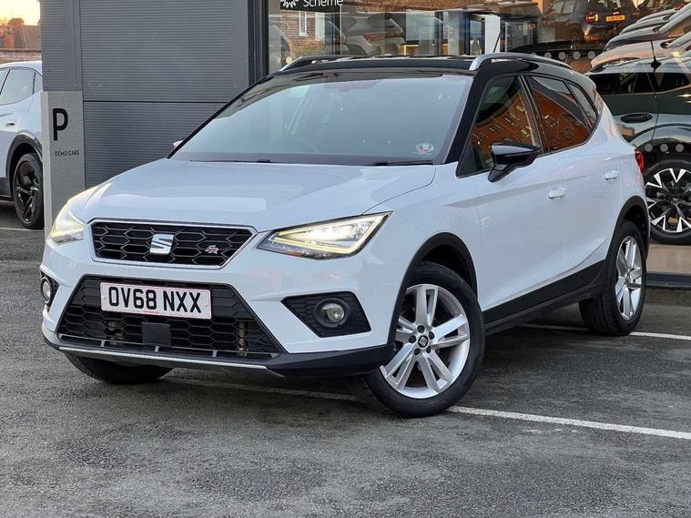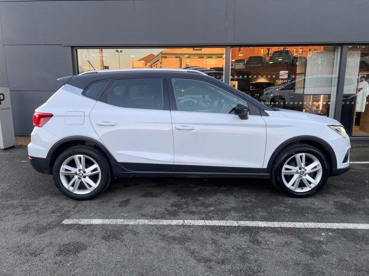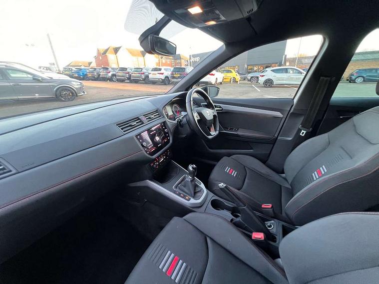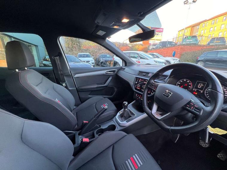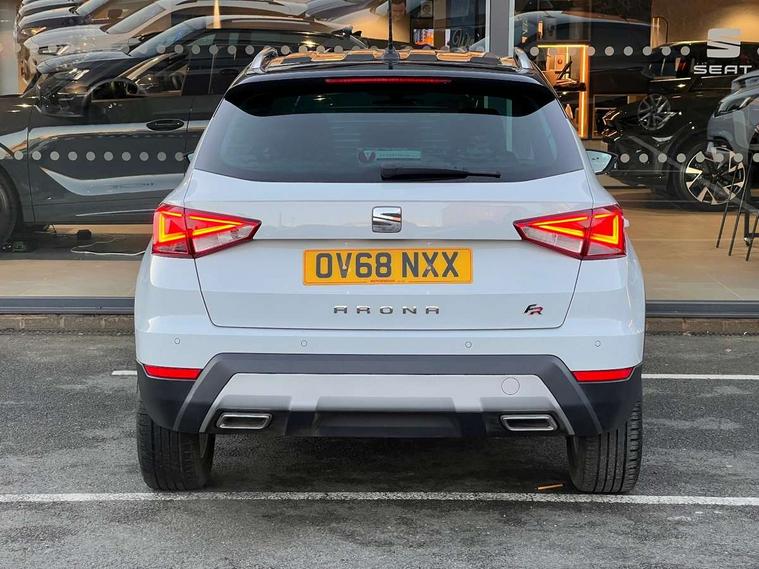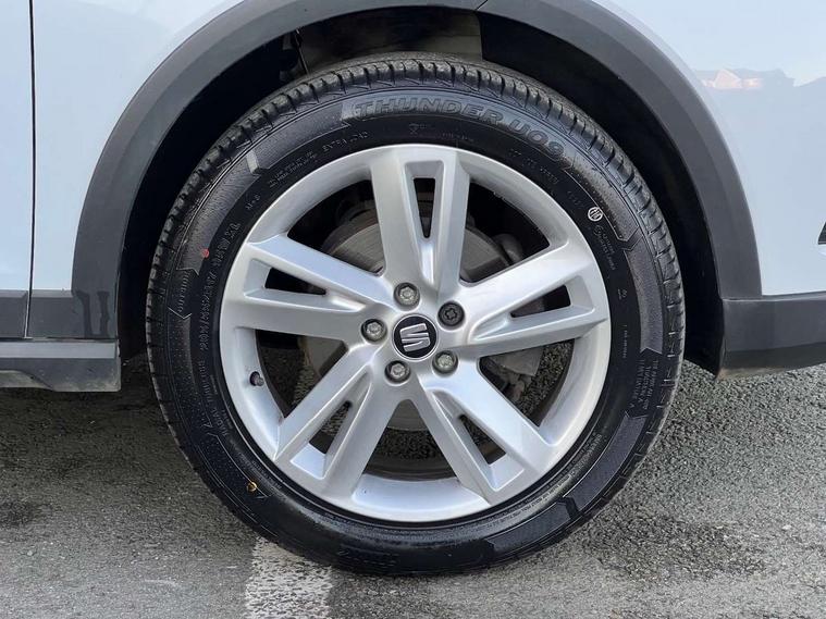 'Lights On' Reminder warning buzzer, Cruise control, Digital clock, Electric speed sensitive power steering, Front assistant collision mitigation, Full Link Smartphone Integration with Mirror Link, Apple Car Play, Google Android Auto, Low fuel warning light, Outside temperature display, Rear parking sensor, RPM counter, SEAT Drive profile, Trip computer, Sports suspension, 6 speakers, Bluetooth interface for hands free and audio streaming, DAB Digital radio, Steering wheel mounted audio controls, Anti theft roof antenna, Auto dimming interior rear view mirror, Automatic activation of hazard warning lights, Automatic headlights, Body coloured bumpers, Body coloured door handle inserts, Chrome grille surround, Chrome roof rails, Chrome window surround, Coming/leaving home lighting function, Dark tinted rear windows, Electric front/rear windows with one touch/auto up/down, Electrically adjustable and heated door mirrors, Electrically folding wing mirrors, Front fog lights, Full LED headlights, LED daytime running lights, LED licence plate lighting, LED tail lights, Rain sensor windscreen wipers, Rear fog lights, Rear window wash/wipe, Roof colour door mirrors, Twin exhaust pipes, Visible VIN plate, Windshield wiper with intermittent control and potentiometer, 2 cupholders, 3 rear height adjustable headrests, 60/40 split folding rear seat, Active head restraints, Ambient interior lighting, Card holder, Double boot floor, Driver and passenger sunvisors, Driver/front passenger seat height adjustment, Dual zone climate control, Dust/pollen filter, Flat bottomed steering wheel, Footwell ambient lighting, Front courtesy lights, Front reading light, Gear shift indicator, Height/reach adjustable steering column, Illuminated boot, Instrument lighting with brightness control, Isofix attachments on outer rear seats, Leather handbrake, Leather steering wheel and gear knob, Multi-colour ambient interior lighting, Nora cloth upholstery, Sports seats, Connectivity pack plus - Arona, 3 point seatbelts on all rear seats, ABS+EBA, Child locks on rear doors, Driver/Front Passenger airbags, Electronic stability control, Front and rear seatbelt reminder, Front side/curtain airbags, Height adjustable active front headrests, Hill hold control + Tyre Pressure monitor, Multi-Collision braking, Passenger airbag deactivate switch, Tiredness recognition system, Traction control, 2 folding remote keys with window open/close function, Alarm with back-up horn, Immobiliser, Locking wheel bolts, Remote central locking + deadlocks, Tow away protection, Interior chrome line trim, 17" Dynamic alloy wheels,
