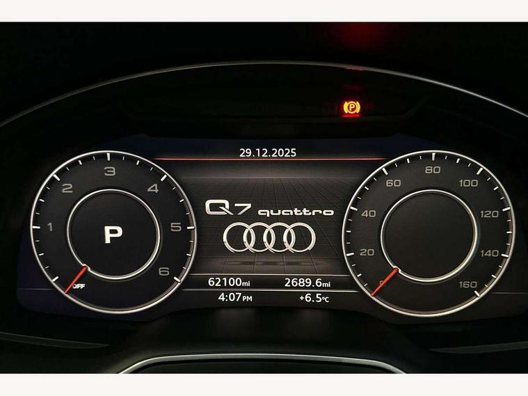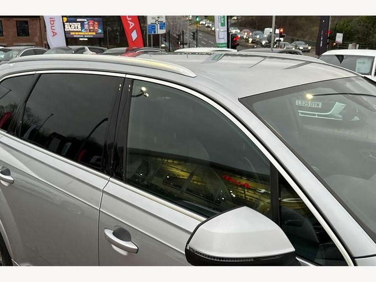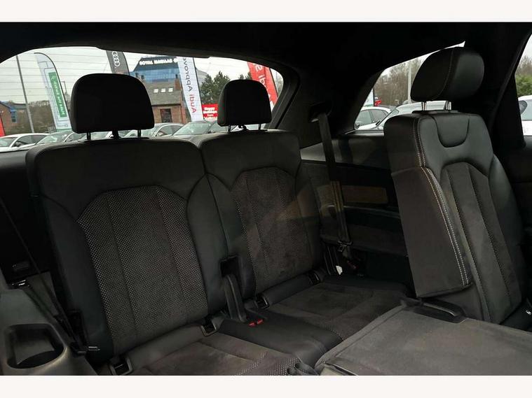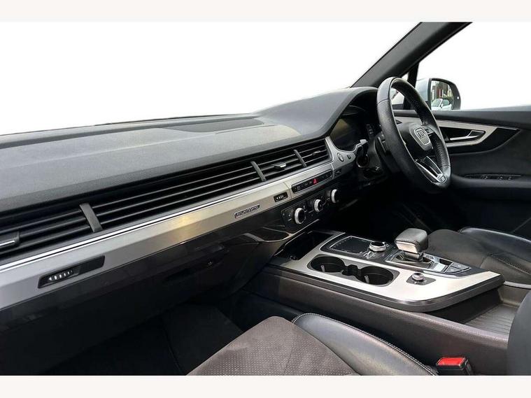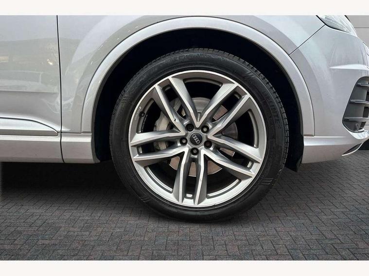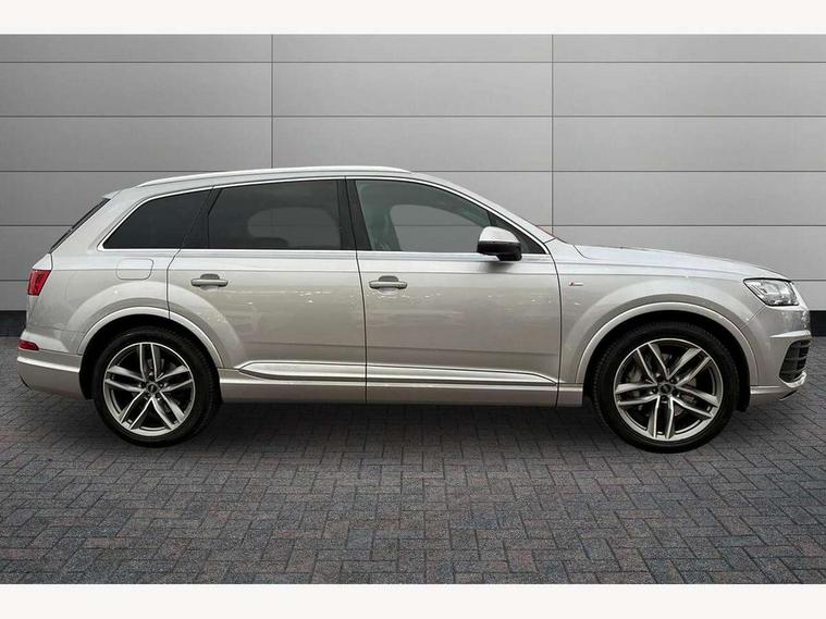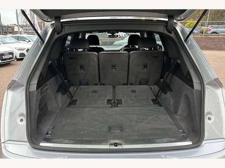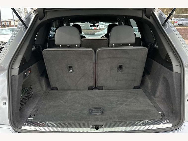 8.3" central fold-down colour display with high-resolution graphics, Audi connect safety and service (e-call), Audi drive select, Audi phone box with wireless charging, Audi smartphone interface, Audi virtual cockpit - 12.3" high-resolution LCD display with fully customisable instrument cluster, Colour driver's information system display, MMI - Multi Media Interface control system, MMI navigation plus with MMI touch, Mobile phone preparation with bluetooth interface, Power tailgate, Service interval indicator, Servotronic speed related PAS, Speed limiter, Start/Stop system with energy recuperation, Voice control system, Adaptive air suspension, 2 USB ports, 2x SD card slot, Audi music interface, Aux-in socket, DAB digital radio module, DVD System, MMI radio plus, Acoustic windscreen, Auto dimming rear view mirror, Electric front+rear windows, Electric/heated/folding door mirrors with memory, Green tinted heat insulating glass, Headlight washers, High beam assist, LED daytime running lights, Loading sill protector in stainless steel, Platinum grey front lip spoiler, Privacy glass, Rain and light sensors, Rear wiper, Roof spoiler, S Line badge on wings, S Line body styling, S Line front and rear bumpers, 2 cupholders in front centre console, 35/30/35 split fold 2nd row seats, Door sill trims with S line logo, Electric 3rd row 50/50 split/fold, Front ashtray and cigar lighter, Front centre comfort armrest with storage + cupholders, Front head restraints, Front/rear floor mats, Gearshift paddles, ISOFIX child seat mounting for 6 passenger seats with front passenger airbag deactivation includes top tether, Leather gear knob, Luggage compartment cover, Rear centre armrest with 2 cupholders, Rear headrests, Stainless steel pedals, Sunvisors with illuminated vanity mirrors, Interior light pack - Q7, 3 point seatbelts on all seats, ABS+Electronic Brake force Distribution, Curtain airbags, Driver and passenger airbags, EDL + ASR, Electrically operated child locks on rear doors, Electromechanical parking brake, Electronic stability control, Front side airbags, Hill descent control, Hill hold assist, Seatbelt warning, Traction control, Tyre pressure loss indicator, Warning triangle and first aid kit, Anti theft alarm, Anti-theft wheel bolts, Immobiliser, Keyless Go access/ignition system, Remote central locking, Chrome door inserts, Tool kit, Tyre repair kit,