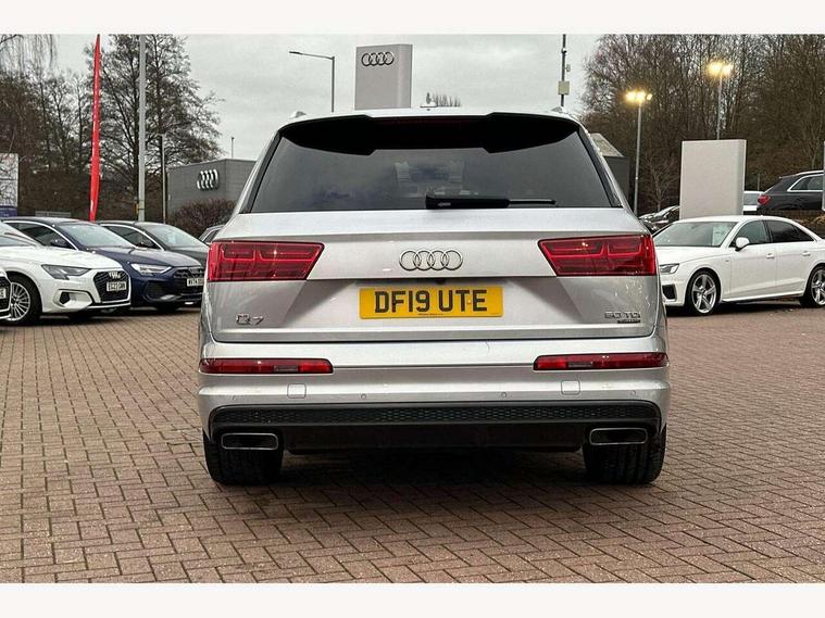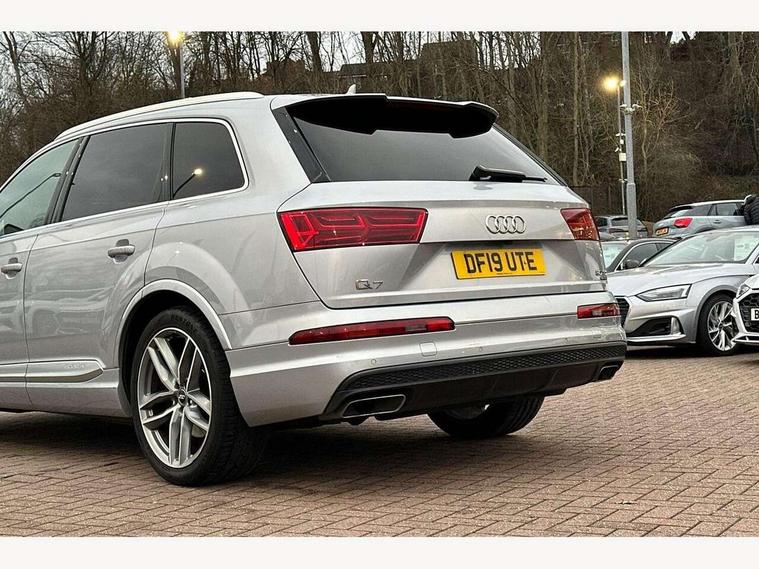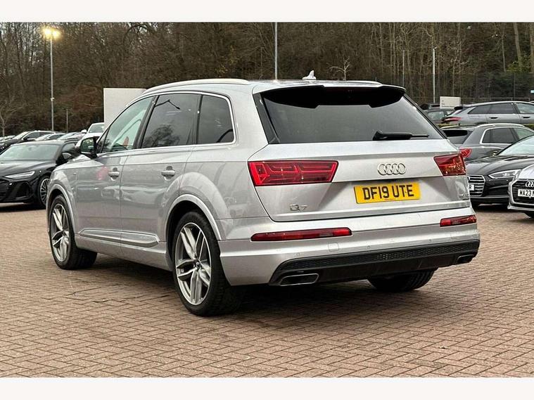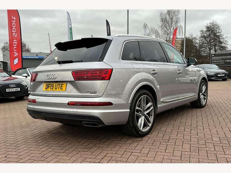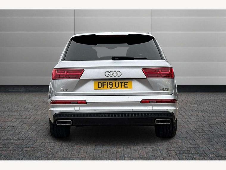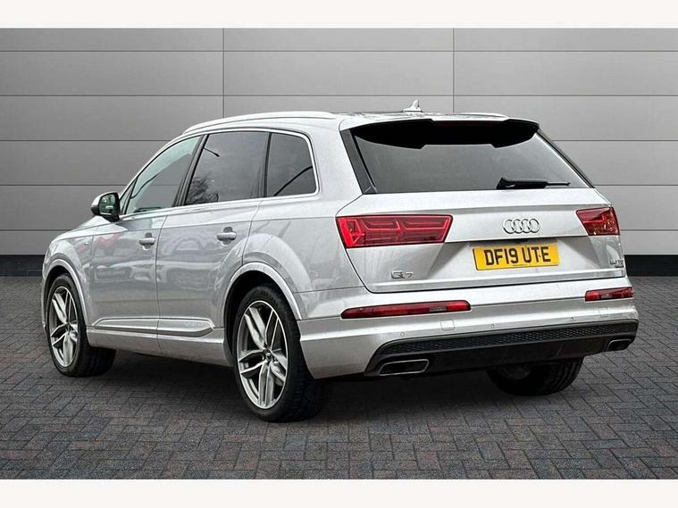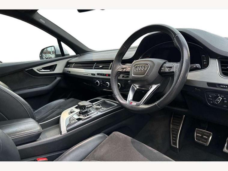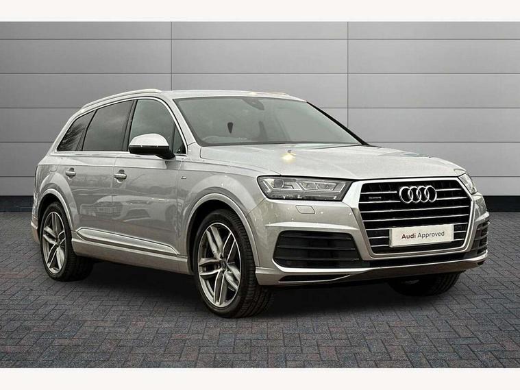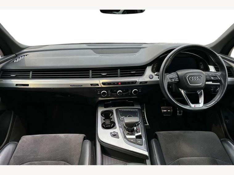 8.3" central fold-down colour display with high-resolution graphics, Audi connect safety and service (e-call), Audi drive select, Audi phone box with wireless charging, Audi smartphone interface, Audi virtual cockpit - 12.3" high-resolution LCD display with fully customisable instrument cluster, Colour driver's information system display, MMI - Multi Media Interface control system, MMI navigation plus with MMI touch, Mobile phone preparation with bluetooth interface, Power tailgate, Service interval indicator, Servotronic speed related PAS, Speed limiter, Start/Stop system with energy recuperation, Voice control system, Adaptive air suspension, 2 USB ports, 2x SD card slot, Audi music interface, Aux-in socket, DAB digital radio module, DVD System, MMI radio plus, Acoustic windscreen, Auto dimming rear view mirror, Electric front+rear windows, Electric/heated/folding door mirrors with memory, Green tinted heat insulating glass, Headlight washers, High beam assist, LED daytime running lights, Loading sill protector in stainless steel, Platinum grey front lip spoiler, Privacy glass, Rain and light sensors, Rear wiper, Roof spoiler, S Line badge on wings, S Line body styling, S Line front and rear bumpers, 2 cupholders in front centre console, 35/30/35 split fold 2nd row seats, Door sill trims with S line logo, Electric 3rd row 50/50 split/fold, Front ashtray and cigar lighter, Front centre comfort armrest with storage + cupholders, Front head restraints, Front/rear floor mats, Gearshift paddles, ISOFIX child seat mounting for 6 passenger seats with front passenger airbag deactivation includes top tether, Leather gear knob, Luggage compartment cover, Rear centre armrest with 2 cupholders, Rear headrests, Stainless steel pedals, Sunvisors with illuminated vanity mirrors, Interior light pack - Q7, 3 point seatbelts on all seats, ABS+Electronic Brake force Distribution, Curtain airbags, Driver and passenger airbags, EDL + ASR, Electrically operated child locks on rear doors, Electromechanical parking brake, Electronic stability control, Front side airbags, Hill descent control, Hill hold assist, Seatbelt warning, Traction control, Tyre pressure loss indicator, Warning triangle and first aid kit, Anti theft alarm, Anti-theft wheel bolts, Immobiliser, Keyless Go access/ignition system, Remote central locking, Chrome door inserts, Tool kit, Tyre repair kit,