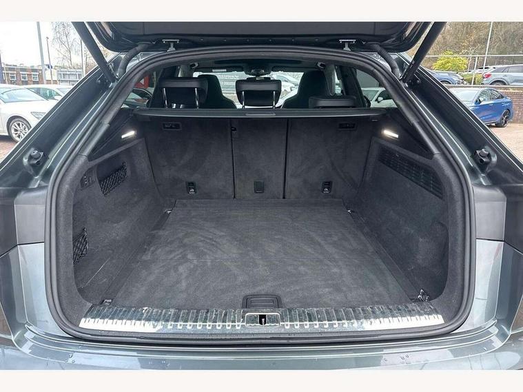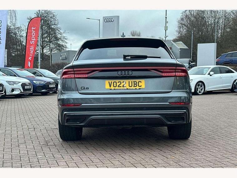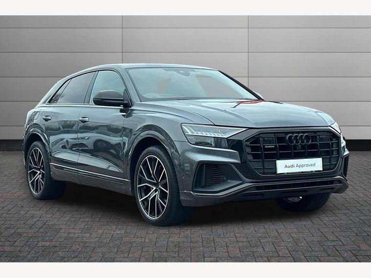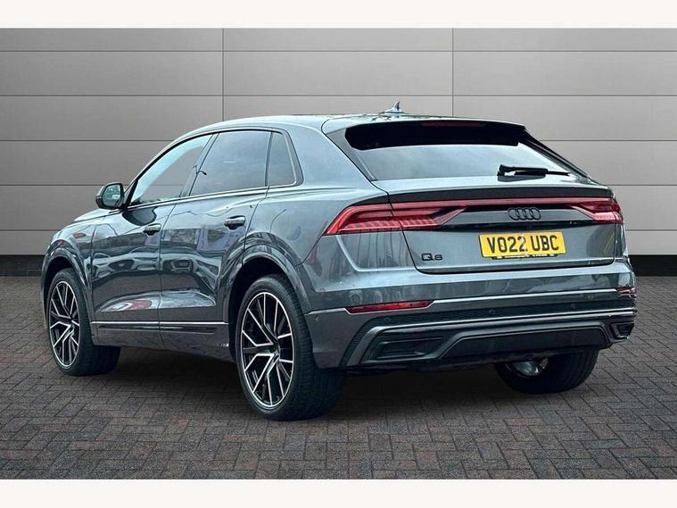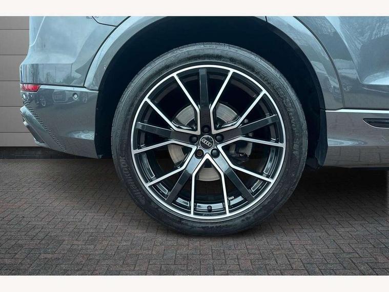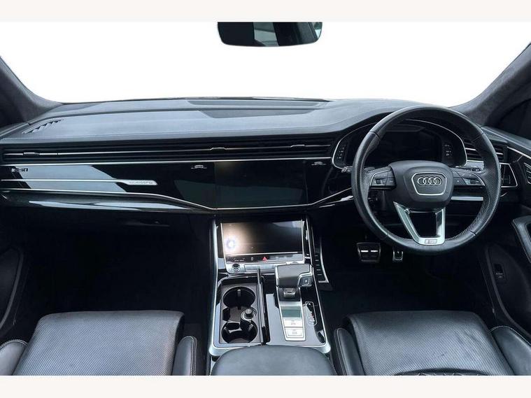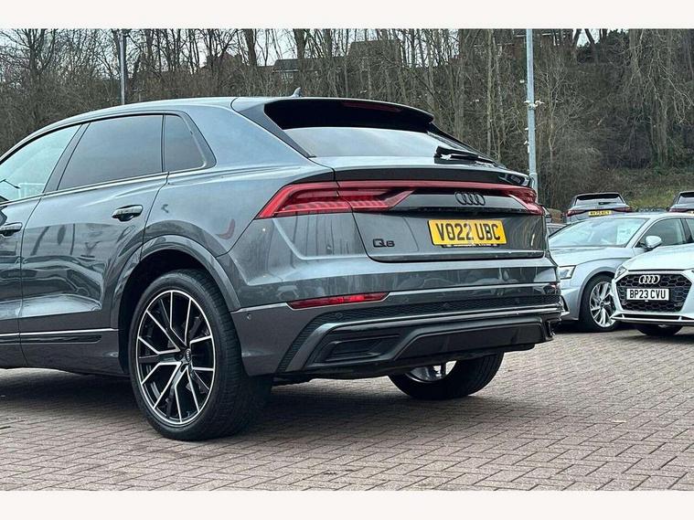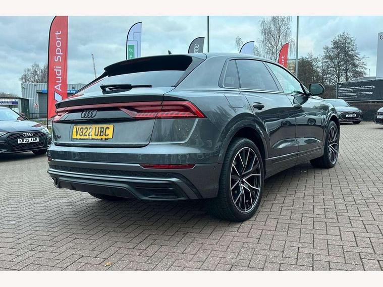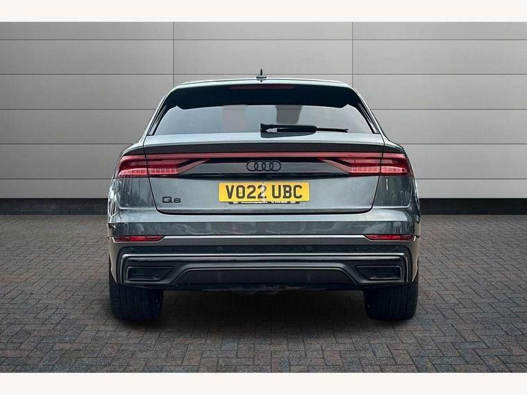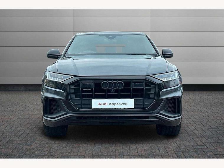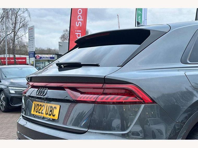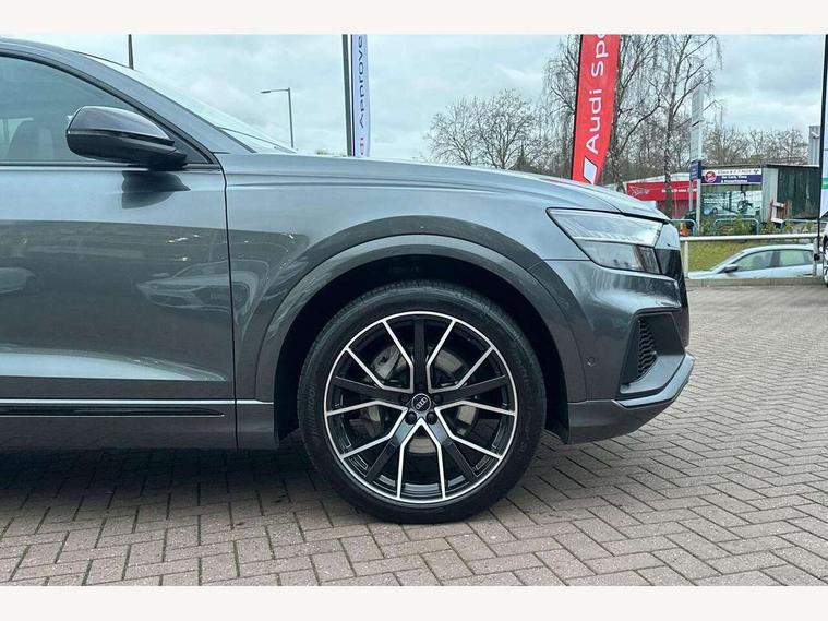 10.1" and 8.6" Dual colour touchscreens, 2 USB ports with charge and data functions in the rear, All wheel steering, Audi connect safety and service (e-call), Audi connect with Amazon Alexa Integration, Audi drive select, Audi smartphone interface includes wireless Apple carplay/Android Auto, Audi virtual cockpit plus, Automatic start/stop system, Electro-mechanical PAS, Head up Display, Low washer fluid indicator, MMI - Multi Media Interface control system, MMI navigation plus with MMI touch, Natural voice recognition, On board computer, Operating buttons in black, glass look with haptic feedback, Power door closure, Power operated tailgate, Service interval indicator, 48V Mild hybrid technology, 85 litre fuel tank, Adaptive sport air suspension, Quattro all wheel drive with self locking centre differential, Audi music interface with 2 USB ports with charge and data functions, Aux-in socket, DAB Digital radio, 3rd brake light, Acoustic windscreen, Adaptive windscreen wipers with integrated washer jets, Audi Beam uses LEDs to project Vorsprung logo, Audi HD Matrix LED headlights with dynamic front and rear indicators, Auto dimming frameless rear view mirror, Coming/leaving home lighting function, Electric front+rear windows, Electric panoramic glass sunroof, Electrically folding auto dimming/adjustable/heated door mirrors with memory function, LED side indicators and kerb view function for passenger side, Gloss black finish for exterior Audi rings and Q8 logo without engine badging, Headlight washers, Heat insulating glass in windshield, LED signature daytime running lights, Platinum grey front spoiler lip and diffuser insert, Privacy glass - dark tinted rear and rear side windows from B-pillar backwards, Rain and light sensors, Rear side wing doors, Rear wiper, 4 zone deluxe automatic climate control, 4-way lumbar support for front seats, 40:20:40 split folding rear seat, Black Alcantara headlining, Comfort front centre armrest, Double sun visor with illuminated vanity mirror on driver and passenger side extendable, Driver and front passenger seat memory function for electrically adjustable front seats, Electric sunblind for the rear side windows and manual sunblind for the rear window, Front head restraints, Front/rear floor mats, Heated front and outer rear seats, ISOFIX child seat mounting for front passenger seat and 2 outer rear seats with top tether child seat mounting for all 3 rear seats, Luggage compartment sill protection in stainless steel, Massage and ventilation function for front seats, Rear centre armrest with 2 cupholders, Rear headrests, Rear seat bench plus, Single front passenger seat, Stainless steel pedals, Tool kit, City assist pack - Q8, Comfort and Sound pack - Q8, Extended leather pack - Q8, Titanium Black Styling Pack - Q8, Tour pack - Q8, 3 point seatbelts on all seats, Audi pre sense front, Child locks on rear doors, Driver and front passenger, front side and curtain airbags, Electromechanical parking brake, Electronic Stability Control (ESC) including ABS, ASR and EDL, Front passenger airbag deactivation, Hill descent control, Hill hold assist, Predictive pedestrian protection, Seatbelt monitoring, Traction control, Tyre pressure loss indicator, Warning triangle and first aid kit, Anti theft alarm with tow away protection, Anti-theft wheel bolts and wheel loosening detection, Immobiliser, Keyless go with remote central locking, Polished oak trim with grey finished, Tyre repair kit,