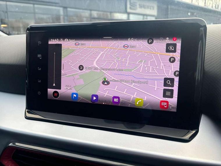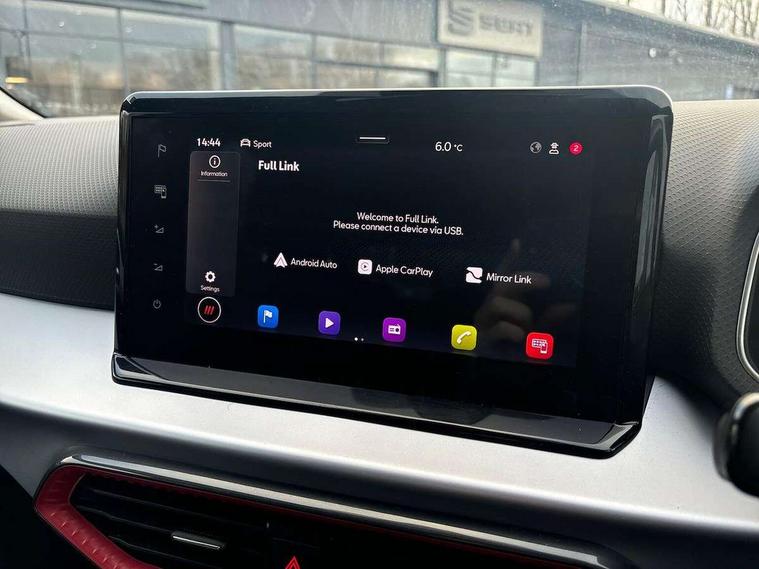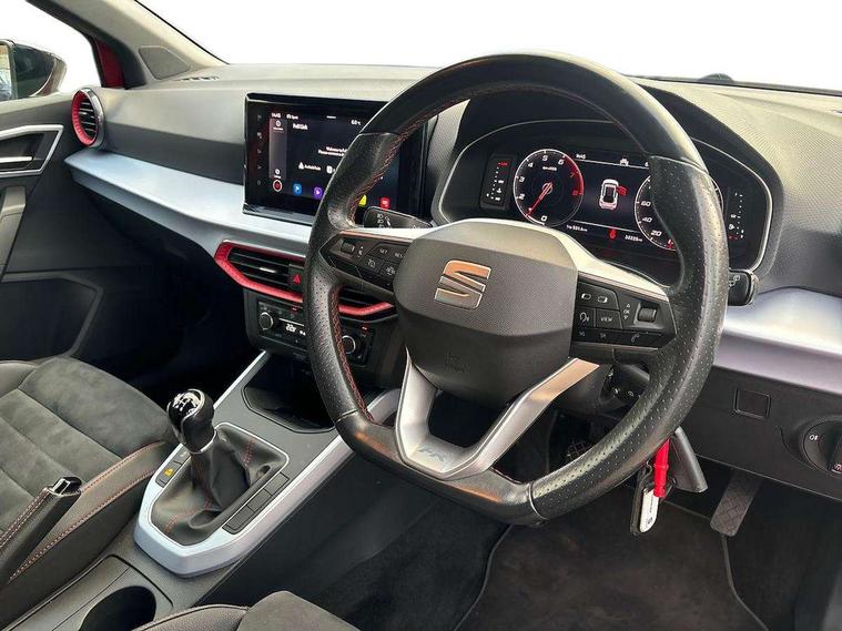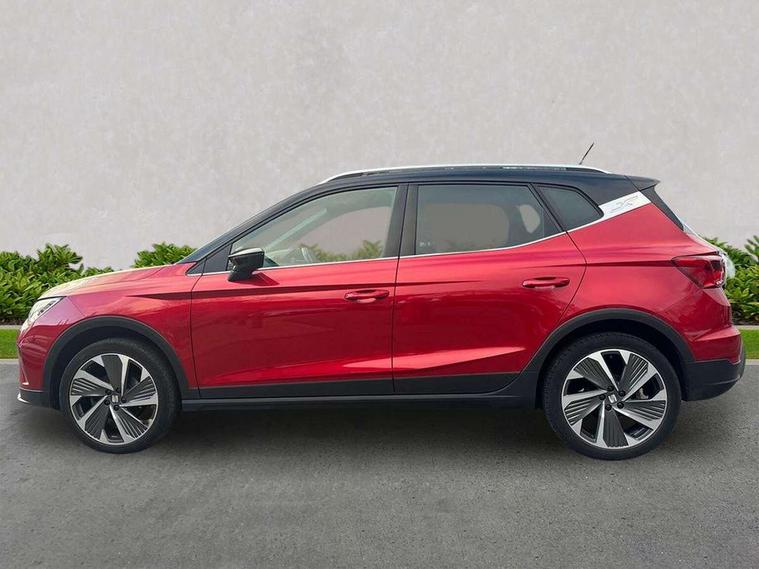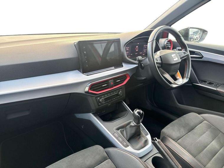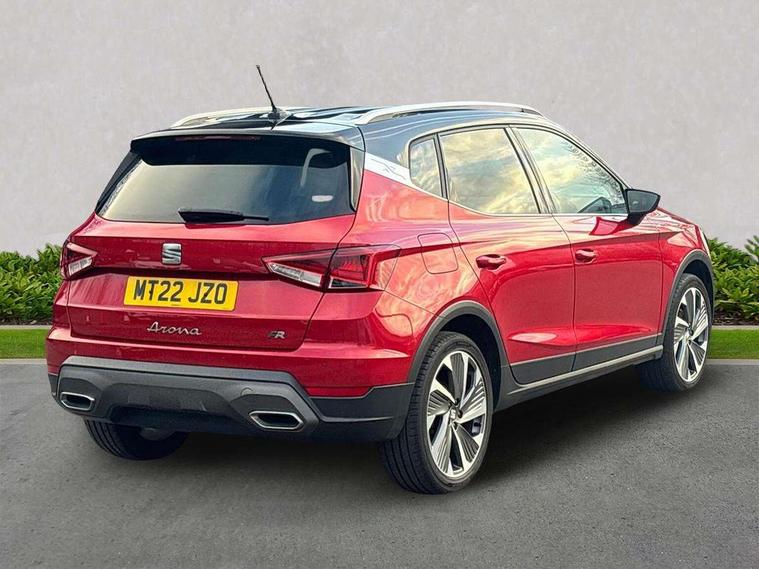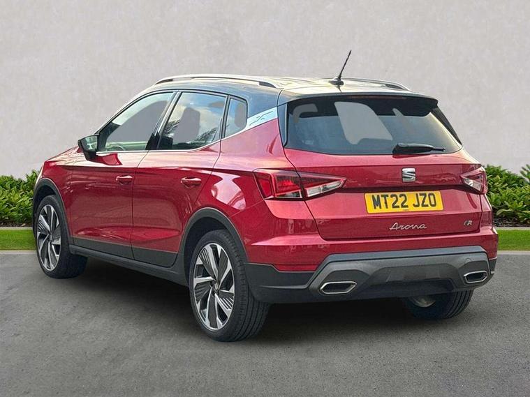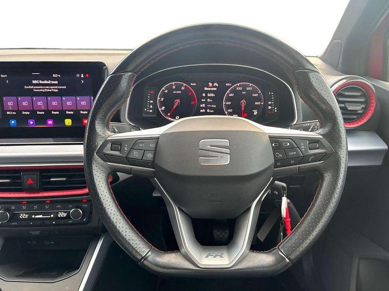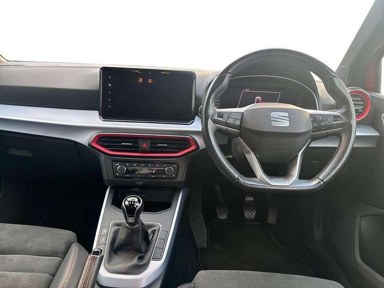 Digital cockpit, E-call, Electric speed sensitive power steering, Full Link Smartphone Integration with Mirror Link, Apple Car Play, Google Android Auto with USB Type C cable for Apple and Android compatibility, Lane keeping system, Rear parking sensor, Seat connect with safety, service, remote and online, SEAT Drive profile - Four different models normal-sport-eco-individual, steering response, throttle response, Bluetooth interface for hands free and audio streaming, DAB digital radio and AM/FM radio, Steering wheel mounted audio controls, Anti theft roof antenna, Auto dimming interior rear view mirror, Automatic activation of hazard warning lights, Body coloured bumpers, Body coloured door handle inserts, Chrome roof rails and window surrounds, Chrome window trim, Dark tinted rear windows, Electric front/rear windows, Electrically adjustable, heated and folding door mirrors, FULL LED automatic headlights with dynamic headlight range control, coming and leaving home, LED daytime running lights, LED rear tail lights and licence plate lights, Protective side mouldings, Rain sensing wipers, Rear side wing doors, Rear spoiler, Rear window wash/wipe, Roof colour door mirrors, Third brake light, Twin exhaust pipe styling hidden exhaust pipe, Visible VIN plate, Windshield wiper with intermittent control and potentiometer, 2 cupholders, 3 seat bench in 2nd row, 60/40 split folding rear seat, Aircare filter, Black interior roof, Double boot floor, Driver sunvisor with covered mirror + card holder, Dual zone climate control, Front courtesy light with 2x front and 2x rear reading lights, Front seat back storage pockets, Front sport seats, Heated front seats, Height adjustable front seats, Height/reach adjustable steering column, Illuminated boot, Interior ambient lighting, Interior light in footwell, central console and door panel, ISOFIX points in outer rear seats with top tether anchorage points, Microsuede cloth upholstery, Passenger sunvisor with vanity mirror, Perforated flat bottomed leather steering wheel/gear knob/handbrake with red stitching and FR logo, Single front passenger seat, Two front and three rear height adjustable headrests, Connectivity pack plus - Arona, Interior chrome pack - Arona, 3 point seatbelts on all rear seats, ABS, Active front headrests, Child locks on rear doors, Driver and front passenger airbags with front passenger airbag de activation, front side and curtain airbags, Electronic stability control, Emergency Brake Assist (EBA) and front assist, Front and rear seatbelt reminder, Hill hold control, Multi-Collision braking, Tiredness recognition system, Traction control, Tyre pressure monitoring system, Alarm with back-up horn, Electronic engine immobiliser, Locking wheel bolts, Remote central locking + deadlocks, Tow away protection, Titan black dashboard, 18" Performance Cosmo grey matt alloy wheels,