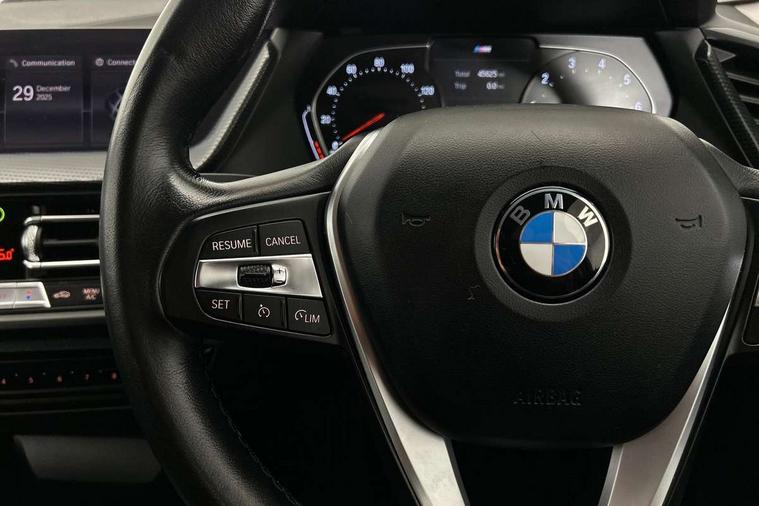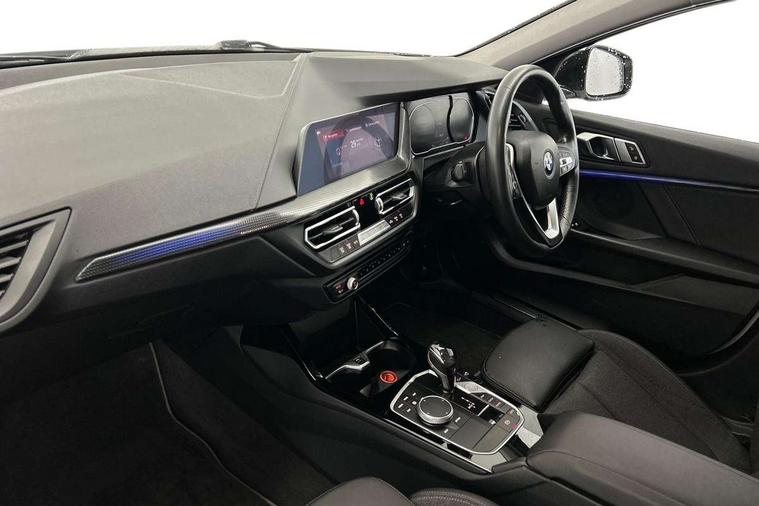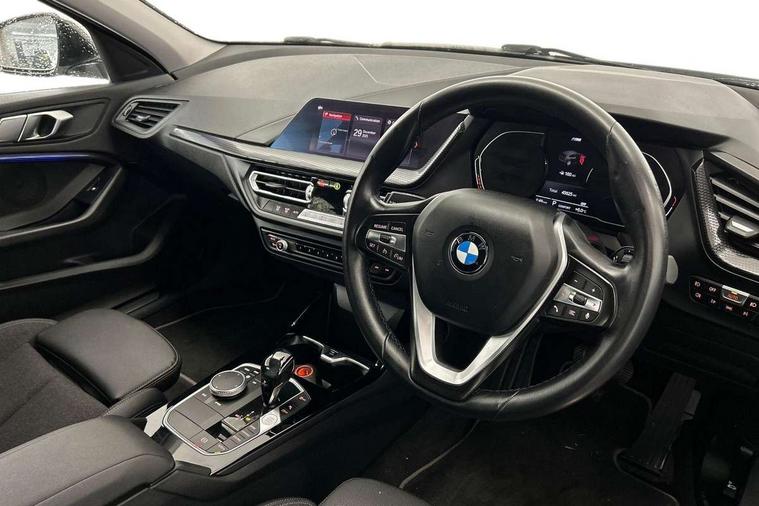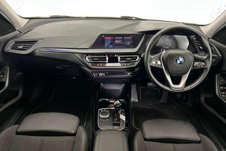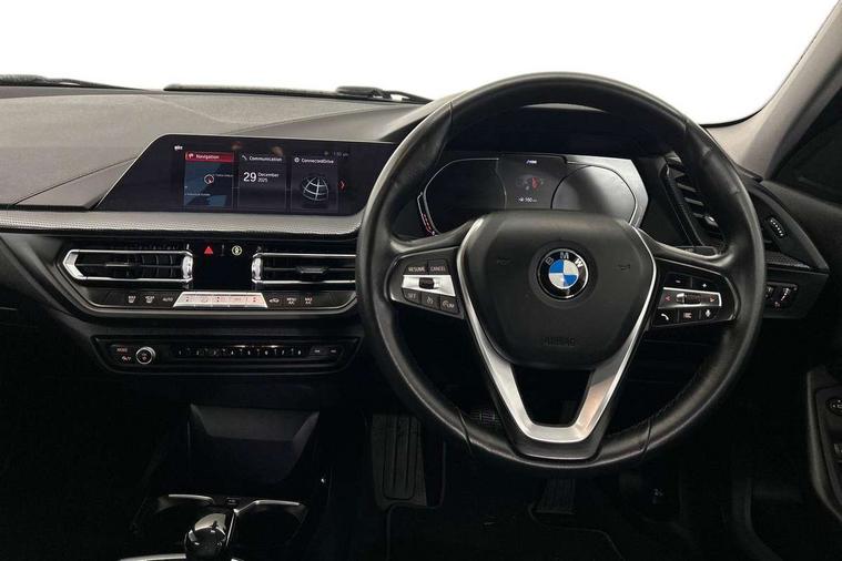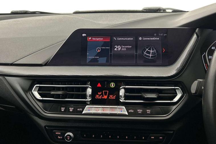 Active guard plus, Attentiveness assist, BMW Online services, BMW Teleservices, Check Control warning system for monitoring of lights and door/luggage compartment open warning, Connected eDrive Services, Eco pro mode, Electric power steering with Servotronic steering optimised at all speed ranges, Integrated owners handbook, Oil sensor for level and grade, On board computer, Optimum shift indicator, Personal Profile, Pull away assistant, Speed limiter, Aluminium lightweight construction, Anti roll bar front and rear, Balancer shaft, Double VANOS, Drive Performance Control, Electronic differential lock, High precision injection, Petrol Particulate Filter, VALVETRONIC engine management, Bluetooth audio streaming, DAB Digital radio, Auto dimming rear view mirror, Body colour door handles, Body colour mirror caps, Chrome exhaust tailpipe in single, round (Exhaust tailpipe, stainless steel - single, round), Chrome kidney grille with extra wide black, high gloss black vertical slats, Direction indicator side lights in exterior mirrors, Fading support, Follow me home headlights, Front and rear electric windows with open and close fingertip control, anti trap facility and comfort closing, Front bumper in Body colour with exclusive Sport air inlets finished in High gloss Black, Front door sill finishers in black plastic with BMW designation, Green tinted heat protection glazing, Heated, electrically adjustable exterior mirror aspheric on driver side, convex on passenger side, High gloss shadow line exterior trim, High level third brake light, LED daytime running lights, LED eyebrow turn indicators, LED front fog lights, Lightweight engineering, Manual headlight beam throw control, Matt black air guide grilles, Matt black roof moulding, B pillar finisher and wheel arch trim, Matt black window frame, Model designation on right side of tailgate, Nearside reverse light in rear light cluster, Rain sensor including auto headlights activation, Rear bumper in Body colour with exclusive Sport design elements finished in High gloss Black, Rear fog lights, Rear window wiper, Shark fin antenna, Visible VIN plate, Welcome lighting, Windscreen wipers with integrated washing jets, 12V power socket in centre console, 2 cupholders in front centre console, 3 rear seat head restraints, 3 spoke sports leather steering wheel in pearl Chrome, Child seat ISOFIX attachment for two outer rear seats and front passenger seat with anchorage points, Conditioned based service, Driver side folding compartment in instrument panel, Folding rear clothes hook, Folding rear seats, Four grab handles integrated in roof lining, Front and rear door pockets, Front and rear side armrest integrated into door trim, Front armrest foldable with integrated storage compartment, Front sports seats with electric side bolster adjustment, Glove compartment, Height adjustable front head restraints, Manual adjust steering wheel, Multi-function controls for steering wheel, Rear seat backrest with manual 60:40 split folding with 3 top tether clips integrated on rear of seat panels, Storage compartment in centre console, Sun visors with vanity mirrors and insert tab, Two zone automatic air conditioning, Velour floor mats, Extended storage pack - 1 Series, Interior lights pack - 1 Series, 2 tone horn, 3 point seatbelts on all seats, front pyrotechnic belt tensioners, stopper and belt force limiters, rear coded belt buckles, Airbags - Front driver and passenger, front and rear head, front side, curtain head protection, Anti lock braking system (ABS) with brake assist, BMW emergency call, Brake drying, Braking readiness, Crash sensor activating central locking release, hazard warning lights, fuel cut off, interior lighting + activation of safety battery terminal clamp, Driver and front passenger seat belt security check, Dynamic stability control + (DSC+), Dynamic Traction Control - DTC, Electrically operated hand brake, Front and rear disc brakes, Front passenger manual airbag deactivation, Rear child proof door locks, Seatbelt warning, Side impact protection, Tyre pressure monitoring system, Warning triangle and first aid kit, Automatic drive away locking facility, Central locking switch for all doors, fuel filler cap and luggage compartment, Deadlocking function system to all doors, Locking wheel bolts, Remote central locking with two Integrate key, one button for opening and closing all lock, open and close window, button for open luggage compartment, Start/stop button with comfort go keyless engine start and auto start stop deactivation button, Thatcham Cat.1 alarm and immobiliser, Contrast stitching on instrument panel, Illuminated Berlin interior trim, Reduced rolling resistance tyres,