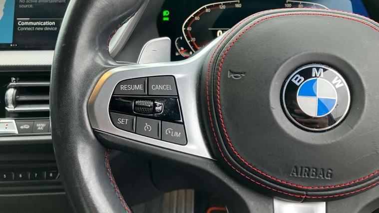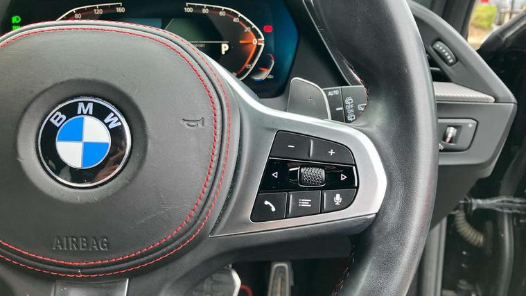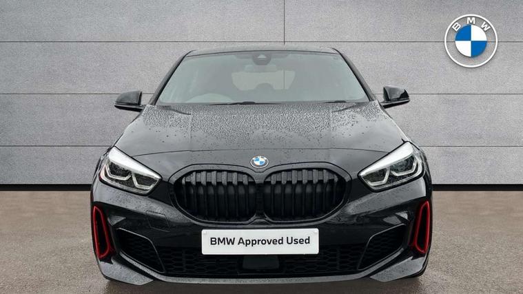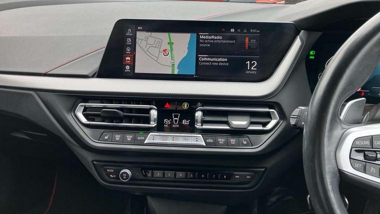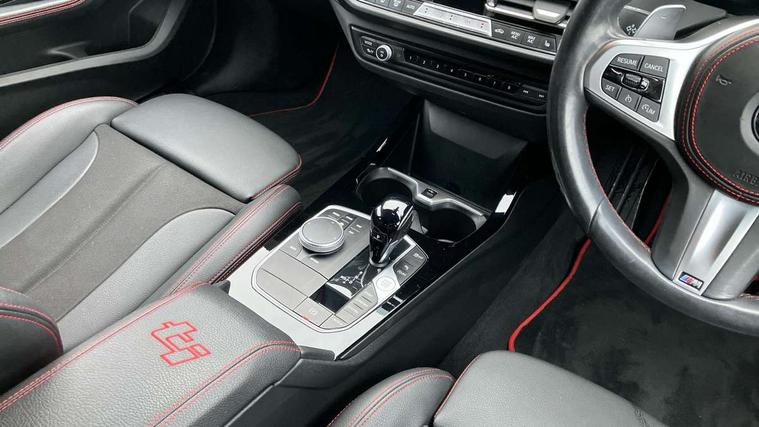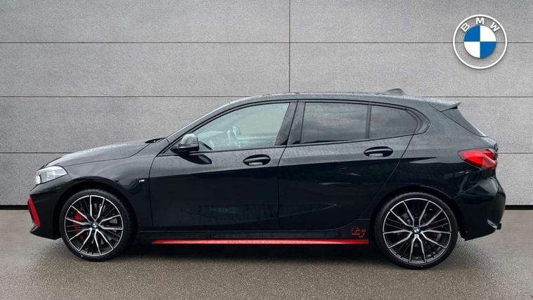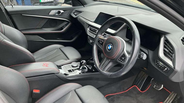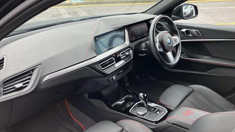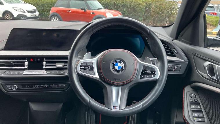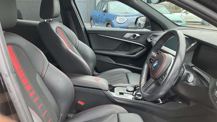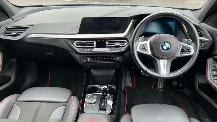 Active guard plus, Attentiveness assist, BMW ConnectedDrive online services, BMW Teleservices, Check Control warning system for monitoring of lights and door/luggage compartment open warning, Cruise control with brake assist, Eco pro mode, Electric power steering with Servotronic steering optimised at all speed ranges, Front axle single joint with specific axle kinematics to minimise drive influences on steering + provide increased rigidity agile driving behaviour, Integrated owners handbook, Lane departure warning system, Oil sensor for level and grade, On board computer, Optimum shift indicator, Personal Profile, Pull away assistant, Rigidly mounted rear subframe - Multi link construction with separate spring / damper configuration and excellent driving characteristics, Speed limit Info including no-overtaking indicator, Speed limiter, Aluminium lightweight construction, Anti roll bar front and rear, Balancer shaft, Double VANOS twin scroll turbocharging system, Drive Performance Control, Eight speed sport automatic transmission with gearshift paddle switches, Electronic differential lock, High precision injection, Larger fuel tank capacity (50 litres), M sport suspension with M128i xDrive specific settings, Petrol Particulate Filter, Twin tube gas filled shock absorbers with degressive characteristic curve, VALVETRONIC engine management, DAB Digital radio, Auto dimming rear view mirror, Automatic headlight beam throw control, Automatic windscreen wipers and automatic headlight, Black chrome tailpipe finishers, BMW individual high gloss shadow line with extended content, Body colour door handles, Body colour mirror caps, Body colour roof trims, Chrome 'M' logo side designation, Chrome kidney grille frame with Satin Aluminium struts, Direction indicator side lights in exterior mirrors, Fading support, Folding side mirrors with auto dimming/folding wing mirrors with auto dimming, Follow me home headlights, Front and rear bumper system with replaceable deformation elements, Front and rear electric windows with open and close fingertip control, anti trap facility and comfort closing, Front door sill finishers in black plastic with M designation in metallic look, Green tinted heat protection glazing, Heated, electrically adjustable exterior mirror aspheric on driver side, convex on passenger side, High gloss shadowline window frame, Recess cover mirror frames and B/C pillar embelisher trim, High level third brake light, Integrated front windscreen with washer jets, Kidney frame and struts in high gloss black extended, LED daytime running lights, LED eyebrow turn indicators, LED front fog lights, LED Headlights, Lightweight engineering, Matt black air guide grilles, Matt black wheel arch trim, Model designation on electric bootlid, Nearside reverse light in rear light cluster, Preparation for high beam assistant, Rear fog lights, Rear side wing doors, Rear window wiper, Shark fin antenna, Trailer stabilisation logic, Visible VIN plate, Welcome lighting, 12V power socket in front centre console with blanking plug, 3 rear seat head restraints, 3 seat bench in 2nd row, Anthracite headlining, Black boot net with lashing eyes, Cargo function on 2nd seat row, Centre armrest in black/red highlight including embroidered 'ti' designation in red, Child seat ISOFIX attachment for two outer rear seats and front passenger seat with anchorage points, Conditioned based service, Driver and front passenger seat heating, Floor mats with red binding, Folding rear clothes hook, Four grab handles integrated in roof lining, Front and rear door pockets with bottle holders, Front and rear side armrest integrated into door trim, Front armrest, Front sports seats, Glove compartment, Height adjustable front head restraints, Instrument panel top section , door armrests and door panels in black/red highlight, Luggage compartment for bag hooks on left and right, foldable luggage compartment liner and four lashing eyelets, Manual adjust steering wheel, Multi-function controls for steering wheel, Single front passenger seat, Storage compartment in centre console, Sun visors with vanity mirrors and insert tab, Three spoke M sport design multi function leather steering wheel in unique red stitching, Two front centre console cupholders, Two zone automatic air conditioning, Additional interior lighting pack - 1 Series, BMW live cockpit professional pack- 1 Series, Connected pack professional - 1 Series, Interior lights pack - 1 Series, M Sport exterior styling aerodynamics pack - 1 Series, 2 tone horn, 3 point seatbelts on all seats, front pyrotechnic belt tensioners, stopper and belt force limiters, rear coded belt buckles, Airbags - Front driver/passenger, front and rear curtain head protection, front side, manual deactivation of front passenger airbag, Anti lock braking system (ABS) with brake assist, BMW emergency call, Brake drying, Braking readiness, Child proof locking system in rear door, City braking function, Comfort modes, Cornering brake control, Crash sensor activating central locking release, hazard warning lights, fuel cut off, interior lighting + activation of safety battery terminal clamp, Driver and front passenger seat belt security check, Dynamic stability control + (DSC+), Dynamic Traction Control - DTC, Electrically operated hand brake including automatic hold function, Front and rear disc brakes, M Sport brakes with red calipers, M Sport seatbelts, Seatbelt warning, Side impact protection, Tyre pressure monitoring system, Warning triangle and first aid kit, Central locking switch for all doors, fuel filler cap and luggage compartment, Deadlocking function system to all doors, Drive away locking system on all doors and luggage compartment with de-activated in iDrive settings, Locking wheel bolts, Remote control with integrated key with High-gloss Black inlay and M designation and 1 button for open/ close lock, window, open luggage compartment, Start/stop button illuminated in centre console with keyless e
