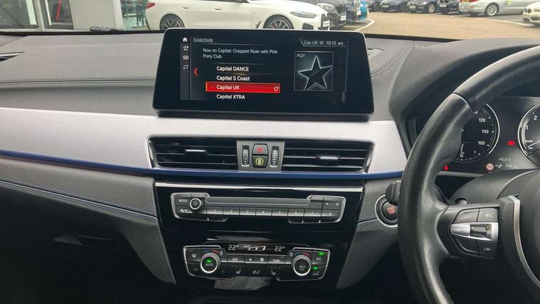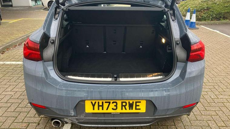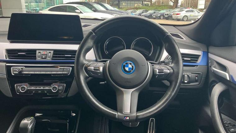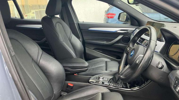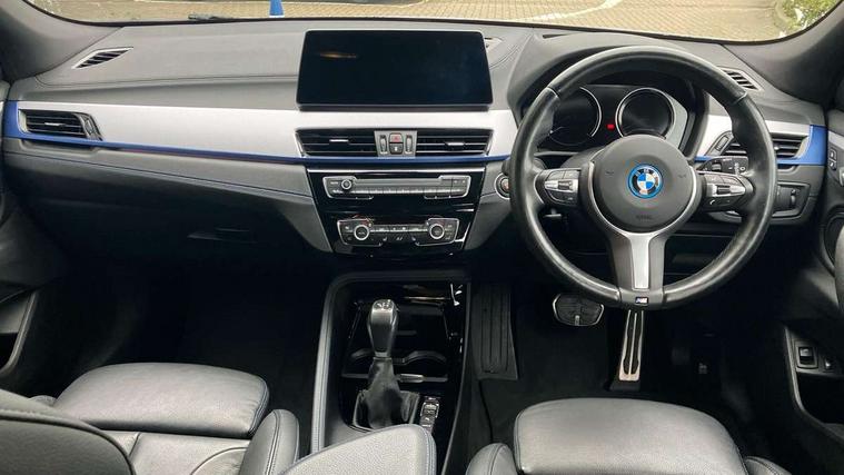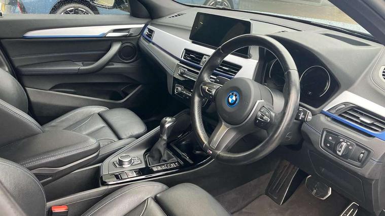 Active Guard incl approach control warning with city brake function and person warning with city brake function, Apple CarPlay preparation, Automatic powered electric bootlid, BMW ConnectedDrive online services, BMW Navigation system with 8.8" monitor, BMW Online services, BMW Teleservices, Brake pad wear indicator in front and rear, Check Control warning system for monitoring of lights and door/luggage compartment open warning, Connected eDrive Services, eDrive button activates auto eDrive, max eDrive and save battery modes, eDrive specific displays in instrument cluster and CID, Electric Power Steering (EPS) with Servotronic, Electro hydraulically controlled multi plate clutch in rear axle, Energy efficient operating strategy, Front axle single joint with specific axle kinematics to minimise drive influences on steering + provide increased rigidity agile driving behaviour, Instrument cluster with black optic and 5.7" colour display + speedometer + tachometer + fuel gauge + instant fuel economy, Integrated owners handbook, Lights on warning by audio warning signal when ignition is switched off, On board computer - average speed+fuel consumption, service interval, clock/date, odometer/trip meter, outside temperature display and ice warning, Operation by iDrive with direct selection buttons and 8 programmable buttons, Optimum shift indicator, Park assist system, Personal Profile, Real time traffic information, TMC for lifetime of vehicle, Variable and stepless distribution of drive torque between front and rear axle, 12V compressor with integrated sealant injection bottle and hose, 2.4kW AC charging with 5m cable, AC Fast Charging, Aluminium lightweight construction including crankcase, Anti roll bar front and rear, Automatic transmission, Balancer shaft, Double VANOS, Drive performance control with ECO PRO comfort + sport mode, eDrive exterior sound, Electric engine installed under rear seats driving the rear wheels, Electronic differential lock, High precision injection, Lithium-ion high voltage battery (10.0 kWh) fitted under rear seats, Performance Control, Transmission of power to rear axle via front axle differential and two-part cardan shaft, Twin tube gas filled shock absorbers with degressive characteristic curve, xDrive electric drive, after activation of the electric motor and common drive via all four wheels, 6 Speaker Loudspeaker system, Bluetooth audio streaming, BMW professional radio, DAB Digital radio, Steering wheel mounted audio/telephone controls, Adjustable headlights, Aero curtain, Automatic windscreen wipers and automatic headlight, Automatically dimming rear view mirror, BMW badge on bonnet, tailgate with integrated tailgate release and C pillars, Body colour door handles, Body colour mirror caps, Body colour roof trims, Chrome kidney grille with black vertical slats, Clear lenses direction indicator lights, Dark shadow front air intakes, Daytime running lights, Differentiation of xEV Vehicles - Blue ring around BMW roundel on wheel hub/tailgate/bonnet/c-pillar/steering wheel and side panel inscription, Direction indicator side lights integrated in exterior mirrors using LED technology, Door mirror integrated indicators, Dynamic brake lights, Electric folding exterior mirrors with anti-dazzle, Electrically adjustable and heated door mirrors glass aspheric on driver's side and convex on passenger side, Engine designation on electric bootlid - right, Fingertip control / anti-trap function on electric window, Front and rear bumper system, Front and rear electric windows, Green tinted heat protection glazing, Heated windscreen washer jets, High gloss black front side air intake with matt black insert, High gloss black in window frame, recess covers and B-Pillar trim, High gloss shadowline in window frame, recess covers, mirror frame and B-Pillar/C- pillar trim, High level third brake light, M logo designation in side chrome, M Sport spoiler, Model designation in left tailgate, Rear fog lights, Rear side wing doors, Rear tail lights with LED technology and 3D design, Rear window aerial, Rear window wiper with wash/wipe function, Reversing light in rear light cluster, Shark fin antenna, Single exhaust tailpipes with chrome finishers 90mm in left, Visible VIN plate, Welcome lighting, 2 cupholders in front centre console, 3 Spoke M sport nappa leather multifunction steering wheel, 40:20:40 manually split folding rear seat with two tilt positions for backrest, Anthracite headlining, Armrest in centre section of rear seat backrest and folding, Automatic two zone climate control air conditioning, Child seat ISOFIX attachment for two outer rear seats and front passenger seat with anchorage points, Conditioned based service, Contrast stitching on centre console and mid section of dashboard to match upholstery seam, Driver and front passenger seat heating, Driver/passenger sunvisors with ticket holders, Floor mats with black surround and M flag detail on front mats, Front and rear door armrests, Front armrest, Front axle always driven, Front door sill finishers with M designation, Front head restraints, Front sports seats, Illuminated charging socket with visual display of charge status, Interior light in front centre interior mirrors and rear centre auto interior light activation when door is opened when ignition switched off, Luggage compartment lighting, Luggage compartment loading edge with stainless steel insert, Luggage compartment with underfloor storage and four lashing eyes, Pre-conditioning of battery for optimum operating temperature, Pre-conditioning of interior via BMW Remote app or setting time within iDrive menu, Rake/reach adjustable steering wheel, Single front passenger seat, Three rear headrests, Additional interior lighting pack - X2, Extended storage pack - X2, M Sport aerodynamic pack - X2, 3 point seatbelts on all seats, front pyrotechnic belt tensioners, stopper and belt force limiters, rear coded belt buckles, Airbags - Front driver and passenger, front 